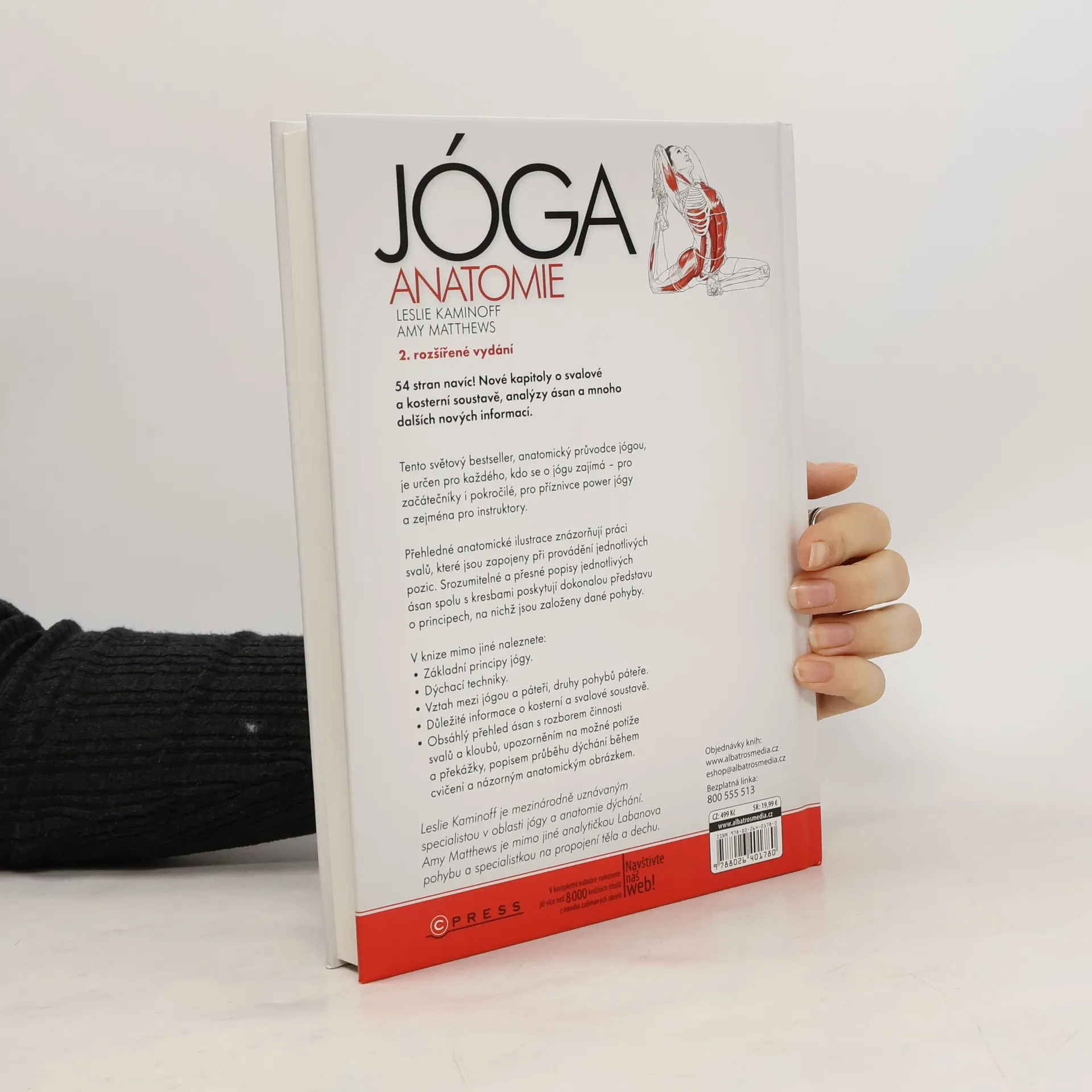 Názorná ilustrovaná publikace určená jak zájemcům o cvičení jógy, tak instruktorům a lektorům. Laické veřejnosti přiblíží význam jógy a její blahodárné působení na svalové skupiny, instruktorům pomůže v jejich práci: kniha představuje jednotlivé pozice - asány - a jejich vliv na svaly, zapojené při provádění daných cviků, s přesnými popisy svalů přímo v ilustraci a srozumitelným slovním vysvětlením. Tento světový bestseller, anatomický průvodce jógou, je určen pro každého, kdo se o jógu zajímá pro začátečníky i pokročilé, pro příznivce power jógy a zejména pro instruktory. Přehledné anatomické ilustrace znázorňují práci svalů, které jsou zapojeny při provádění jednotlivých pozic. Srozumitelné a přesné popisy jednotlivých ásan spolu s kresbami poskytují dokonalou představu o principech, na nichž jsou založeny dané pohyby. V knize mimo jiné naleznete: Základní principy jógy. Dýchací techniky. Vztah mezi jógou a páteří, druhy pohybů páteře. Obsáhlý přehled ásan s rozborem činnosti svalů a kloubů, upozorněním na možné potíže a překážky, popisem průběhu dýchání během cvičení a názorným anatomickým obrázkem. Autor Leslie Kaminoff je mezinárodně uznávaným specialistou v oblasti jógy a anatomie dýchání. Bydlí v USA a pracuje v New Yorku.