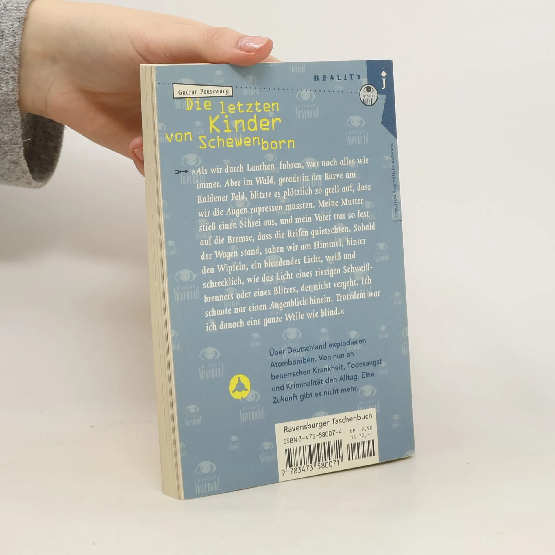 Über Deutschland explodiert eine Atombombe, und von diesem Moment an bestimmen Krankheit, Todesangst und Kriminalität den Alltag. Eine Zukunft scheint unmöglich. Gudrun Pausewang entwirft ein erschütterndes fiktives Szenario, das zum Nachdenken anregt. Die Autorin wurde 2017 mit dem Sonderpreis des Deutschen Jugendliteraturpreises für ihr Gesamtwerk ausgezeichnet. Ein Auszug aus „DIE LETZTEN KINDER VON SCHEWENBORN“ beschreibt eine Fahrt auf der Kasseler Autobahn bis Alsfeld, wo die Familie in den Vogelsberg abbiegt. An einem idealen Julitag beginnt der Vater zu singen, und die Familie stimmt ein. Während sie durch Lanthen fahren, scheint alles normal zu sein. Doch im Wald zwischen Lanthen und Wietig blitzt es plötzlich grell auf. Die Mutter schreit, der Vater bremst abrupt, und der Wagen gerät ins Schleudern. Als sie schließlich stehenbleiben, sehen sie am Himmel ein blendendes Licht, das an einen riesigen Schweißbrenner oder einen unvergänglichen Blitz erinnert. Der Blick auf dieses Licht führt dazu, dass die Protagonistin für eine Weile blind ist.