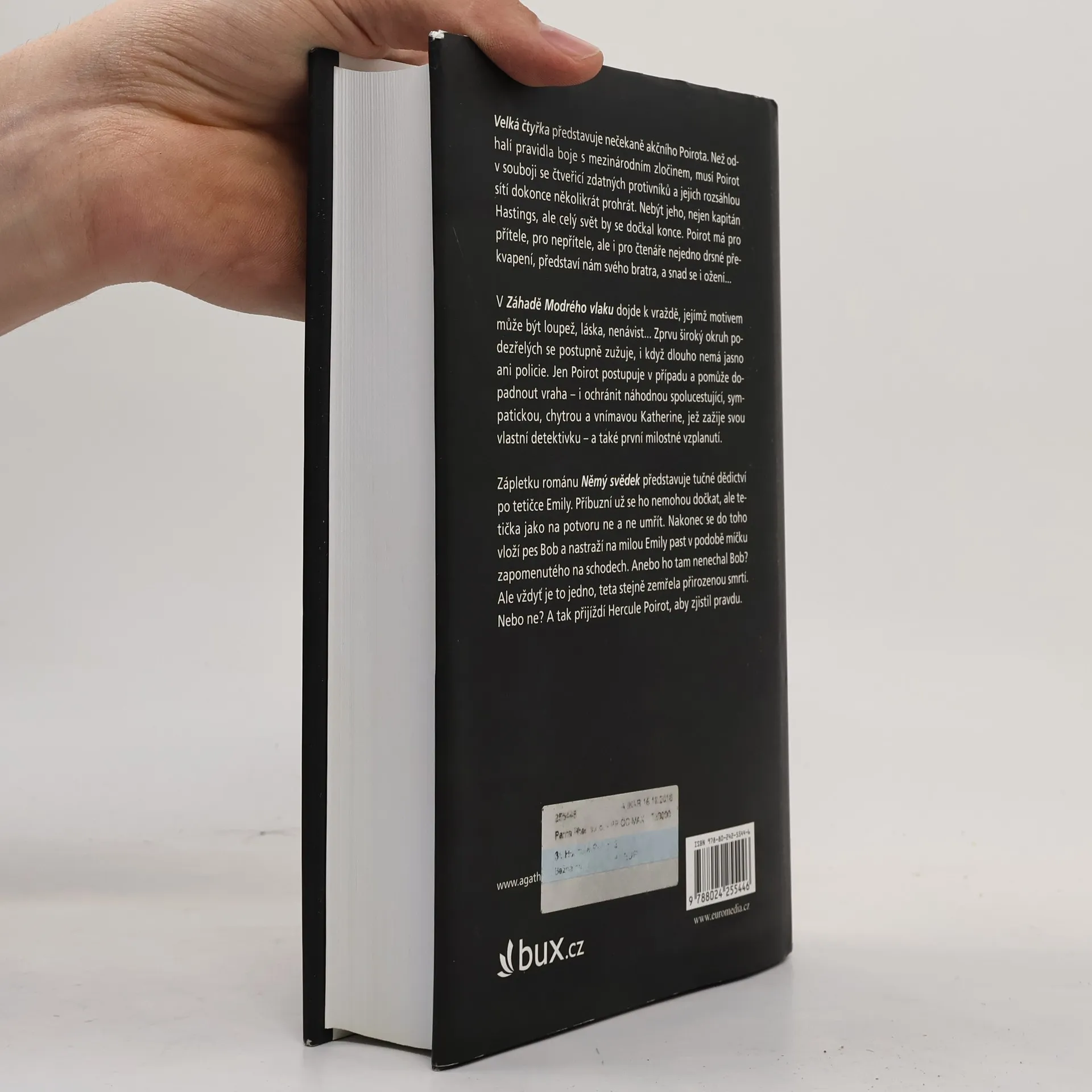Další trojice napínavých případů pro malé šedé buňky belgického detektiva Hercula Poirota. Velká čtyřka, špionážní román z roku 1927, představuje nečekaně akčního Poirota. Než odhalí pravidla boje s mezinárodním zločinem, musí Poirot v souboji se čtveřicí zdatných protivníků a jejich rozsáhlou mezinárodní sítí dokonce několikrát prohrát. Nebýt jeho, nejen kapitán Hastings, ale celý svět by se dočkal konce. Poirot má pro přítele, pro nepřítele, ale i pro čtenáře nejedno drsné překvapení, představí nám svého bratra, a snad se i ožení… V Záhadě Modrého vlaku (1928) dojde k vraždě, jejímž motivem může být loupež, láska, nenávist… Zprvu široký okruh podezřelých se postupně zužuje, i když dlouho nemá jasno ani policie. Jen Poirot postupuje v případu a odhaluje falešné existence, falešné city i pokřivené vztahy. Pomůže dopadnout vraha – i ochránit náhodnou spolucestující, sympatickou, chytrou a vnímavou Katherine, jež zažije svou vlastní detektivku – a také první milostné vzplanutí. Tučné dědictví po tetičce Emily – to je zápletka románu Němý svědek z roku 1937. Příbuzní už se nemohou dočkat peněz, ale tetička jako na potvoru ne a ne umřít. Nakonec se do toho vloží pes Bob a nastraží na milou Emily past v podobě míčku zapomenutého na schodech. Anebo ho tam nenechal Bob? A byl to vůbec míček? Ale vždyť je to jedno, teta nakonec stejně zemřela přirozenou smrtí. Nebo ne? A tak přijíždí Hercule Poirot, aby zjistil pravdu.