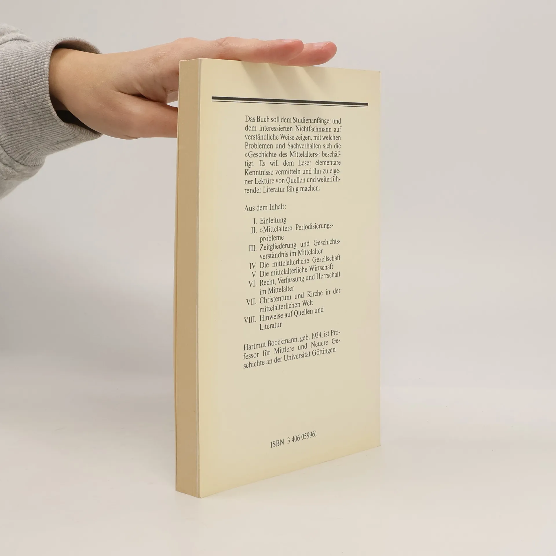 Das Buch soll dem Studienanfänger und dem interessierten Nichtfachmann auf verständliche Weise zeigen, mit welchen Problemen und Sachverhalten sich die "Geschichte des Mittelalters" beschäftigt. Es will dem Leser elementare Kenntnisse vermitteln und ihn zu eigener Lektüre von Quellen und weiterführender Literatur fähig machen.