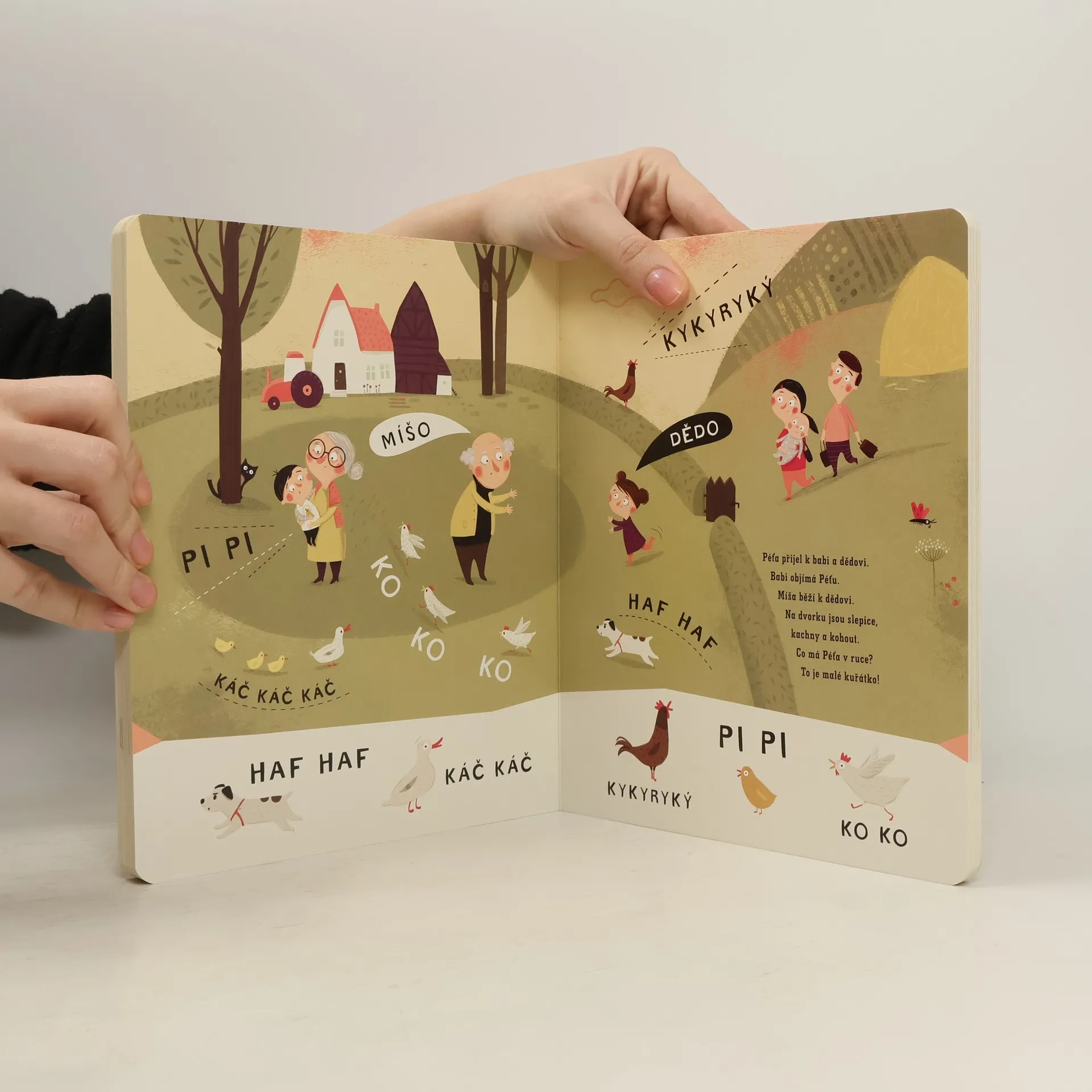 Seznamte se s Péťou a jeho veselou rodinkou! Krásně ilustrované leporelo se stane oblíbeným průvodcem při prvních krůčcích v mluvení. Soustředí se především na zvukomalebné výrazy a samohlásky, které používají už roční děti. Kniha má záměrně jednoduchou formu a je doplněna krásnými ilustracemi, které dítě motivují, aby pojmenovávalo objekty a opakovalo zvuky, což přirozeně vývoj jeho řeči podporuje. Leporelo je určeno dětem od 12 měsíců.