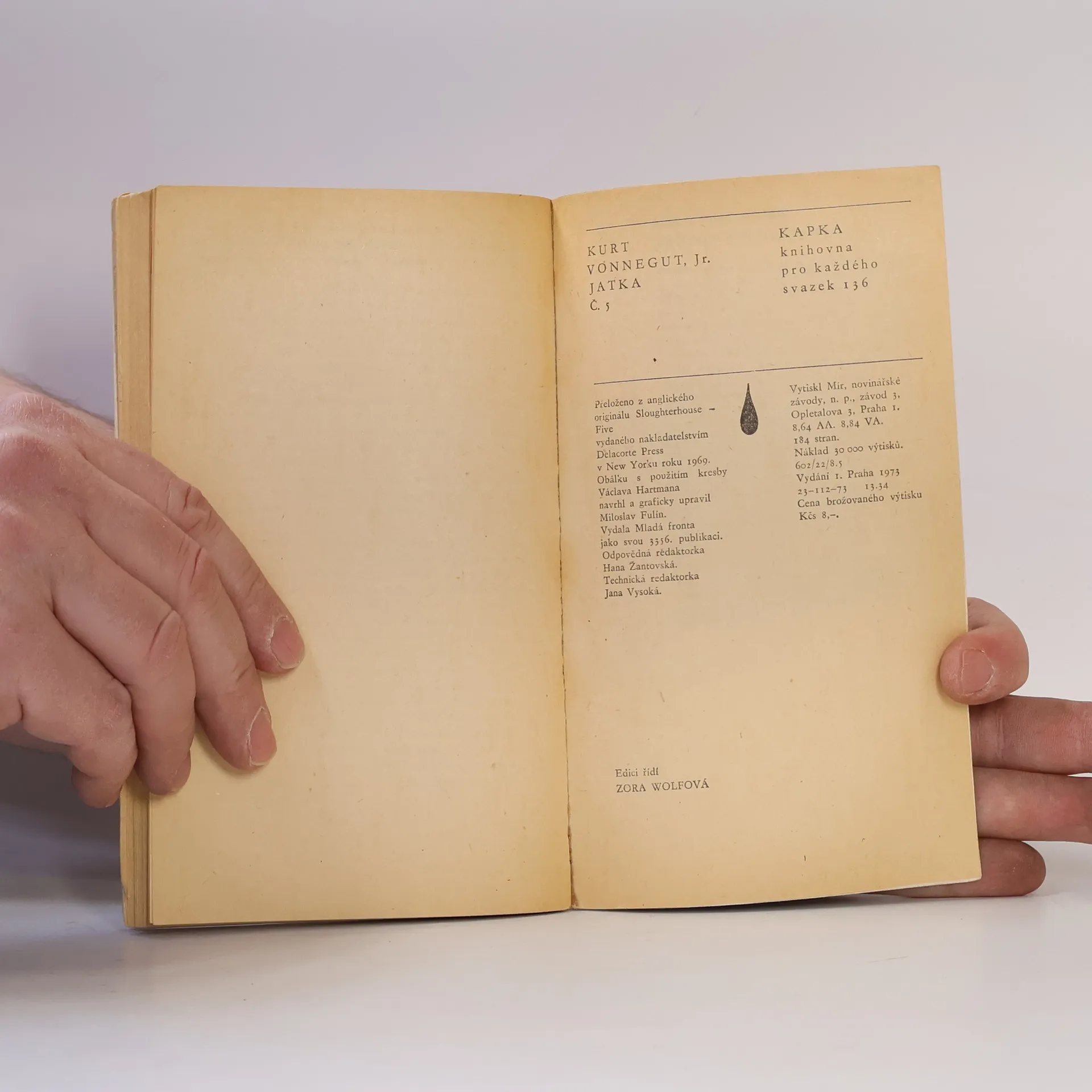 Současný americký autor, vynikající tvůrce science-fiction, spojuje ve vědeckofantastickém románě vlastní zážitky - nejprve amerického vojáka za druhé světové války, později německého válečného zajatce za náletu na Drážďany aještě později spisovatele, píšícího román o válce aDrážďanech - s fikcí o životě na vybájené planetě. Kniha vyšla v řadě zahraničních překladů a její filmový přepis, z něhož část byla natočena v Praze, získal na festivalu v Cannescenu poroty.