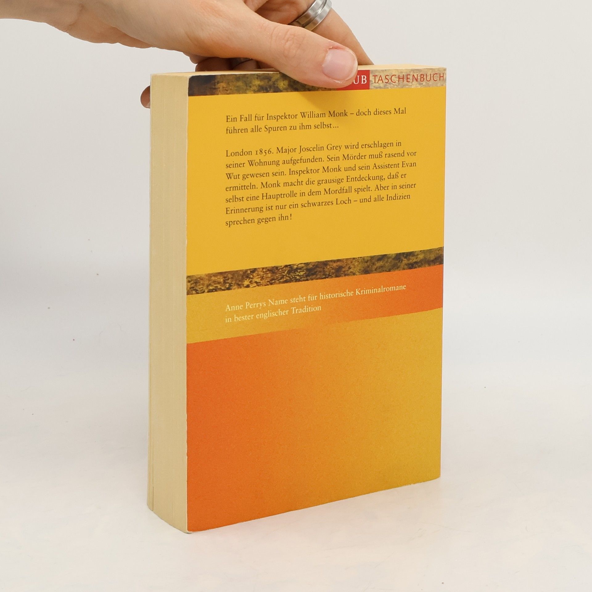 London zur Zeit Königin Viktorias: Major Joscelin Grey, hochdekorierter Veteran aus dem Krimkrieg und stadtbekannter Bürger, wird in seiner Wohnung brutal ermordet. Polizeidetektiv William Monk soll den brisanten Fall übernehmen. Doch er kämpft nicht nur mit der ihm feindlich gesonnenen Familie des Toten und dunklen Informanten, sondern auch mit den Folgen eines schweren Kutschenunfalls. Nur die Krankenschwester Hester Latterly hilft ihm in einer Welt, in der er nicht zwischen Freund und Feind unterscheiden kann und wo er verzweifelt nach jeden Hinweis greift, der ihn in seine eigene Vergangenheit und zu einem grausamen Mörder führen kann.