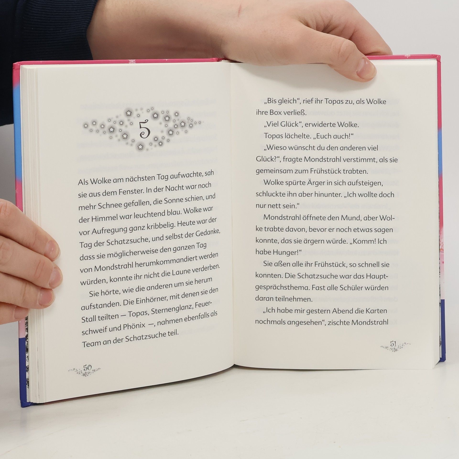 In der Einhornschule wird eine Schatzsuche veranstaltet! Wolke und ihre Freunde bilden natürlich sofort ein Team und üben fleißig, denn sie wollen unbedingt den Hauptpreis gewinnen. Mondstrahl ist ganz besonders ehrgeizig beim Üben und vergisst dabei fast, dass Freundschaft und Hilfsbereitschaft wichtiger sind als um jeden Preis Erster zu werden. Als dann ein kleiner Babydrache in Not ist, stehen die vier Freunde vor einer schwierigen Entscheidung ...