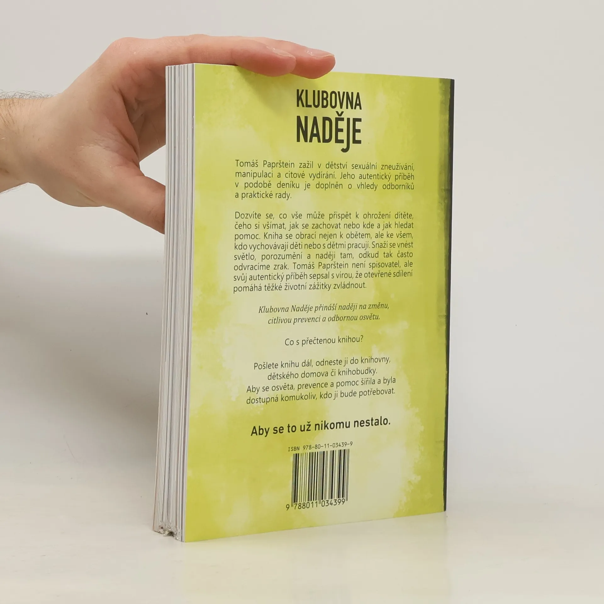Tomáš Paprštein zažil v dětství sexuální zneužívání, manipulaci a citové vydírání. Jeho autentický příběhv podobě deníku je doplněn o vhledy odborníků a praktické rady. Dozvíte se, co vše může přispět k ohrožení dítěte, čeho si všímat, jak se zachovat nebo kde a jak hledat pomoc. Kniha se obrací nejen k obětem, ale ke všem, kdo vychovávají děti nebo s dětmi pracují. Snaží se vnést světlo, porozumění a naději tam, odkud tak často odvracíme zrak. Tomáš Paprštein není spisovatel, ale svůj autentický příběh sepsal s vírou, že otevřené sdílení pomáhá těžké životní zážitky zvládnout.Klubovna Naděje přináší naději na změnu, citlivou prevenci a odbornou osvětu.Co s přečtenou knihou?Pošlete knihu dál, odneste ji do knihovny, dětského domova či knihobudky. Aby se osvěta, prevence a pomoc šířila a byla dostupná komukoliv, kdo ji bude potřebovat.Aby se to už nikomu nestalo.Knihu je možné koupit zde:kniha.klubovnanadeje.cz