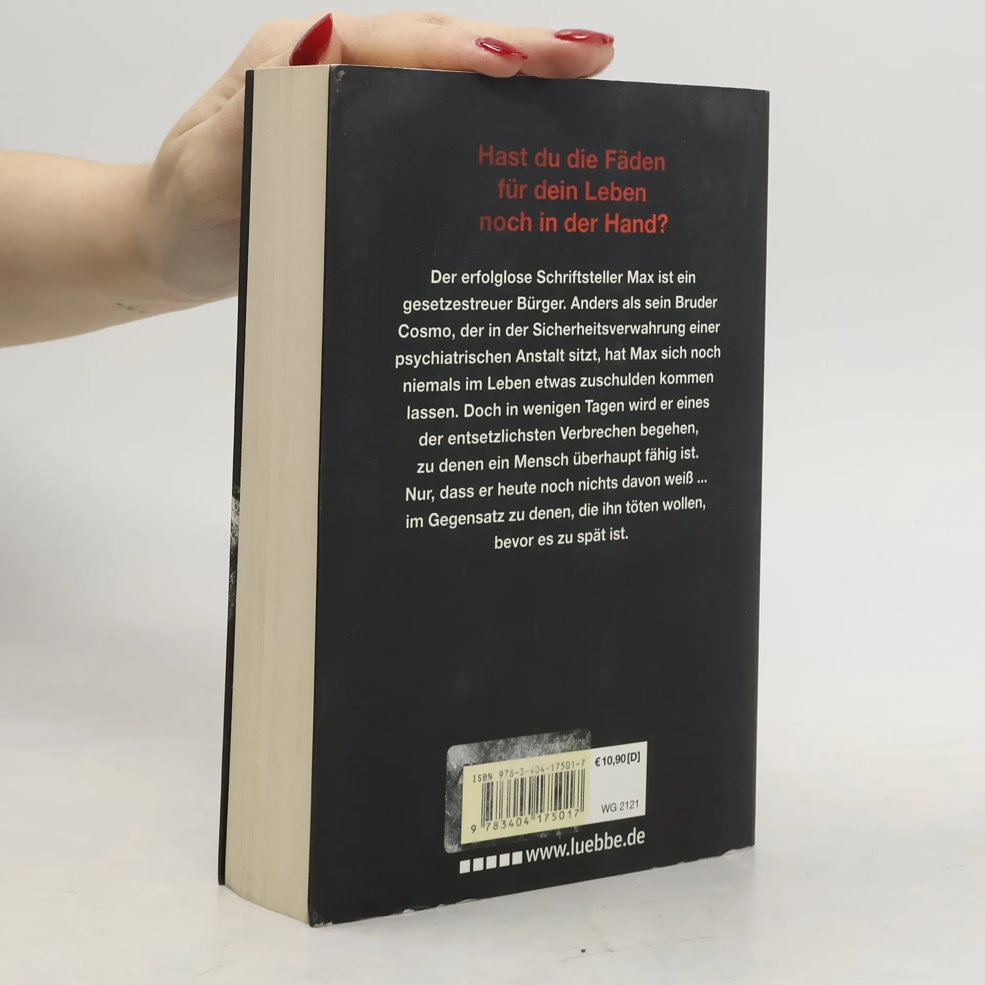 Der erfolglose Schriftsteller Max ist ein gesetzestreuer Bürger. Anders als sein Bruder Cosmo, der in der Sicherheitsverwahrung einer psychiatrischen Anstalt sitzt, hat Max sich noch niemals im Leben etwas zuschulden kommen lassen. Doch in wenigen Tagen wird er eines der entsetzlichsten Verbrechen begehen, zu denen ein Mensch überhaupt fähig ist. Nur, dass er heute noch nichts davon weiß ... im Gegensatz zu denen, die ihn töten wollen, bevor es zu spät ist.