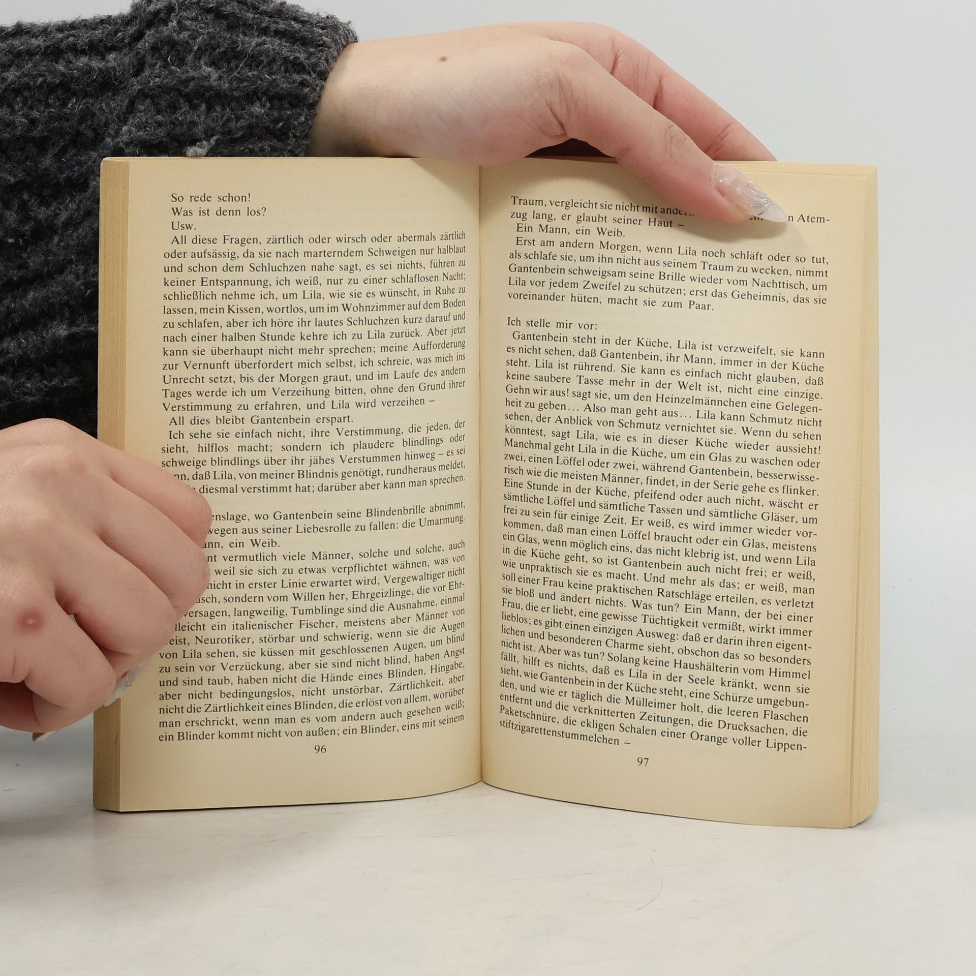 Der Erzähler erfindet (»Ich stelle mir vor:«) mögliche Lebensgeschichten dreier Personen: Da ist Gantenbein, der einen Blinden spielt, um so genauer seine Umwelt beobachten zu können. Oder da ist Enderlin, der immer »ein fremder Herr« bleibt. Auch Svoboda muß die Erfahrung machen, daß Liebe und Ehe endlich sind. Übrig im Spiel der erdichteten Rollen bleibt: Gantenbein.