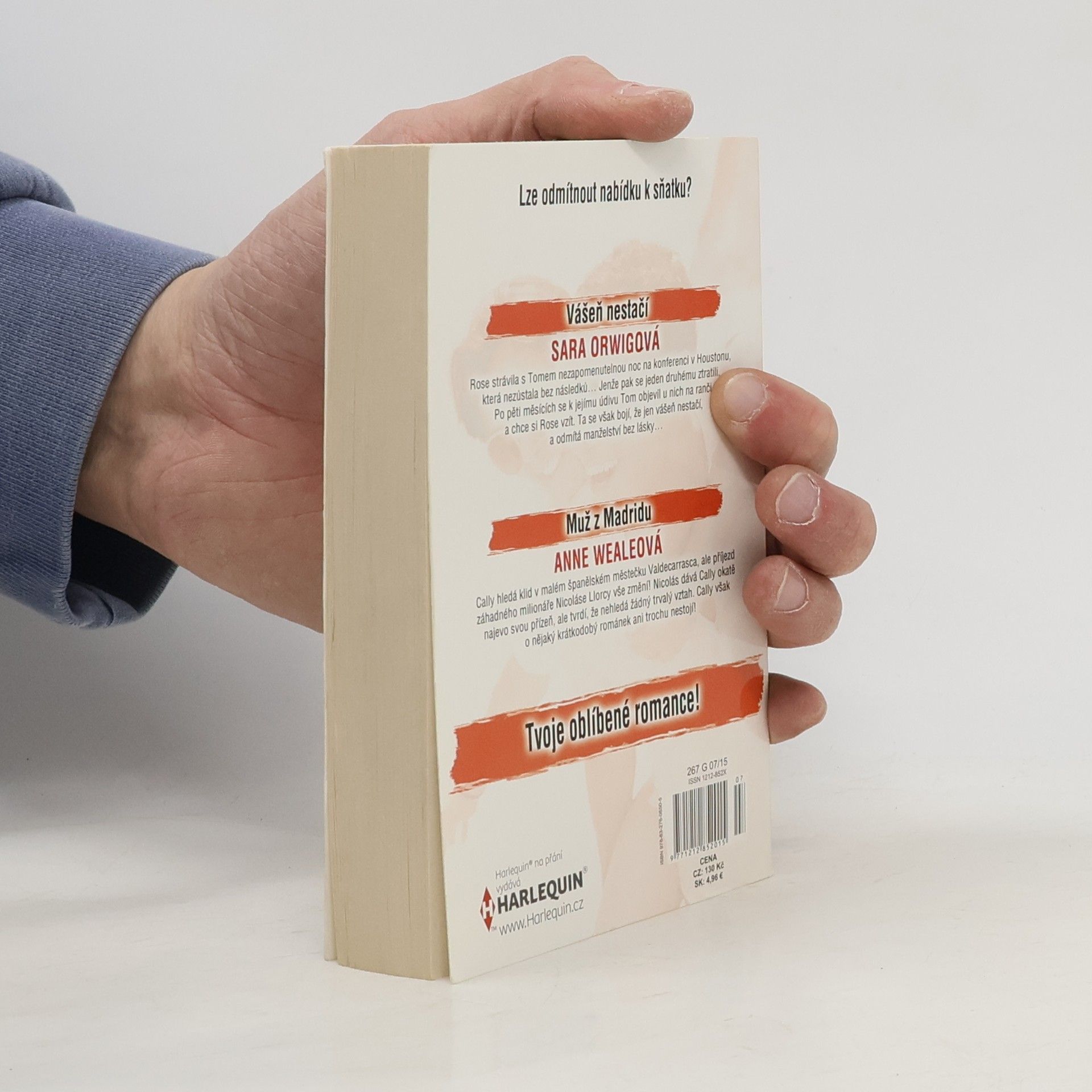 Sara Orwig - Vášeň nestačí Rose strávila s Tomem nezapomenutelnou noc na konferenci v Houstonu, která nezůstala bez následků… Jenže pak se jeden druhému ztratili. Po pěti měsících se Tom k jejímu údivu objevil u nich na ranči a chce si Rose vzít. Ta se však bojí, že jen vášeň nestačí, a odmítá manželství bez lásky… Anne Weal - Muž z Madridu Cally hledá klid v malém španělském městečku Valdecarrasca, ale příjezd záhadného milionáře Nicoláse Llorcy vše změní! Nicolás dává Cally okatě najevo svou přízeň, ale tvrdí, že nehledá žádný trvalý vztah. Cally však o nějaký krátkodobý románek ani trochu nestojí!