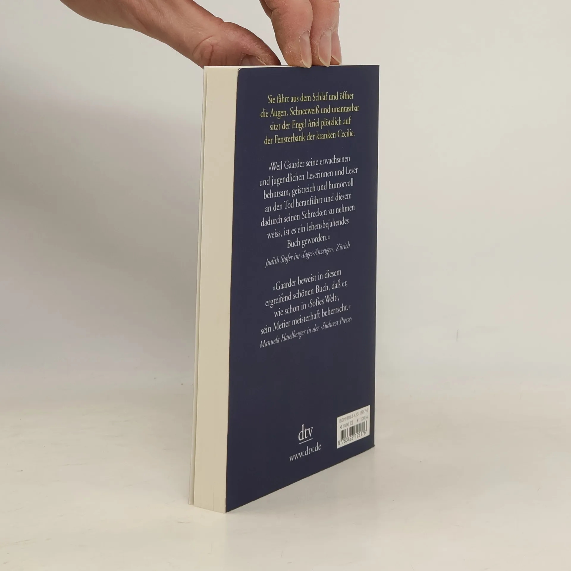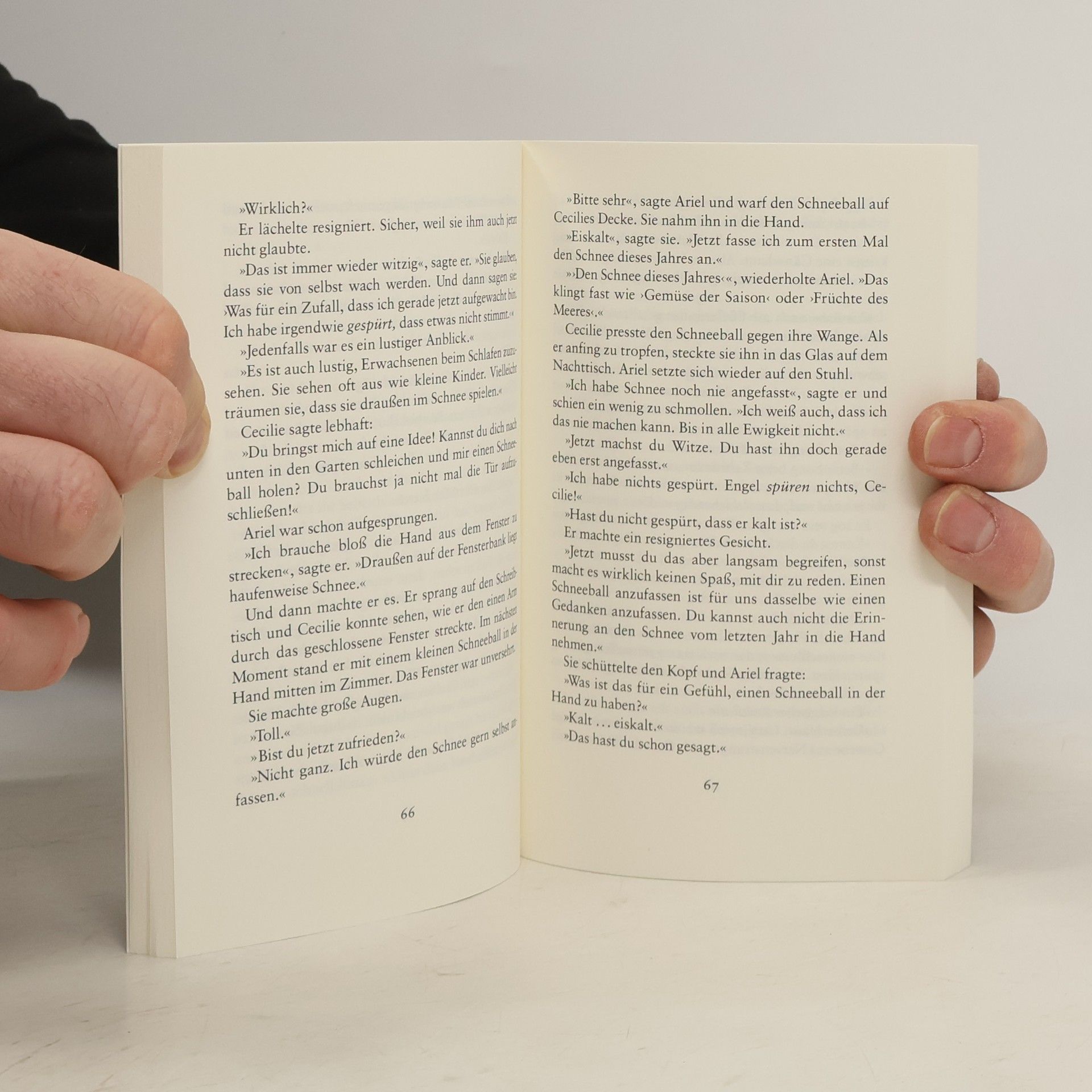 Nachdenken über das Leben »Sie fuhr aus dem Schlaf. Es mußte schon spät sein, denn im ganzen Haus war es still. Cecilie öffnete die Augen und knipste die Lampe über dem Bett an. Sie hörte eine Stimme, die fragte: ›Hast du gut geschlafen?‹ Wer war das?« Schneeweiß und unantastbar sitzt der Engel Ariel plötzlich auf der Fensterbank der sterbenden Cecilie. Es ist Weihnachten, und unten im Haus bereitet die Familie alles zum großen Fest vor. Da beginnt Ariel mit der krebskranken Cecilie zu sprechen: über die Schöpfung, den Kosmos und die Sinne, mit denen die Menschen die Schöpfung wahrnehmen. Umgekehrt möchte Ariel von Cecilie alles über das Leben der Menschen wissen, die im Gegensatz zu ihm ja sterbliche Geschöpfe sind. Zum ersten und zum letzten Mal in ihrem Leben sieht sich Cecilie herausgefordert, ihre Existenz in der Welt zu durchdenken und mit ihrer Vorstellungskraft das zu durchdringen, was Spiegel uns als vertraute Fassade zeigen. Ein unendlicher Kosmos tut sich ihr plötzlich hinter Wörtern und Begriffen auf, den sie nur bruchstückhaft erfassen kann. Und bei aller Unfertigkeit ist sie am Ende trotzdem der Welt und sich selbst ein großes Stück nähergekommen.