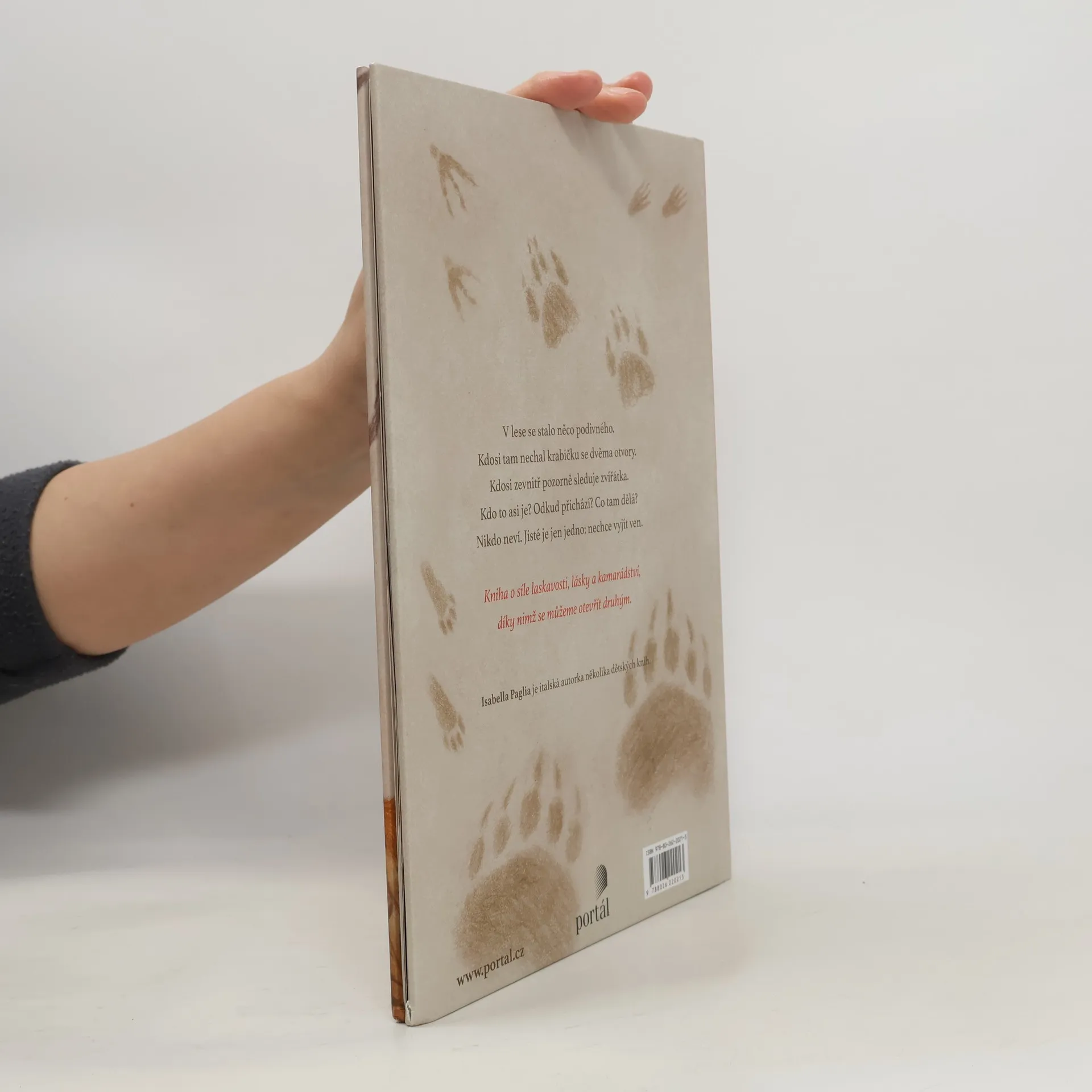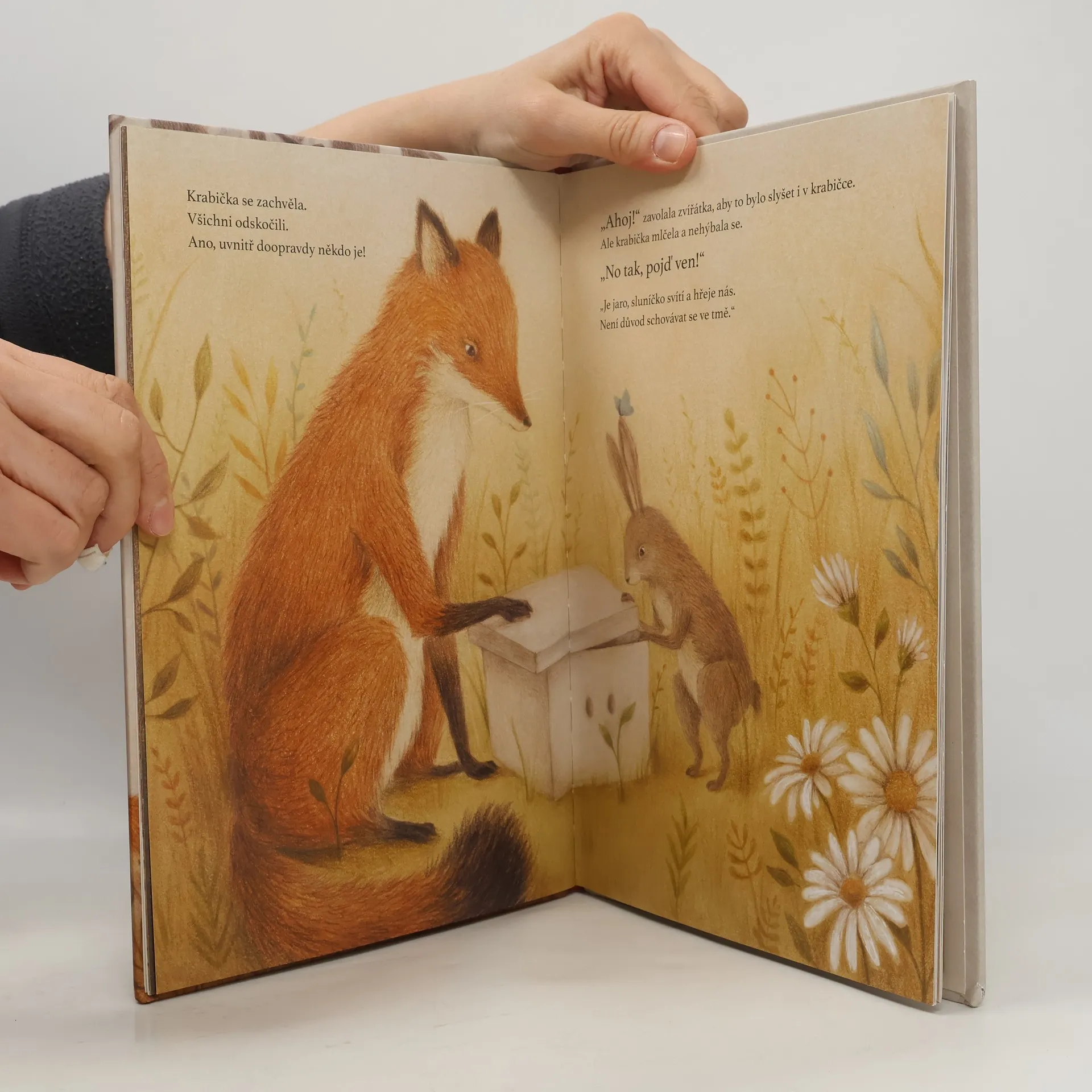 V lese se najednou objevila krabička. Na jedné straně má dvě dírky a nikdo neví, jak se tam ocitla. Všechna zvířátka přemýšlejí o tom, proč se objevila právě v lese, nikdo ale nezná odpověď. Jedno je ale jisté: ať je tam kdokoli nebo cokoli, rozhodně nechce z krabičky ven. Půvabná knížka o tom, že na světě nejvíc potřebujeme kamarády, osloví děti od pěti let.
