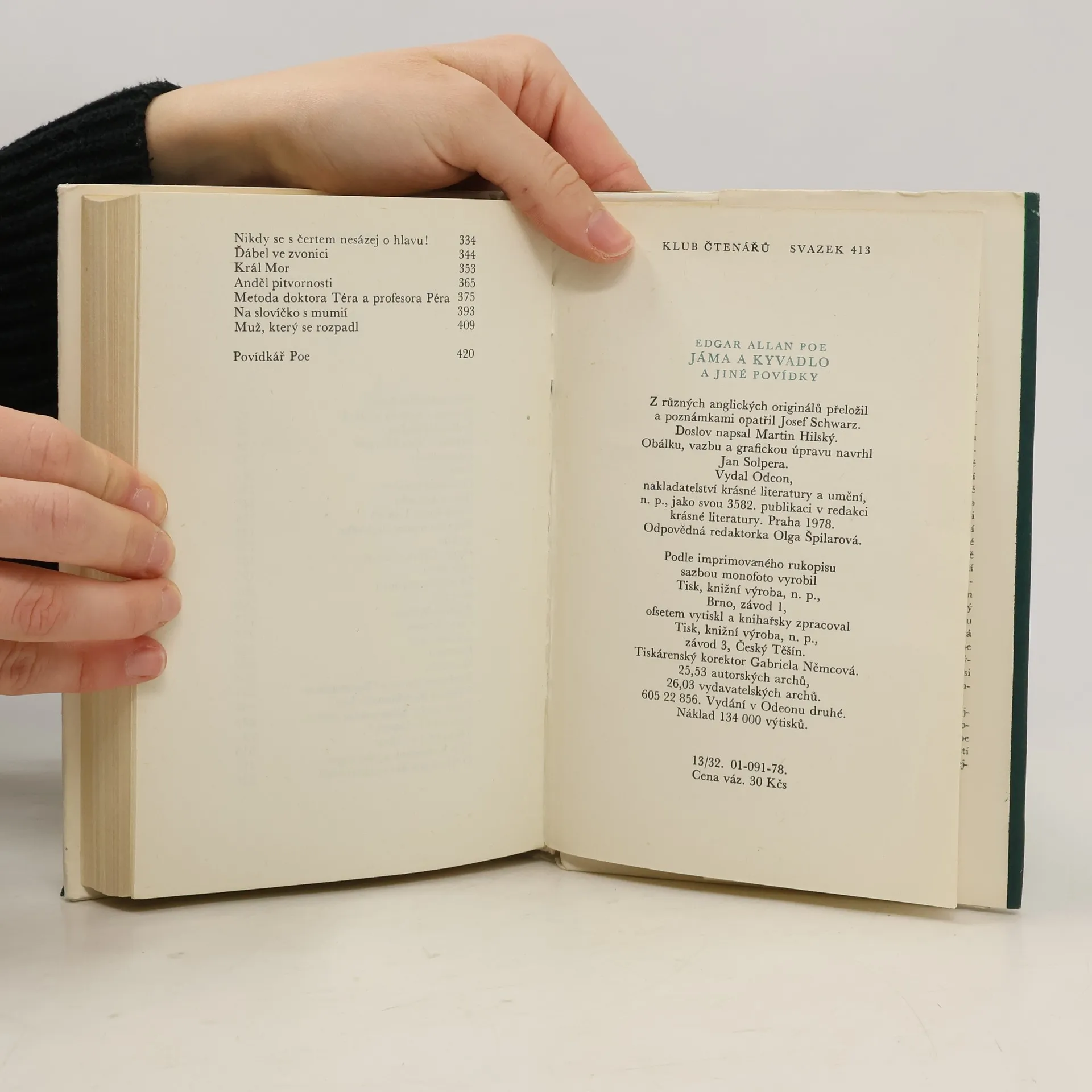 Čtyřiatřicet povídek známého spisovatele se snaží ukázat mnohotvárnost a všestrannost jeho talentu. Jde o příběhy, v nichž se jeví jako předchůdce povídky kriminální a detektivní, vědeckofantastické a jako žánru označovaného jménem horror. Autor v nich rozehrává svou jedinečnou fantazii a uplatňuje smysl pro logickou a rozumovou konstrukci. Povídky: Pád do Maelstömu, Rukopis nalezený v láhvi, Podlouhlá bedna, Vraždy v ulici Morgue, Zlatý brouk, Vrah jsi ty !, Předčasný pohřeb, Jáma a kyvadlo, Zánik domu Usherů, Sud vína amontilladského Skokan, Maska Červené smrti, Muž davu, Démon zvrácenosti, Berenice, William Wilson, Černý kocour, Zrádné srdce, Eleonora, Medailón, Rozhovor Eirose s Charmionem, Příběh z Rozeklaných hor, Tisící druhý Šeherezádin příběh, Senzace s balónem, Tři neděle v týdnu, Von Kempelen a jeho objev, O šizení jakožto exaktní vědě, Nikdy se s čertem nesázej o hlavu !, Ďábel ve zvonici, Král Mor, Anděl pitvornosti, Metoda doktora Téra a profesora Péra, Na slovíčko s mumií, Muž, který se rozpadl. Povídkář Poe. Vydání v Odeonu druhé. Edice Klub čtenářů, svazek 413.
