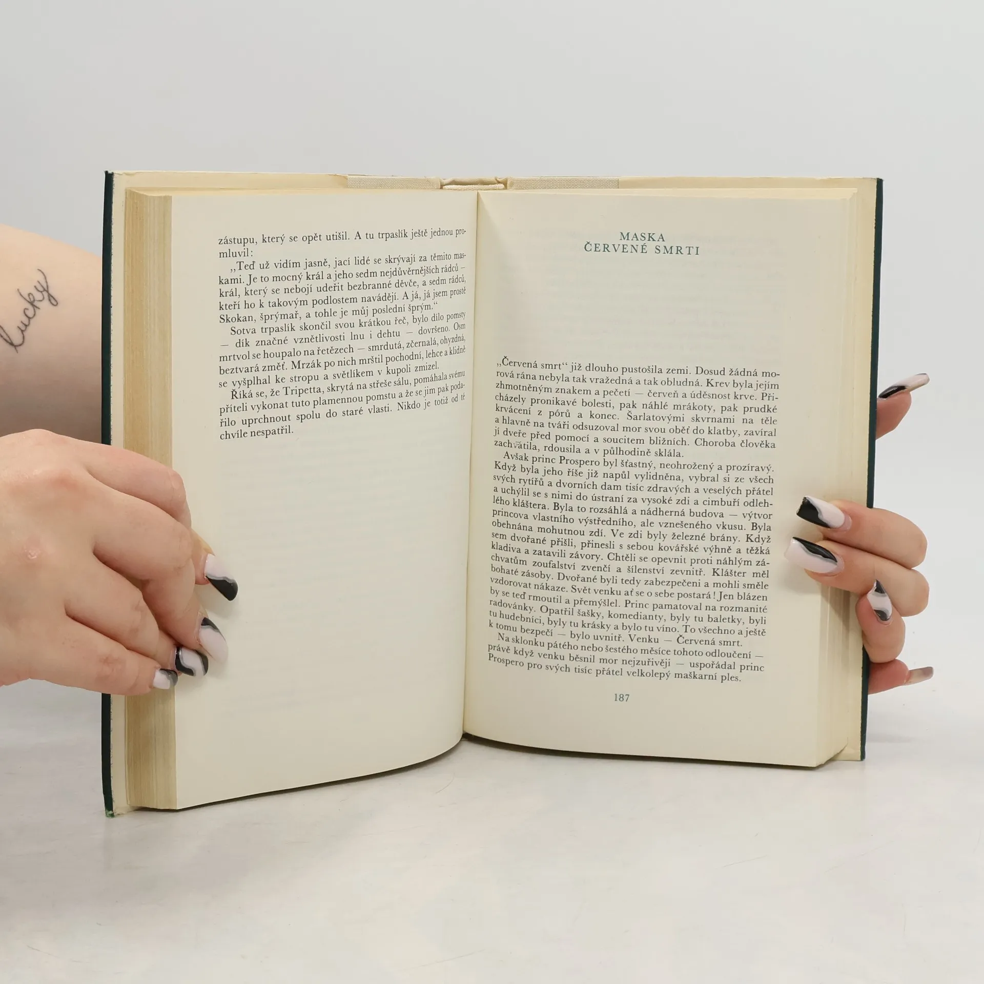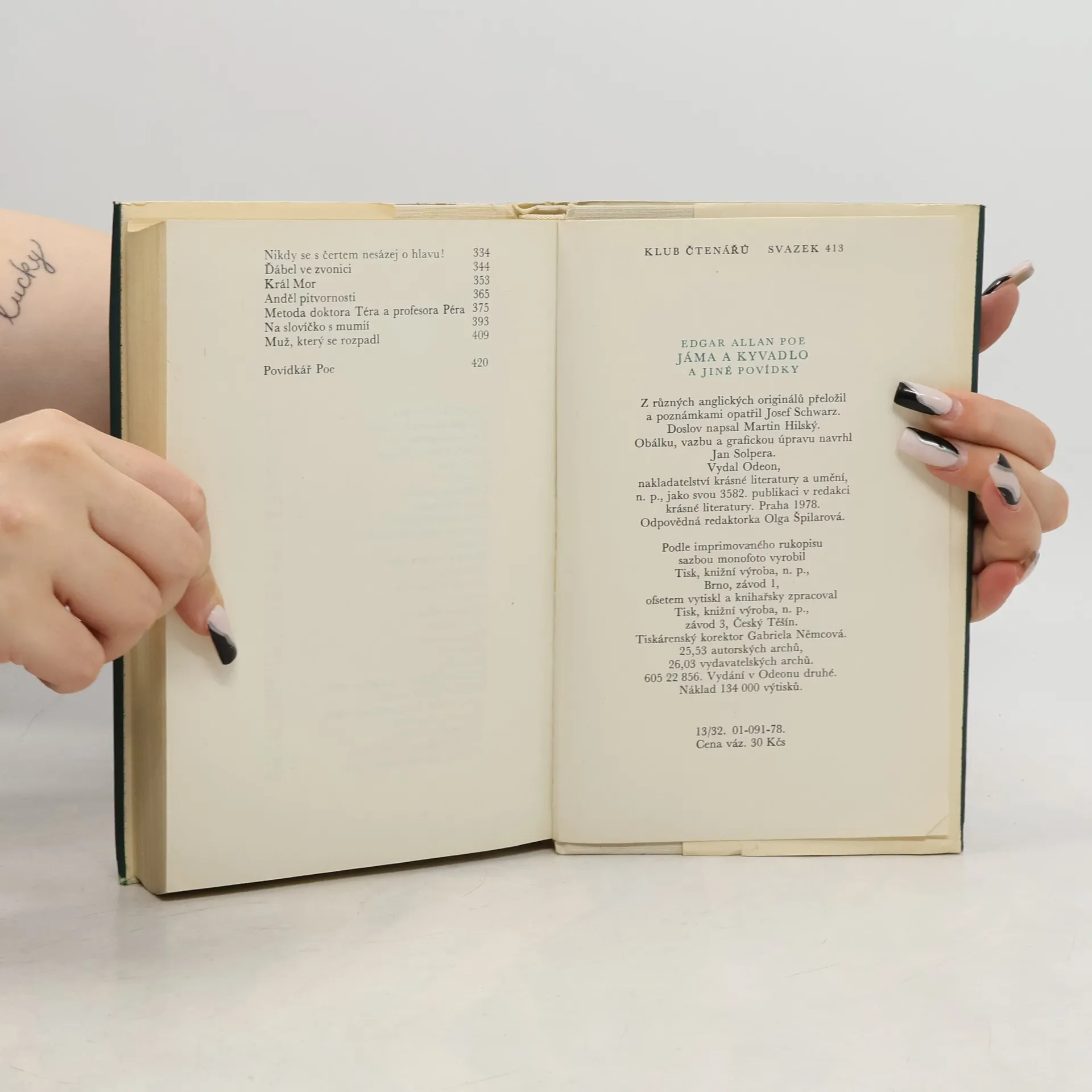Čtyřiatřicet povídek známého spisovatele se snaží ukázat mnohotvárnost a všestrannost jeho talentu. Jde o příběhy, v nichž se jeví jako předchůdce povídky kriminální a detektivní, vědeckofantastické a jako žánru označovaného jménem horror. Autor v nich rozehrává svou jedinečnou fantazii a uplatňuje smysl pro logickou a rozumovou konstrukci. Povídky: Pád do Maelstömu, Rukopis nalezený v láhvi, Podlouhlá bedna, Vraždy v ulici Morgue, Zlatý brouk, Vrah jsi ty !, Předčasný pohřeb, Jáma a kyvadlo, Zánik domu Usherů, Sud vína amontilladského Skokan, Maska Červené smrti, Muž davu, Démon zvrácenosti, Berenice, William Wilson, Černý kocour, Zrádné srdce, Eleonora, Medailón, Rozhovor Eirose s Charmionem, Příběh z Rozeklaných hor, Tisící druhý Šeherezádin příběh, Senzace s balónem, Tři neděle v týdnu, Von Kempelen a jeho objev, O šizení jakožto exaktní vědě, Nikdy se s čertem nesázej o hlavu !, Ďábel ve zvonici, Král Mor, Anděl pitvornosti, Metoda doktora Téra a profesora Péra, Na slovíčko s mumií, Muž, který se rozpadl. Povídkář Poe. Vydání v Odeonu druhé. Edice Klub čtenářů, svazek 413.