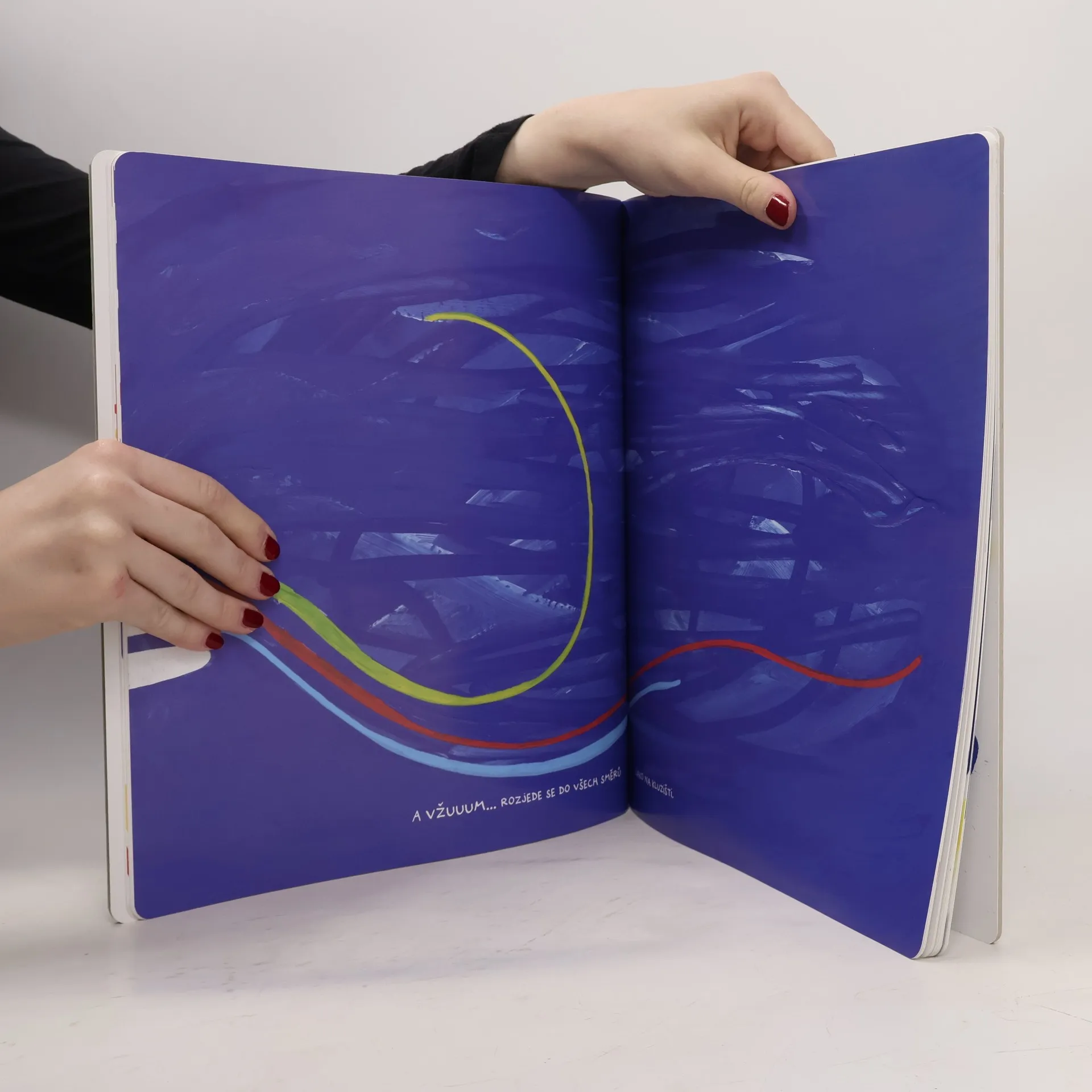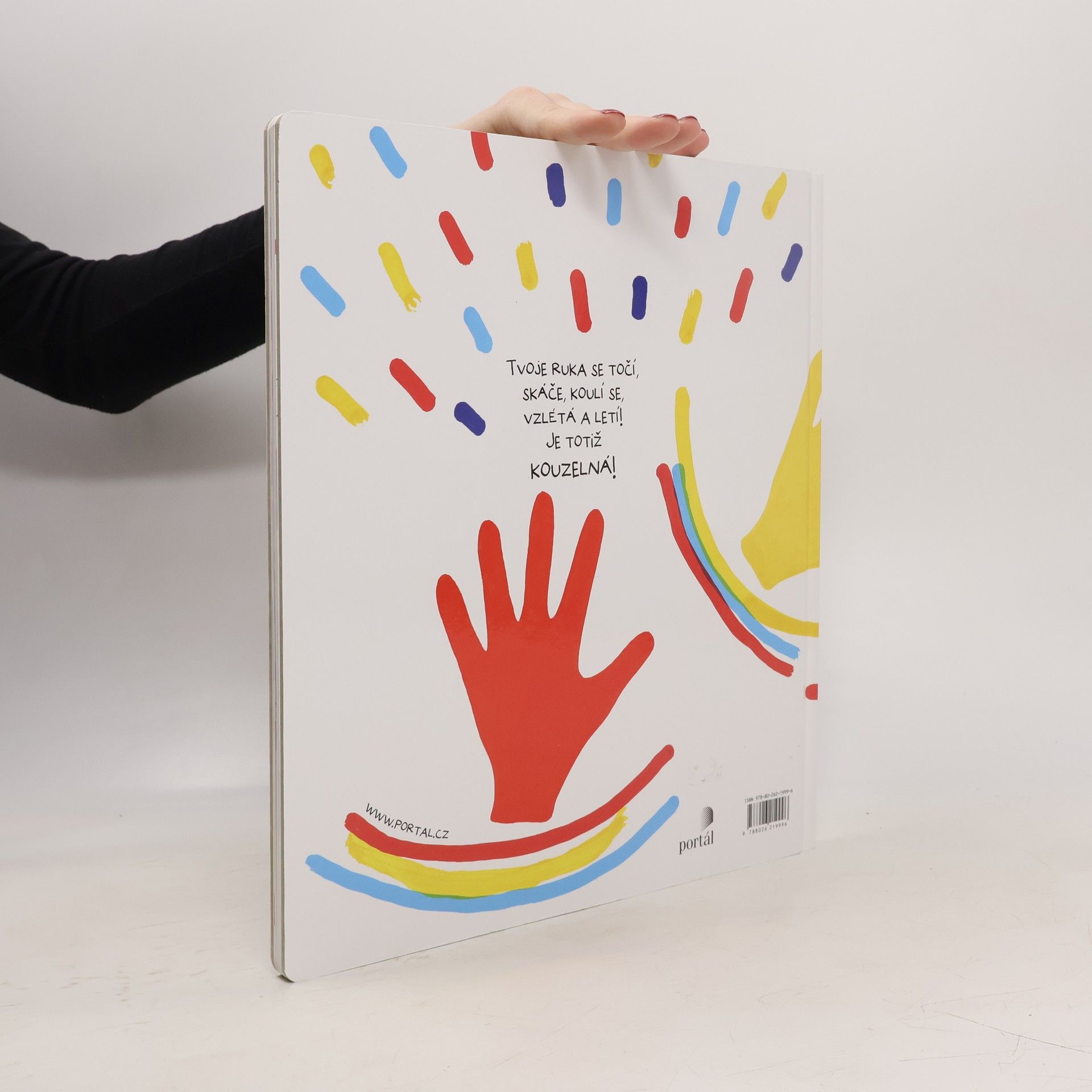 Hravá velkoformátová „tulletovka“. Tvá kouzelná ruka tančí a skáče po stránkách knihy, mění se v rybu, motýla i raketu. Může fungovat jako podpora grafomotoriky (uvolňování předloktí a zápěstí), nebo jen jako soubor relaxačních a výrazových cvičení. Kniha opět pracuje s dětskou fantazií, rytmem, pohyby rukou a může se „číst“ stále dokola. Ruce poskakují po stránkách jako míč, třepotají se jako motýlek, mění se v rybu i raketu, leží nehnutě na stránkách, aby se mohly vzápětí zvednout a tradáááá! Děti si zároveň procvičují jemnou motoriku, orientaci v prostoru, barvy i tvary.