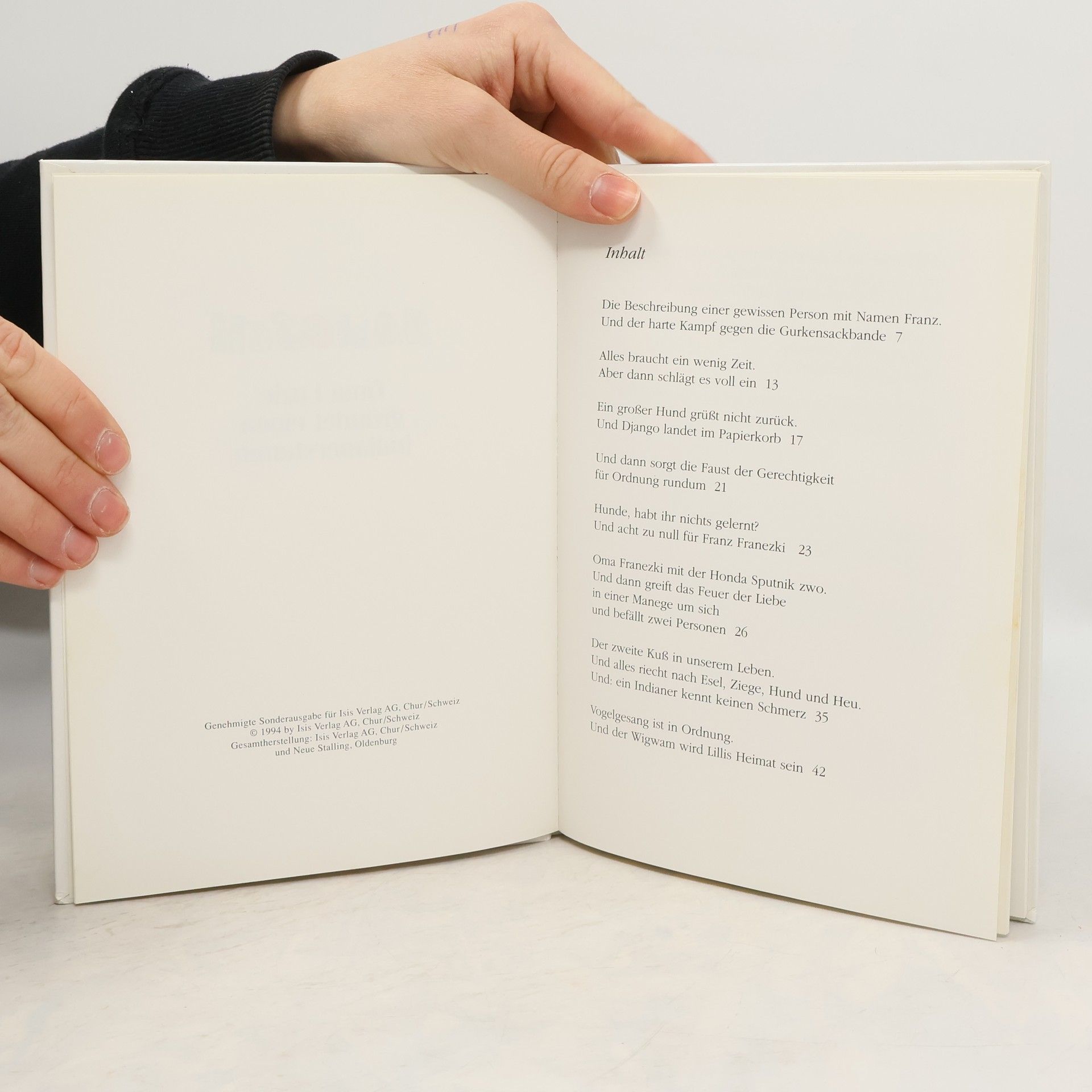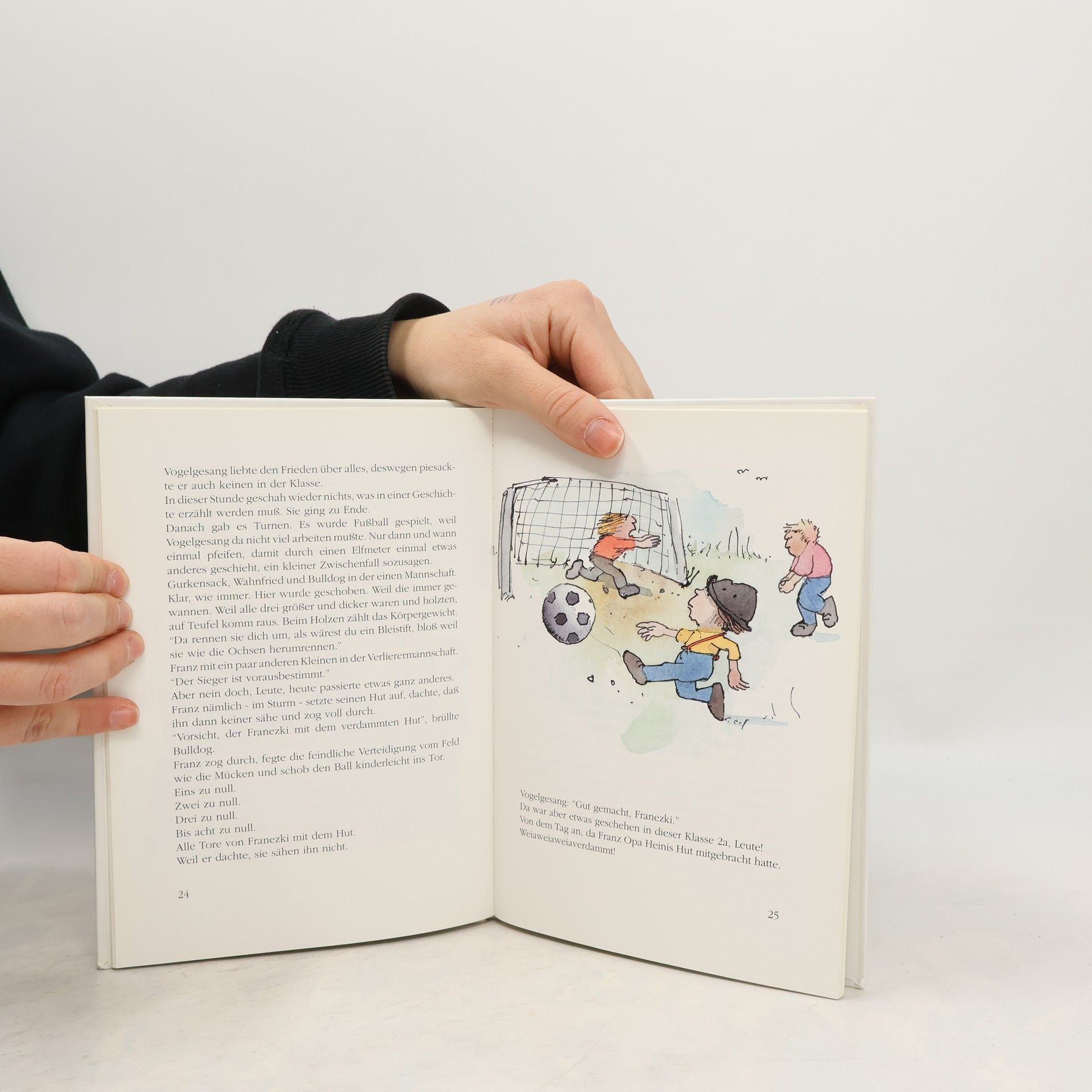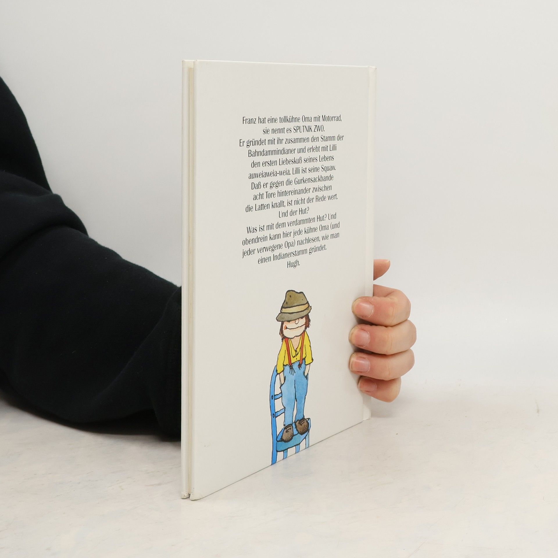 Franz hat eine tollkühne Oma mit Motorrad, sie nennt es SPUTNIK ZWO. Er gründet mit ihr zusammen den Stamm der Bahndammindianer und erlebt mit Lilli den ersten Liebeskuss seines Lebens auweiaweia-weia. Lilli ist seine Squaw. Das er gegen die Gurkensackbande acht Tore hintereinander zwischen die Latten knallt, ist nicht der Rede wert. Und der Hut? Was ist mit dem verdammten Hut? Und obendrein kann hier jede kühne Oma (und jeder verweigene Opa) nachlesen, wie man einen Indianerstamm gründet. Hugh.