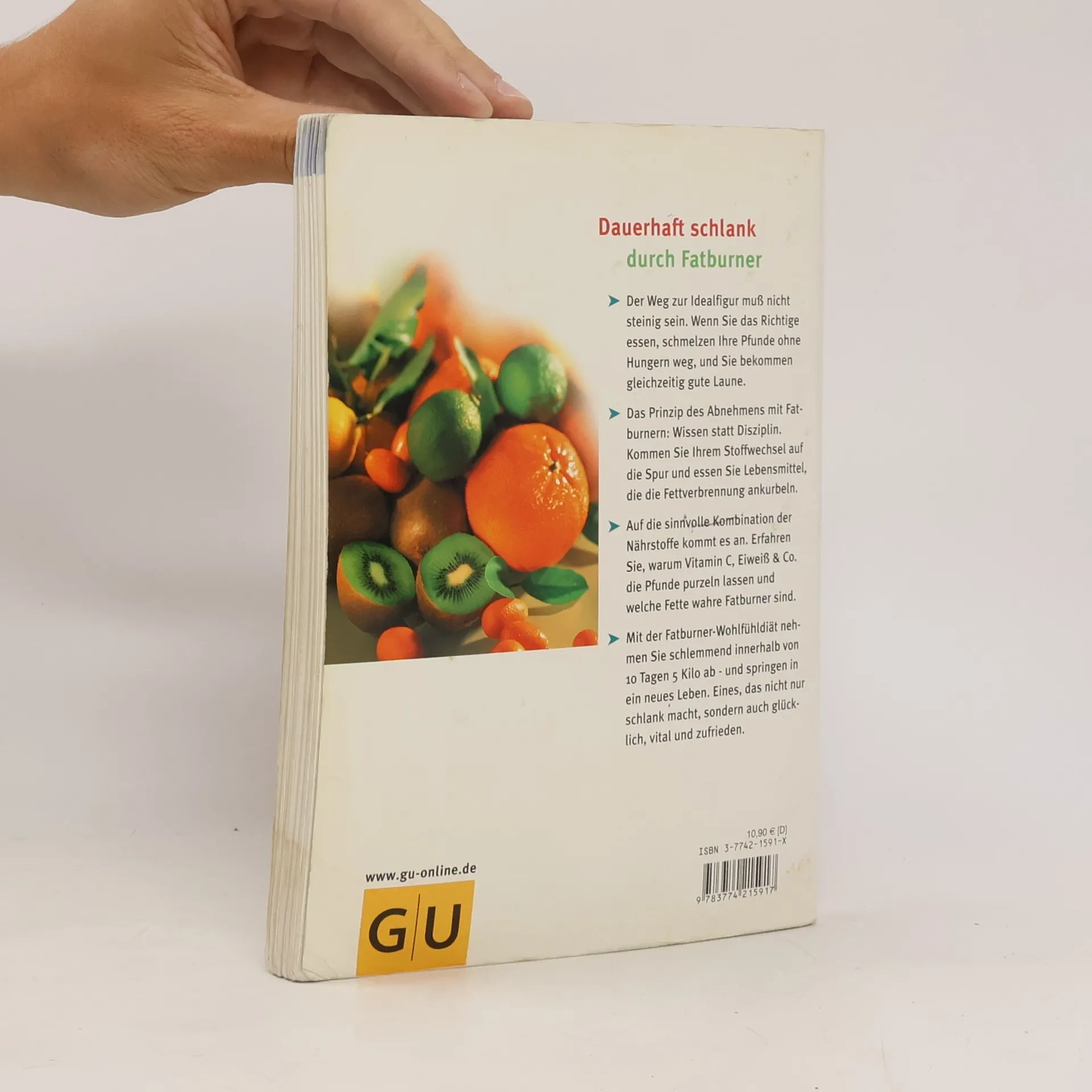 Abnehmen ohne Jo-Jo-Effekt. 'Fatburner' sind Vitalstoffe, die das Fett in den Zellen zum Schmelzen bringen: Sie aktivieren den Fettabbau in den Fettzellen oder kurbeln die Produktion von Hormonen an, die schlank, fit und glücklich machen. Der Ratgeber verrät, wie eine zeitgemäße Ernährung aussieht und in welchen Lebensmitteln welche Vitalstoffe stecken. Dazu gibt es eine komplette 14-Tage-Biostoff-Diät mit köstlichen und leichten Rezepten, die den Stoffwechsel auf Trab bringen und die Pfunde purzeln lassen, sowie ein ergänzendes Wellness-Programm mit Gymnastik, Massagen und vielem mehr. Als Extra ist eine Tabelle zum Einstecken enthalten.