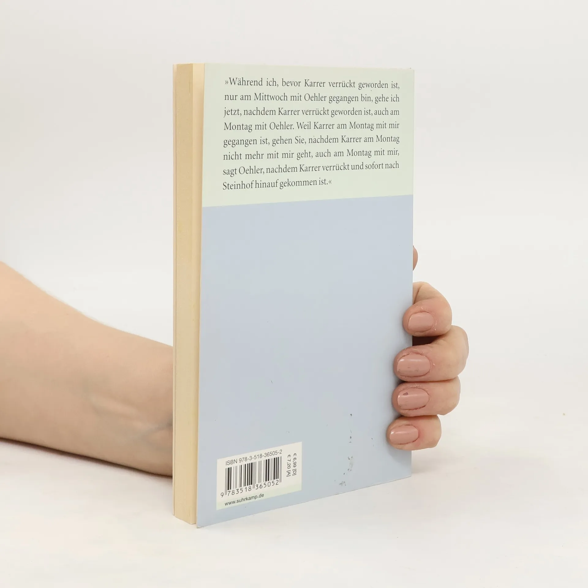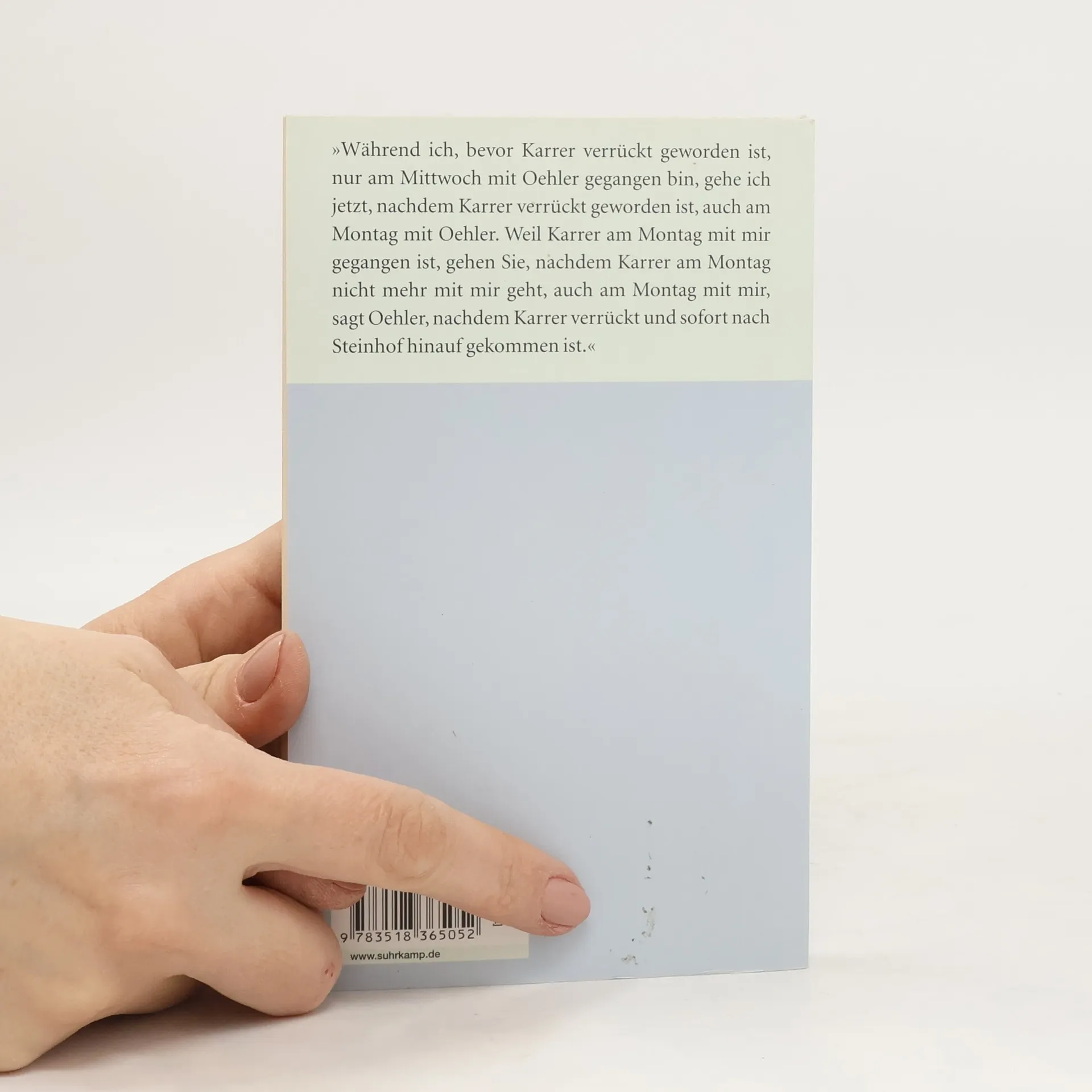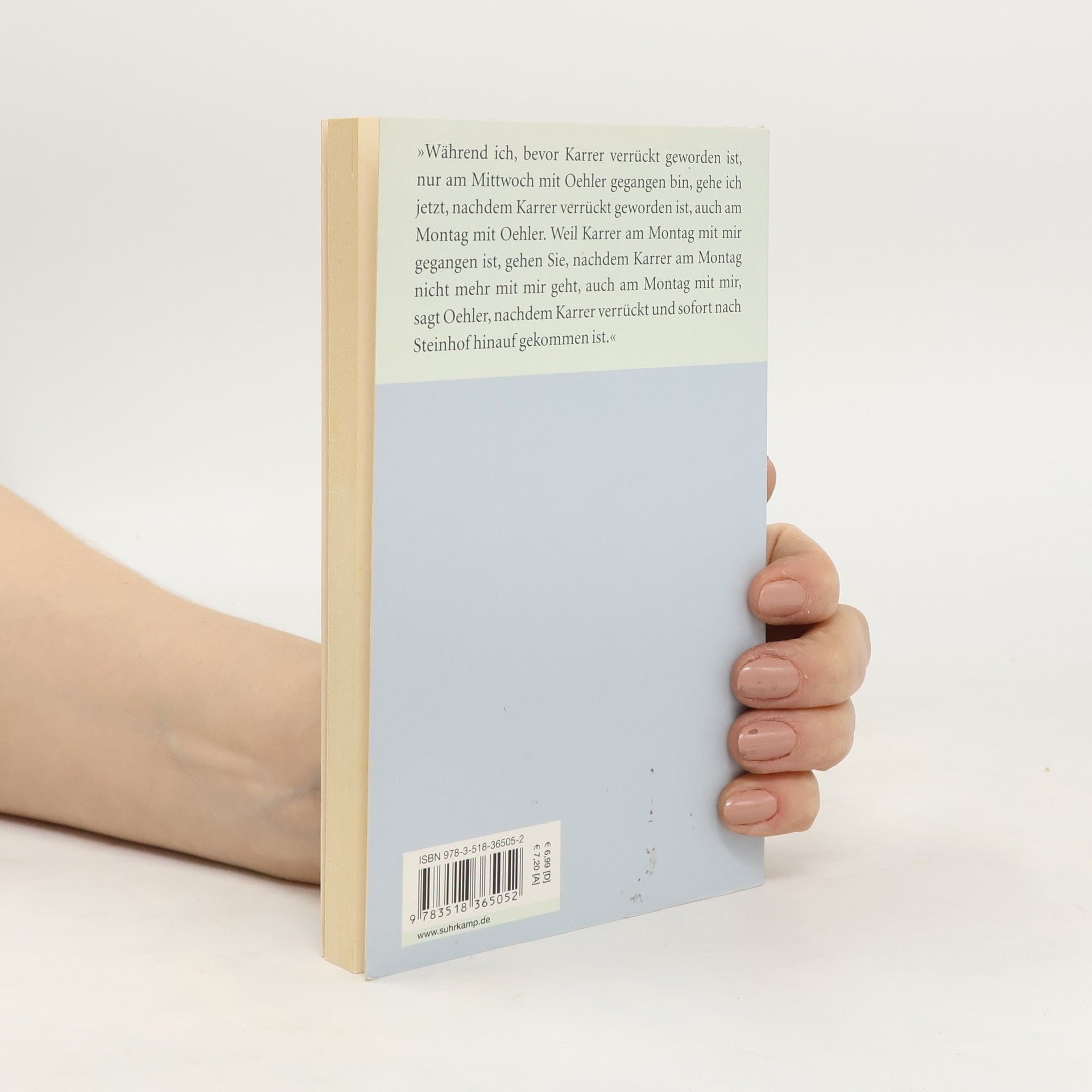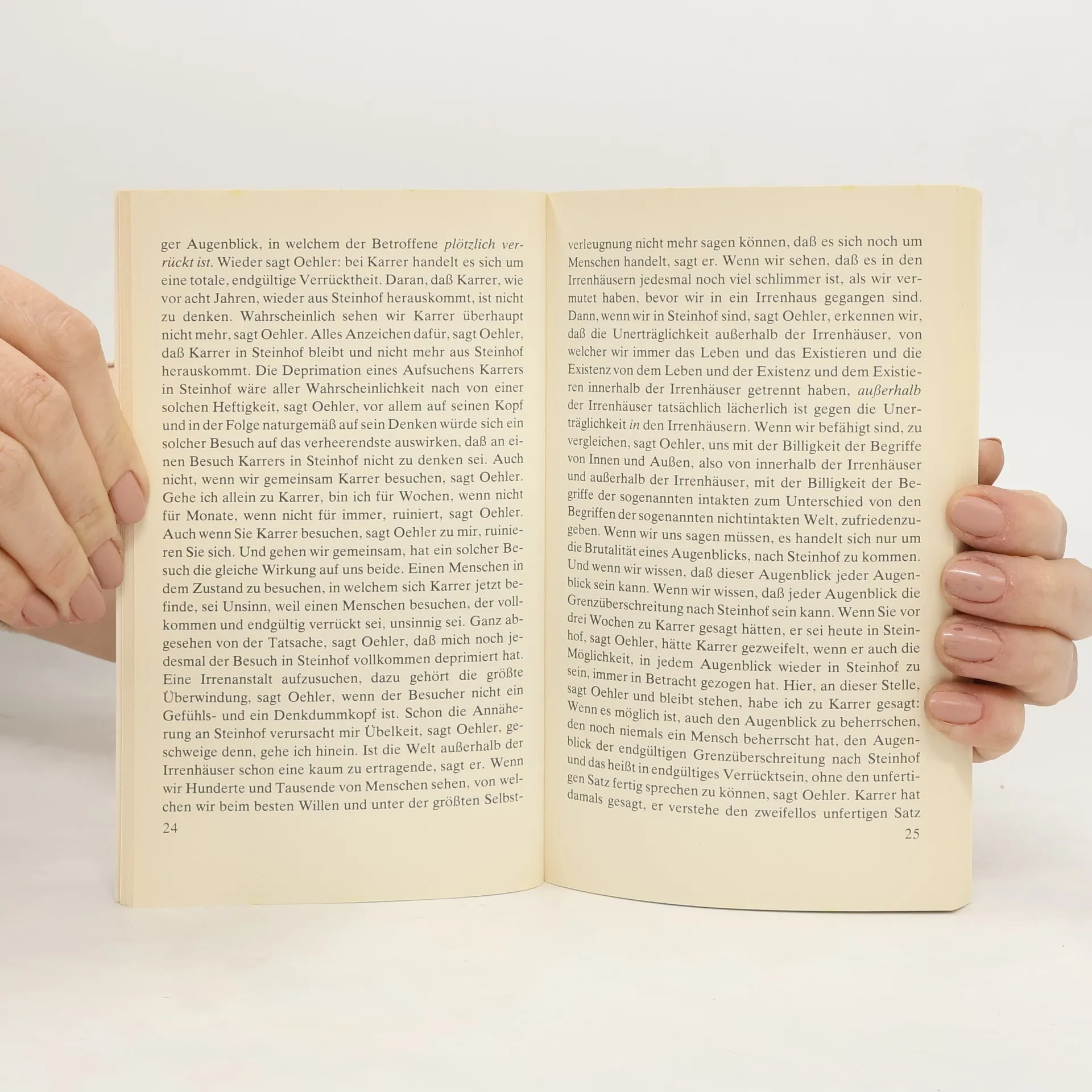 Auf regelmäßigen Spaziergängen berichtet Oehler, der früher mit Karrer ging, einem Dritten, warum Karrer verrückt geworden und nach Steinhof hinaufgekommen ist. Für Karrer war das Gehen Anlaß und Ausdruck seiner Denkbewegung. »Mit Karrer zu gehen, ist eine ununterbrochene Folge von Denkvorgängen gewesen.«, Denkvorgänge, in den Karrer sich klarwerden wollte über die Beziehung des Denkens zu den Gegenständen, über das Verhältnis von Bewegung und Stillstand.