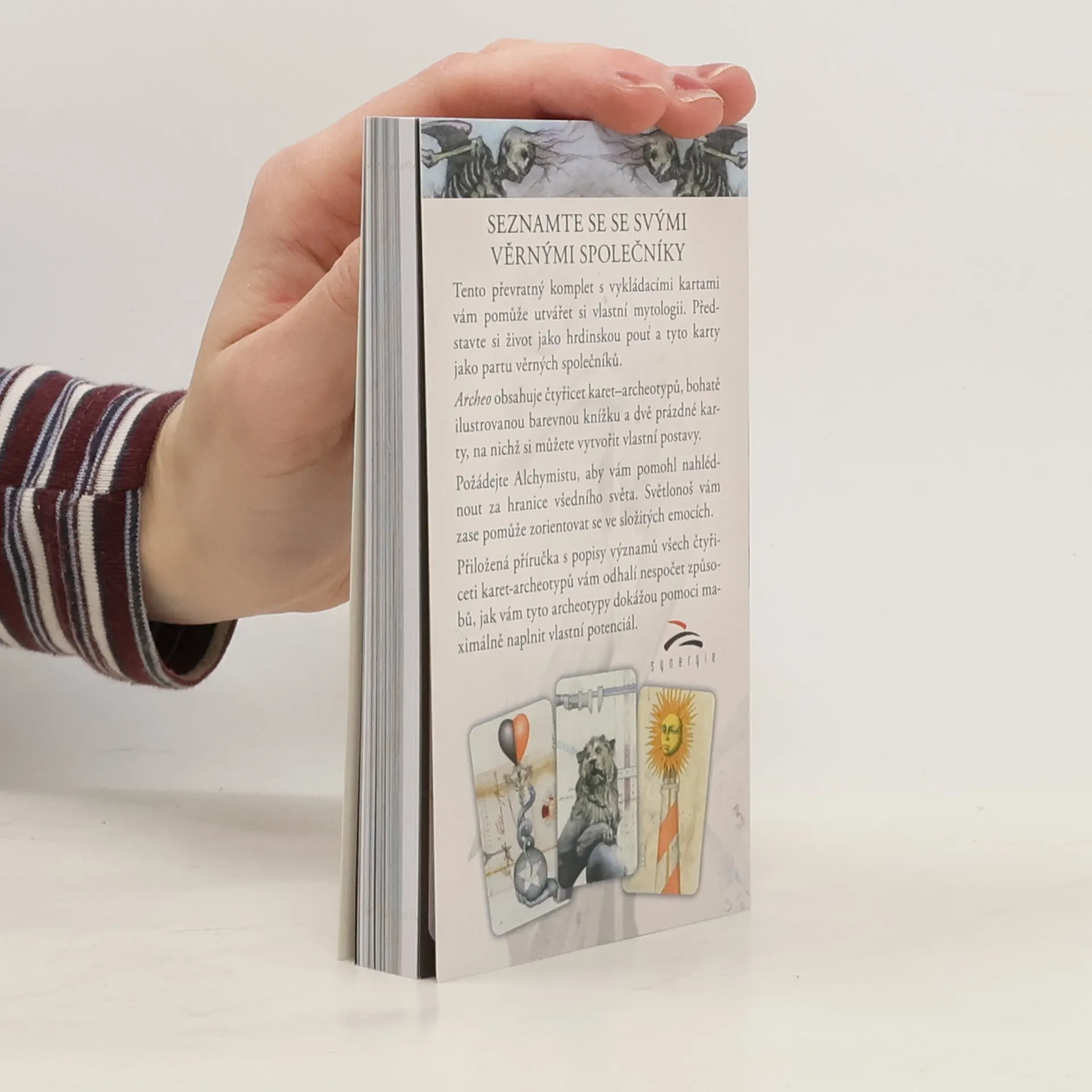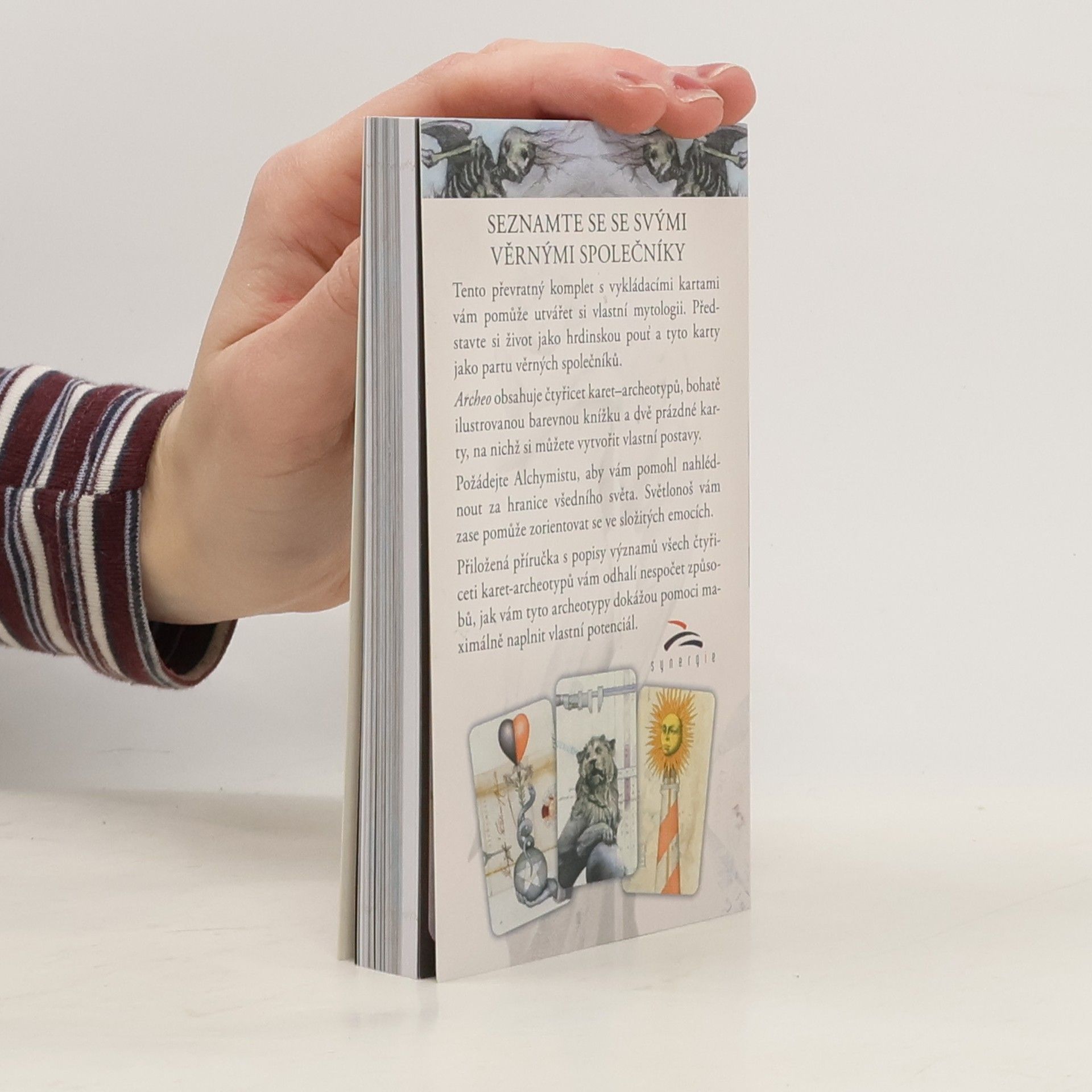 Tento převratný komplet s vykládacími kartami vám pomůže utvářet si vlastní mytologii. Představte si život jako hrdinskou pouť a tyto karty jako partu věrných společníků. Archeo obsahuje čtyřicet karet-archeotypů, bohatě ilustrovanou barevnou knížku a dvě prázdné karty, na nichž si můžete vytvořit vlastní postavy. Požádejte Alchymistu, aby vám pomohl nahlédnout za hranice všedního světa. Světlonoš vám zase pomůže zorientovat se ve složitých emocích. Přiožená příručka s popisy významů všech čtyřiceti karet-archeotypů vám odhalí nespočet způsobů, jak vám dokážou pomoci maximálně naplnit vlastní potenciál.