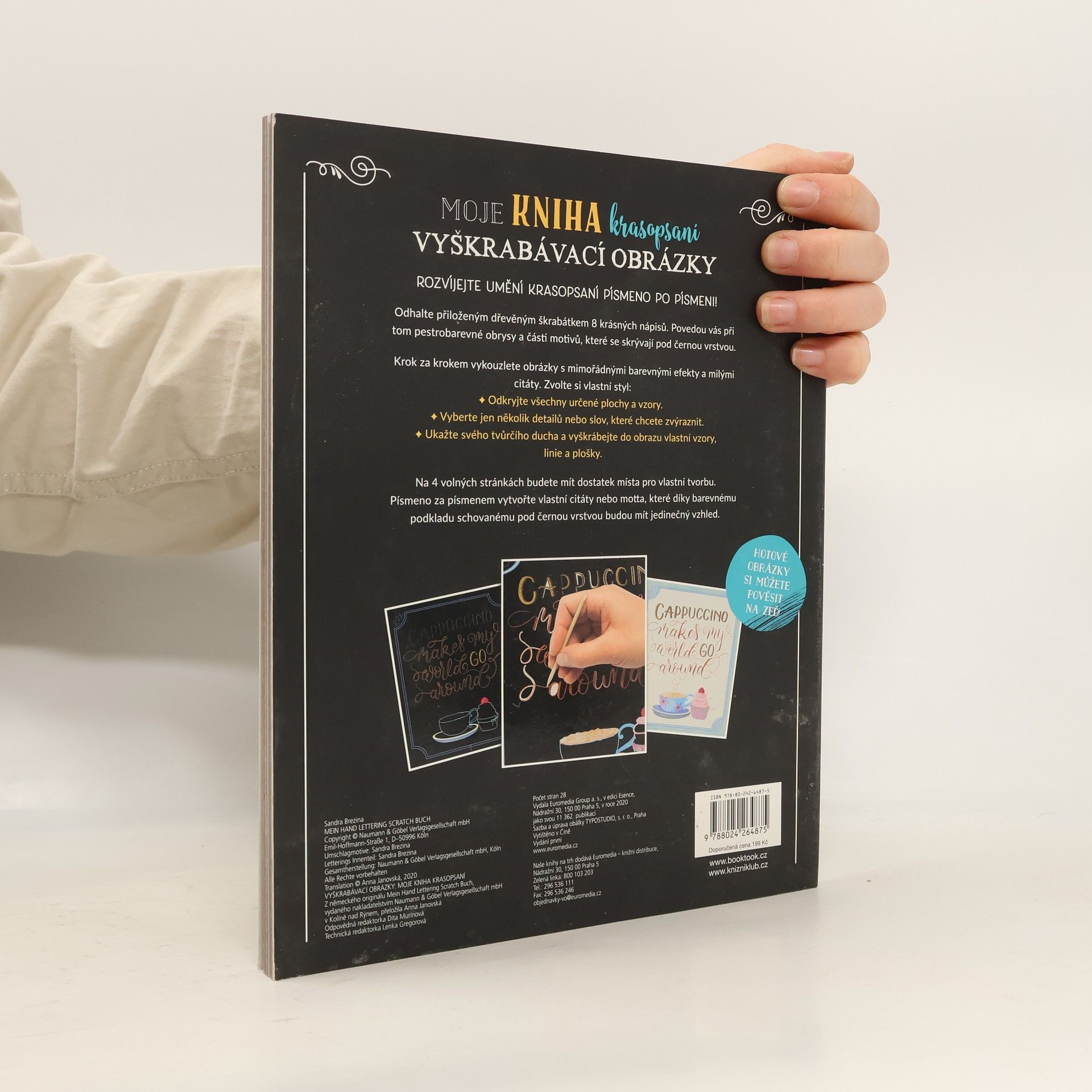 Odhalte přiloženým dřevěným škrabátkem 8 originálních krasopsaných nápisů. Povedou vás při tom pestrobarevné obrysy a části motivů, které se skrývají pod černou vrstvou. Na 4 volných stránkách budete mít dostatek místa pro vlastní tvorbu. Hotové výtvory si můžete jednoduše vytrhnout a pověsit na zeď nebo darovat svým nejbližším.