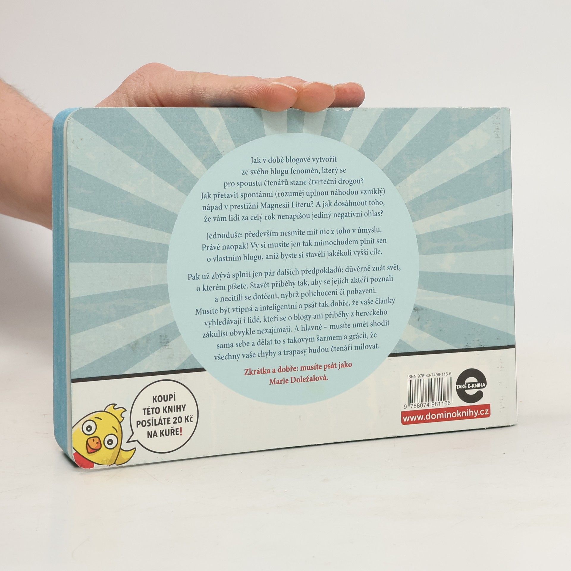 Jak v době blogové vytvořit ze svého blogu fenomén, který se pro zástupy čtenářů stane čtvrteční drogou? Jak přetavit spontánní (rozuměj úplnou náhodou vzniklý) nápad v prestižní Magnesii Literu? A jak dosáhnout toho, že vám lidi za celý rok nenapíšou jediný negativní ohlas? Jednoduše: především nesmíte mít nic z toho v úmyslu. Právě naopak! Vy musíte jen tak mimochodem uskutečňovat sen o vlastním blogu, aniž byste si stavěli jakékoli vyšší cíle. Pak už zbývá jen pár dalších předpokladů: důvěrně znát svět, o kterém píšete. Psát tak, aby se všichni aktéři popisovaných příhod poznali, a cítili se polichoceni či pobaveni, nikoli dotčeni. Musíte být vtipná a inteligentní a psát tak dobře, že vaše články vyhledávají i lidé, kteří by za jiných okolností žádný blog ani historky z hereckého zákulisí nikdy nečetli (ze zásady). A hlavně – musíte umět shodit sama sebe a dělat to s takovým šarmem a grácií, že všechny vaše chyby a trapasy budou čtenáři milovat. Zkrátka a dobře: musíte psát jako Marie Doležalová. A když se k tomu přidají geniální ilustrace Jana Hofmana, vznikne kniha, kterou prostě chcete mít. Kterou chcete dát jako dárek. Protože tahle kniha vám zvedne náladu tak jako žádná jiná!