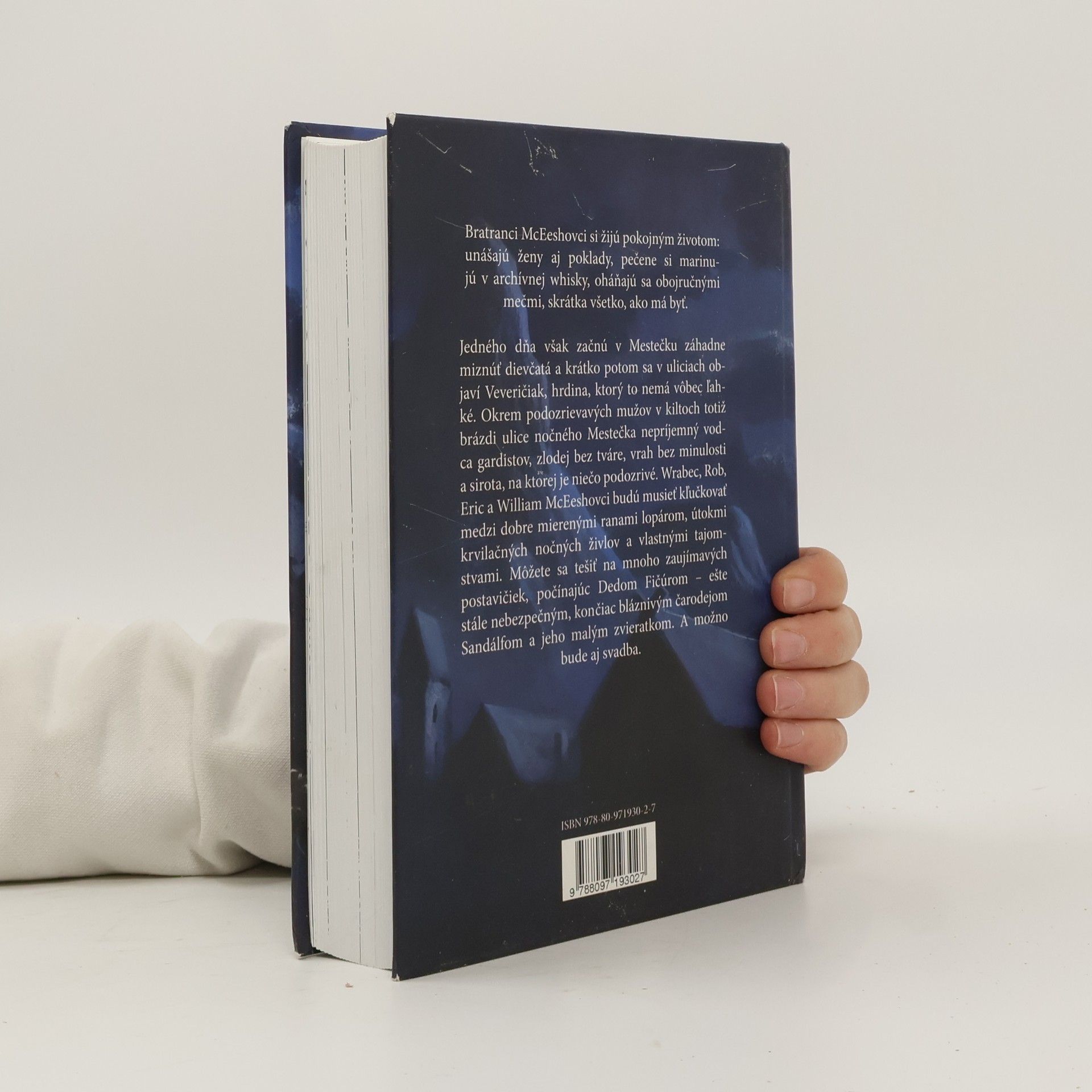 Bratranci McEeshovci si žijú pokojným životom: unášajú ženy aj poklady, pečene si marinujú v archívnej whisky, oháňajú sa obojručnými mečmi, skrátka všetko, ako má byť. Jedného dňa však začnú v Mestečku záhadne miznúť dievčatá a krátko potom sa v uliciach objaví Veveričiak, hrdina, ktorý to nemá vôbec ľahké. Okrem podozrievavých mužov v kiltoch totiž brázdi ulice nočného Mestečka nepríjemný vodca gardistov, zlodej bez tváre, vrah bez minulosti a sirota, na ktorej je niečo podozrivé. Wrabec, Rob, Eric a William McEeshovci budú musieť kľučkovať medzi dobre mierenými ranami lopárom, útokmi krvilačných nočných živlov a vlastnými tajomstvami. Môžete sa tešiť na mnoho zaujímavých postavičiek, počínajúc Dedom Fičúrom – ešte stále nebezpečným, končiac bláznivým čarodejom Sandálfom a jeho malým zvieratkom. A možno bude aj svadba.