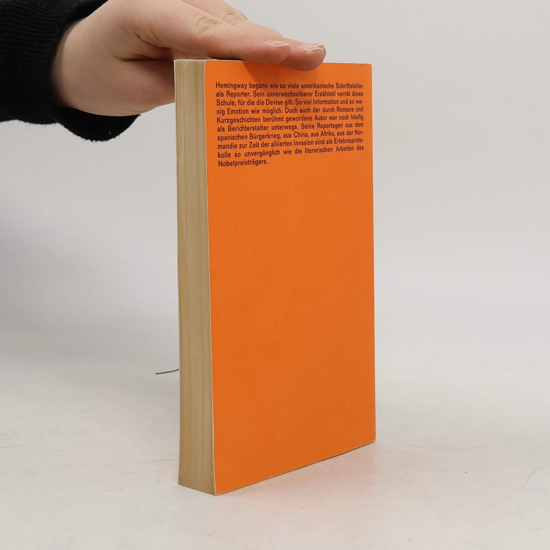 Ausgewählte Zeitungsberichte und Reportagen aus den Jahren 1920 - 1956 Hemingway begann wie so viele amerikanische Schriftsteller als Reporter. Sein unverwechselbarer Erzählstil verrät diese Schule, für die die Devise gilt: so viel Information und so wenig Emotion wie möglich. Doch auch der durch Romane und Kurzgeschichten berühmt gewordene Autor war noch häufig als Berichterstatter unterwegs. Seine Reportagen aus dem Spanischen Bürgerkrieg, aus China, aus Afrika, aus der Normandie zur Zeit der alliierten Invasion sind als Erlebnisprotokolle so unvergänglich wie die literarischen Arbeiten des Nobelpreisträgers.