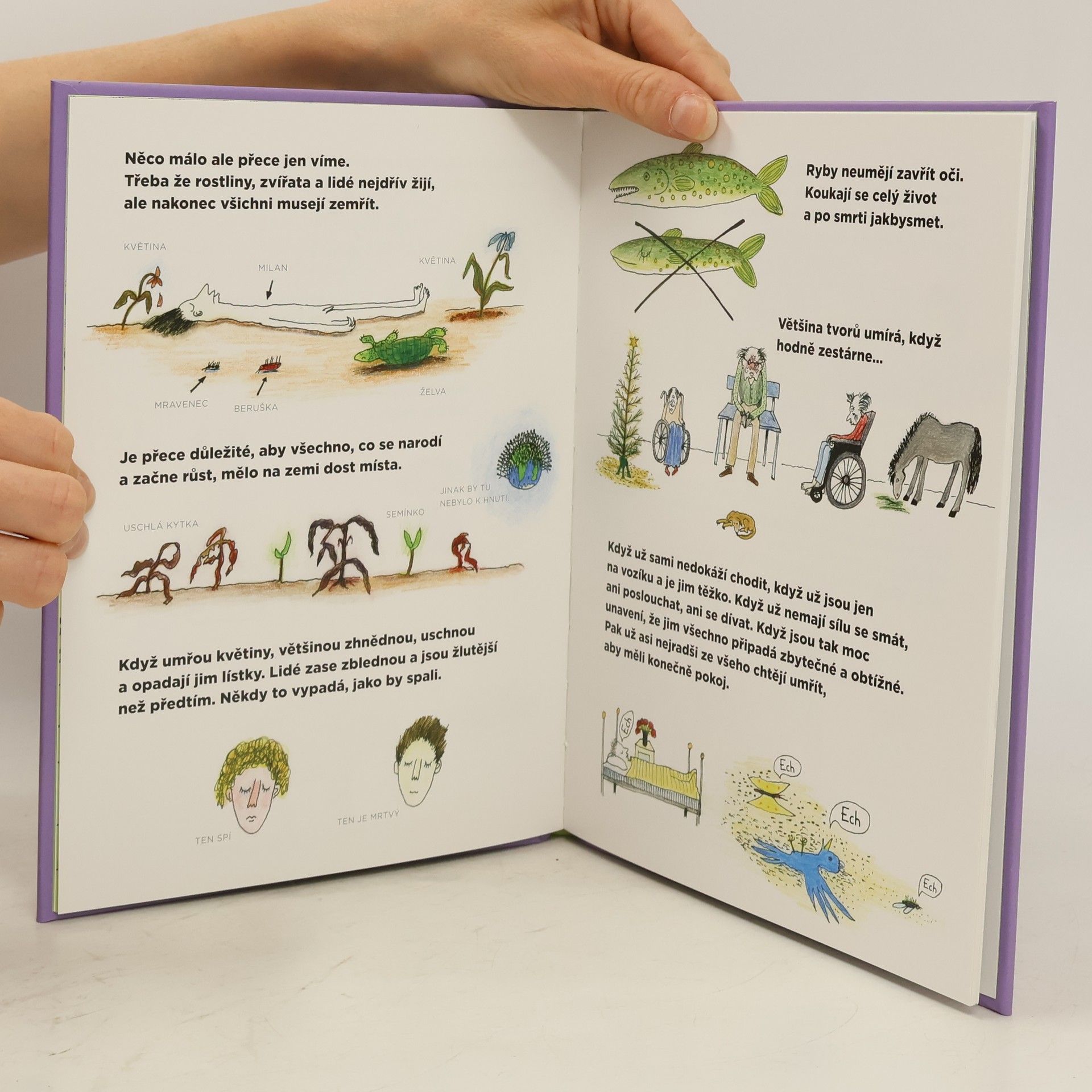 Švédská spisovatelka píše pro děti o tom, že život je konečný a lidé časem umírají. Těžké téma je zobrazeno překvapivě svižně a s milým humorem, zároveň i s něhou a důstojností. Kniha je plna kouzelných obrázků a nebude děti lekat ani strašit. Je určena čtenářům přibližně od 5 do 12 let a také jejich rodičům, prarodičům a vychovatelům jako branka, která dětem otevře nelehké téma smrti.