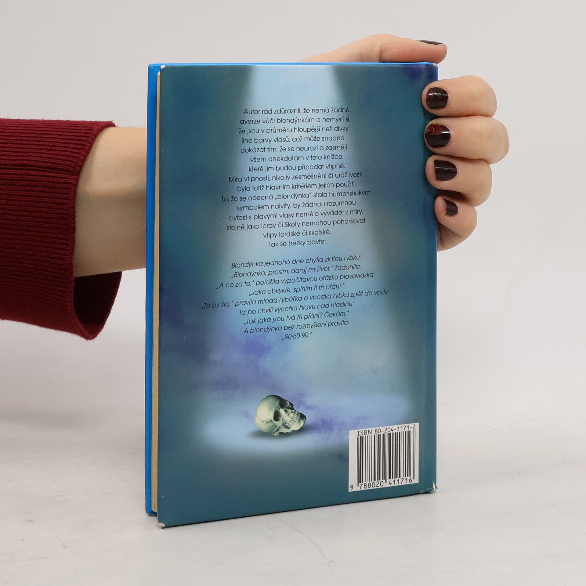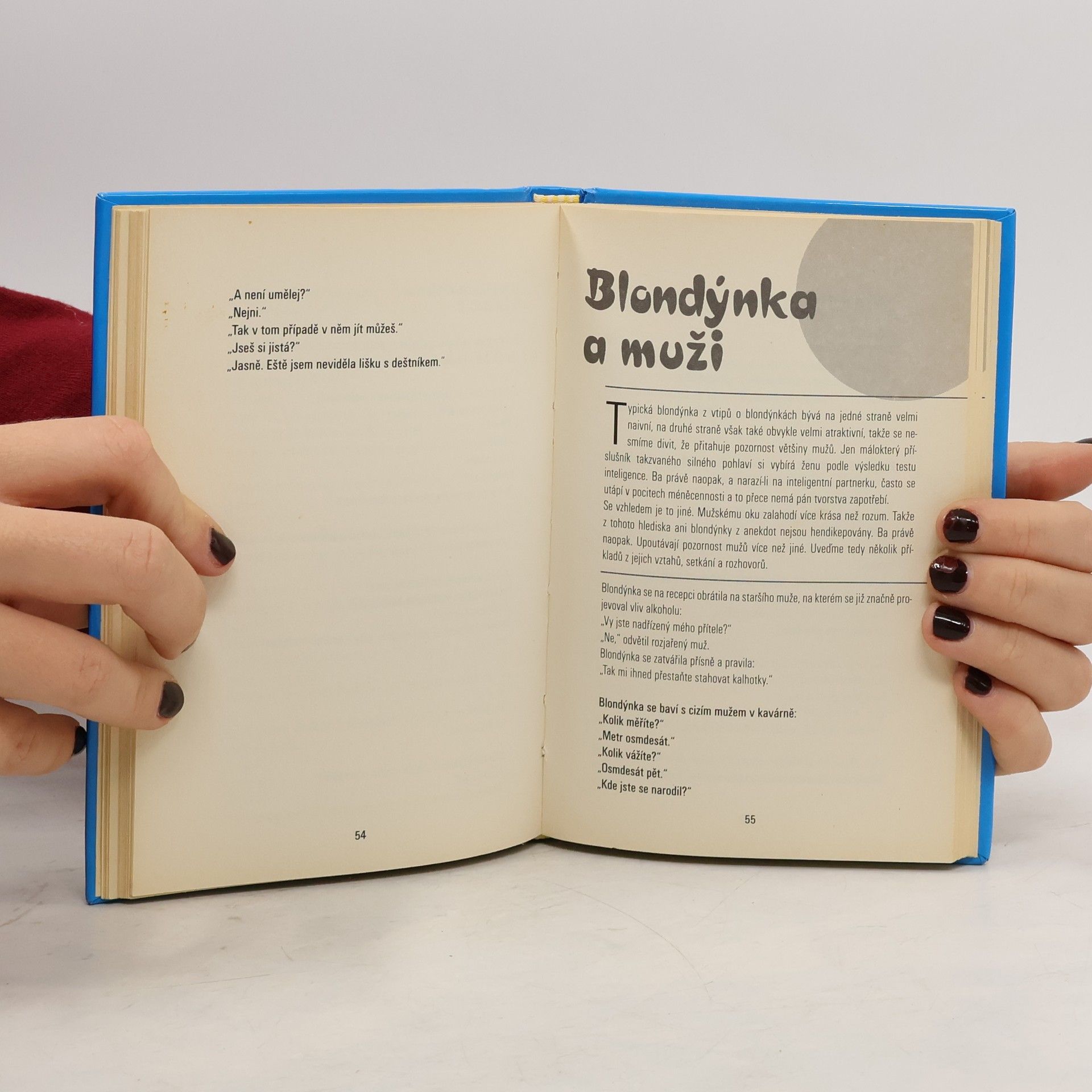 Nejlepší vtipy, anekdoty a hádanky. Autor rád zdůraznil, že nemá žádné verze vůči blondýnkám a nemyslí si, že jsou v průměru hloupější než dívky jiné barvy vlasů, což mohou snadno dokázat tím, že se neurazí a zasmějí všem anekdotám v této knížce, které jim budou připadat vtipné. Míra vtipnosti, nikoliv zesměšnění či urážlivosti, byla totiž hlavním kritériem jejich použití. Že se obecná "blondýnka" stala humoristickým symbolem naivity, by žádnou rozumnou bytost s plavými vlasy nemělo vyvádět z míry, stejně jako lordy či Skoty nemohou pohoršovat vtipy lordské či skotské. Tak se hezky bavte.