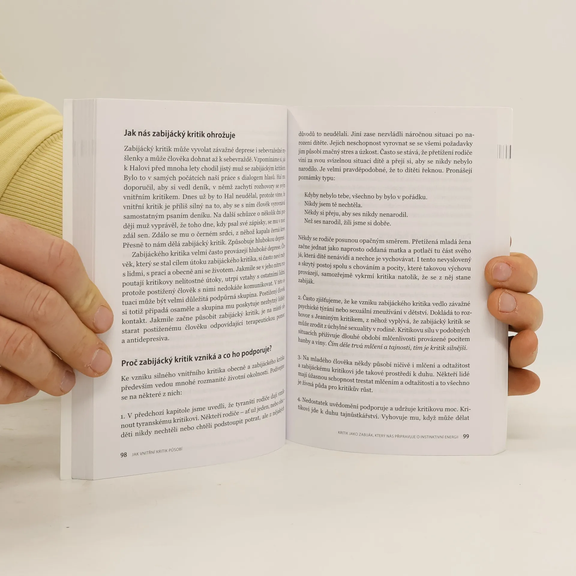 Vnitřní kritik je ta složka nás samých, kterou jsme v dětství vytvořili, aby nám pomohla adaptovat se na okolí a uchránila nás před studem a bolestí. Zvnitřnili jsme si ji mnohdy natolik, že už si její působení ani neuvědomujeme. Tím víc nás vnitřní kritik ochromuje a přispívá k tomu, že se cítíme neschopní a nešťastní. Autoři ve své knize ukazují, jak tohoto vnitřního kritika rozeznat, jak ohodnotit jeho sílu a jak ji transformovat, aby se z kritika stal ochránce a zdroj objektivního hodnocení. Kniha mj. obsahuje sebeposuzovací test, četné příklady výroků, jimiž se jednotlivé typy vnitřního kritika projevují, výňatky z terapeutických rozhovorů a různá cvičení. Autoři též poukazují na různé podoby vnitřního kritika u žen a u mužů a také na jeho projevy ve vztazích. Popisují, jak vnitřní kritik souvisí s objevováním vlastního vnitřního dítěte a jak se jim oběma člověk může stát rodičem. Vnitřní kritik je jedním z mnoha „já“ či „podosobností“, které obývají naše nitro. Práce s ním, jak ji autoři prezentují, dobře a prospěšně ilustruje metodu voice dialogues, kterou se manželé Stoneovi celosvětově proslavili.