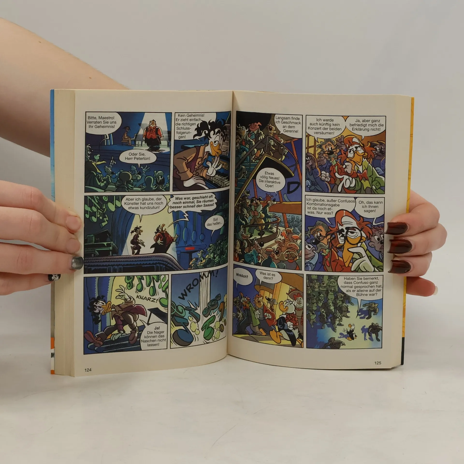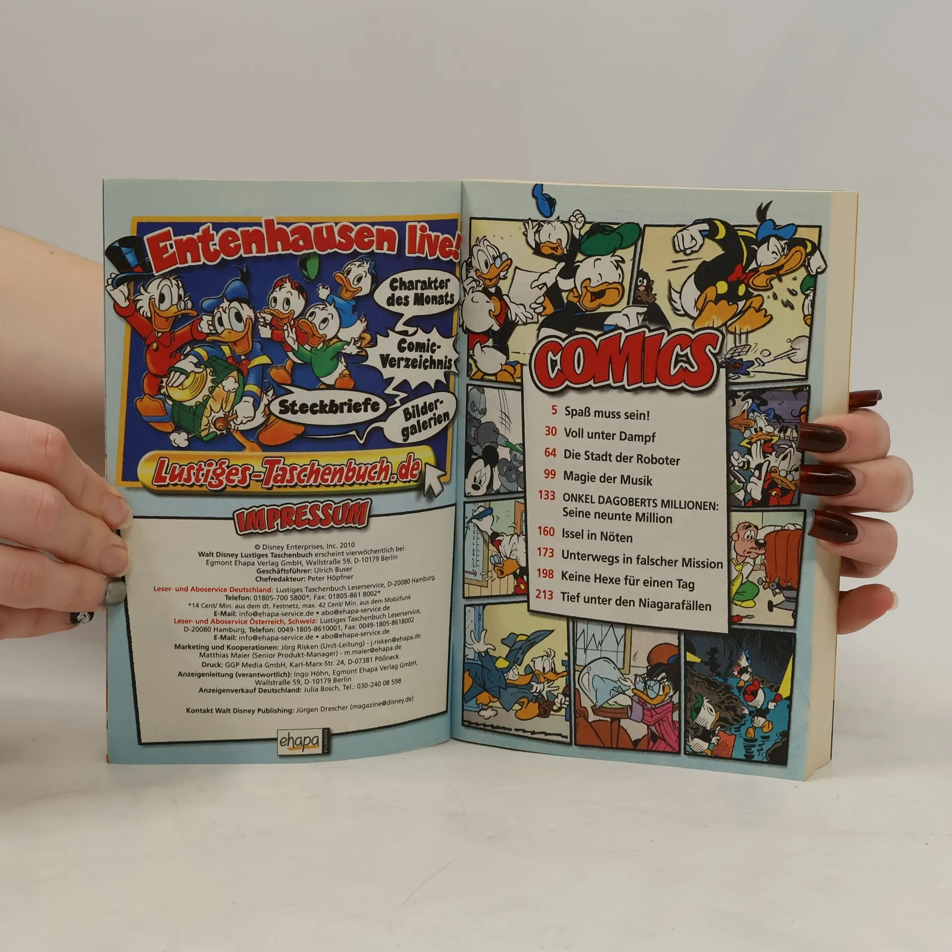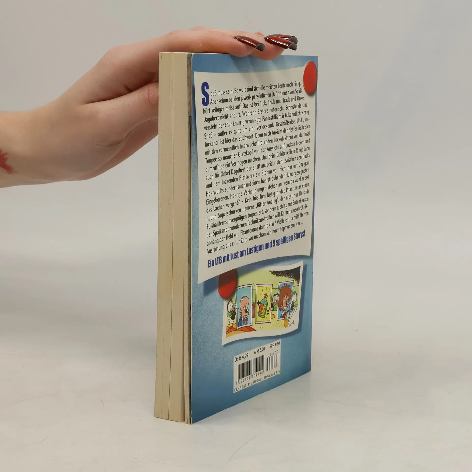 Spaß muss sein! So weit sind sich die meisten Leute noch einig. Aber schon bei den jeweils persönlichen Definitionen von Spaß hört selbiger meist auf. Das ist bei Tick, Trick und Track und Onkel Dagobert nicht anders. Während Erstere notorische Scherzbolde sind, versteht der eher knurrig veranlagte Fantastilliardär bekanntlich wenig Spaß – außer es geht um eine verlockende Geschäftsidee. Und „verlockend“ ist hier das Stichwort. Denn nach Ansicht der Neffen ließe sich mit den vermeintlich haarwuchsfördernden Lockoblättern von der Insel Toupee so mancher Glatzkopf von der Aussicht auf Locken locken und demzufolge ein Vermögen machen. Und beim Geldscheffeln fängt dann auch für Onkel Dagobert der Spaß an. Leider steht zwischen den Ducks und dem lockenden Blattwerk ein Stamm von nicht nur mit üppigem Haarwuchs, sondern auch mit einem haarsträubenden Humor gesegneten Eingeborenen. Haarige Verhandlungen stehen an, wem da wohl zuerst das Lachen vergeht? – Kein bisschen lustig findet Phantomias einen neuen Superschurken namens „Ritter Analog“, der nicht nur Donalds Fußballfernsehvergnügen torpediert, sondern gleich ganz Entenhausen den Spaß an der modernen Technik austreiben will. Kommt ein so technikabhängiger Held wie Phantomias damit klar? Vielleicht ja mithilfe von Ausrüstung aus einer Zeit, wo mechanisch noch topmodern war ...Ein LTB mit Lust am Lustigen und 9 spaßigen Storys!