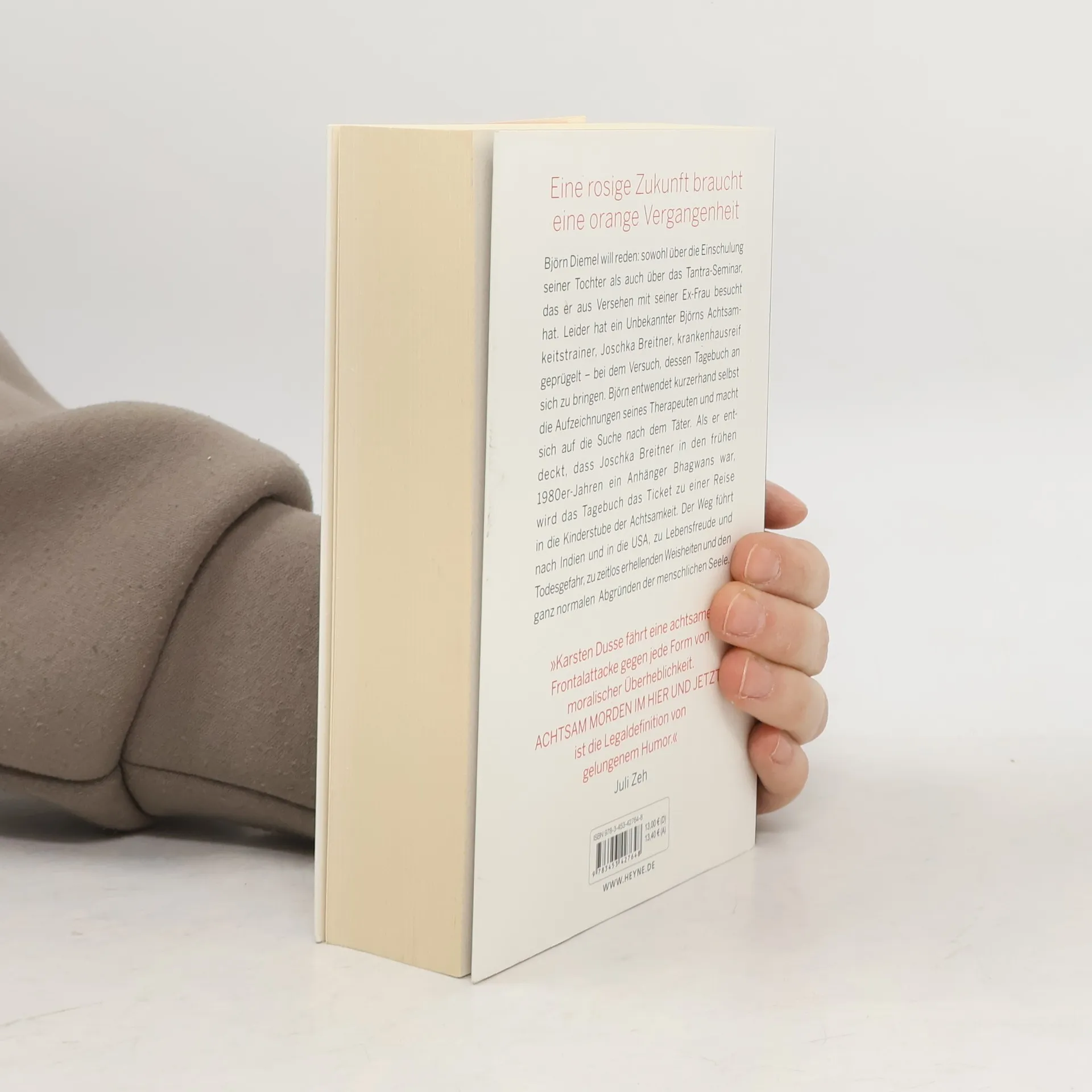 Wenn die Vergangenheit deines Therapeuten deiner Zukunft im Weg steht, ist es Zeit, im Hier und Jetzt zu leben Björn Diemel will reden: sowohl über die Einschulung seiner Tochter als auch über das Tantra-Seminar, das er aus Versehen mit seiner Ex-Frau besucht hat. Leider hat ein Unbekannter Björns Achtsamkeitstrainer, Joschka Breitner, krankenhausreif geprügelt – bei dem Versuch, dessen Tagebuch an sich zu bringen. Björn entwendet kurzerhand selbst die Aufzeichnungen seines Therapeuten und macht sich auf die Suche nach dem Täter. Als er entdeckt, dass Joschka Breitner in den frühen 1980er Jahren ein Anhänger Bhagwans war, wird das Tagebuch das Ticket zu einer Reise in die Kinderstube der Achtsamkeit. Der Weg führt nach Indien und in die USA, zu Lebensfreude und Todesgefahr, zu zeitlos erhellenden Weisheiten und den ganz normalen Abgründen der menschlichen Seele.