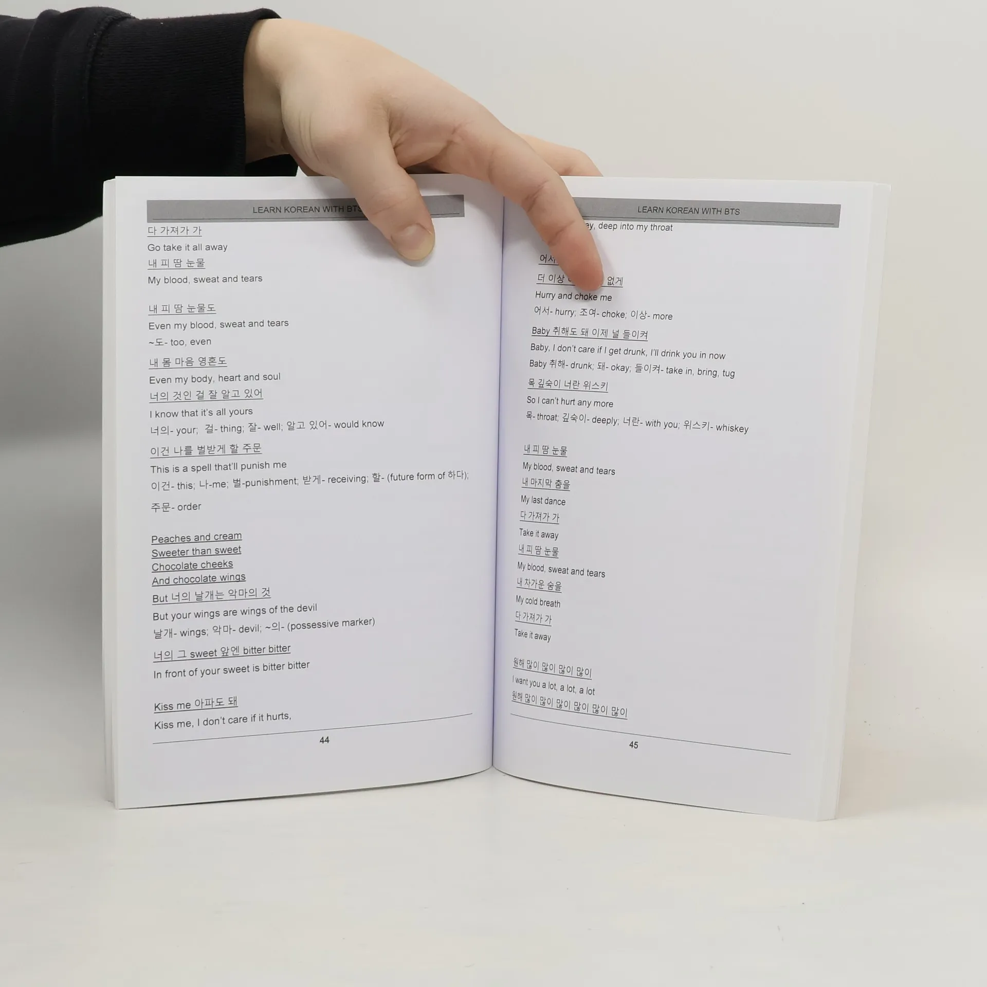 Ride the BTS rocket to Korean languge skills. Made for the Korean language student, ARMY or fan of K-pop. Introductory alphabet and grammar section. Korean lyrics are translated into English with extensive notes that decode the syntax and meaning- making lyrics and the cadence of lyrics a powerful learning tool. Your favorite, glorious BTS songs- “Fire”, “Blood, Sweat, and Tears”, “Not Today”, “I Need You”, “Danger”, “War of Hormone”, and many other world beating hits.