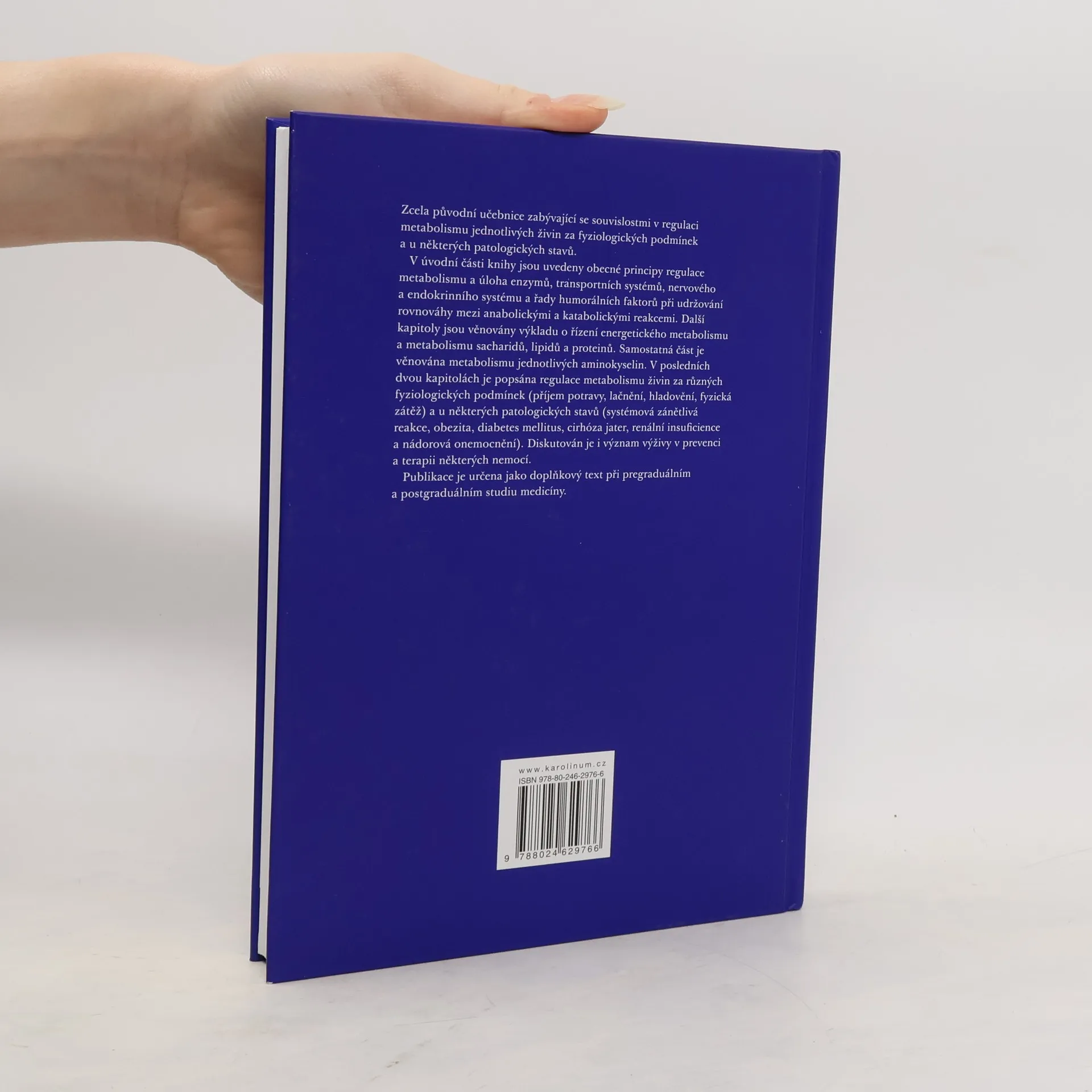Zcela původní učebnice zabývající se souvislostmi v regulaci metabolismu jednotlivých živin za fyziologických podmínek a u některých patologických stavů. V úvodní části knihy jsou uvedeny obecné principy regulace metabolismu a úloha enzymů, transportních systémů, nervového a endokrinního systému a řady humorálních faktorů při udržování rovnováhy mezi anabolickými a katabolickými reakcemi. Další kapitoly jsou věnovány výkladu o řízení energetického metabolismu a metabolismu sacharidů, lipidů a proteinů. Samostatná část je věnována metabolismu jednotlivých aminokyselin. V posledních dvou kapitolách je popsána regulace metabolismu živin za různých fyziologických podmínek (příjem potravy, lačnění, hladovění, fyzická zátěž) a u některých patologických stavů (systémová zánětlivá reakce, obezita, diabetes mellitus, cirhóza jater, renální insuficience a nádorová onemocnění). Diskutován je i význam výživy v prevenci a terapii některých nemocí. Publikace je určena jako doplňkový text při pregraduálním a postgraduálním studiu medicíny.