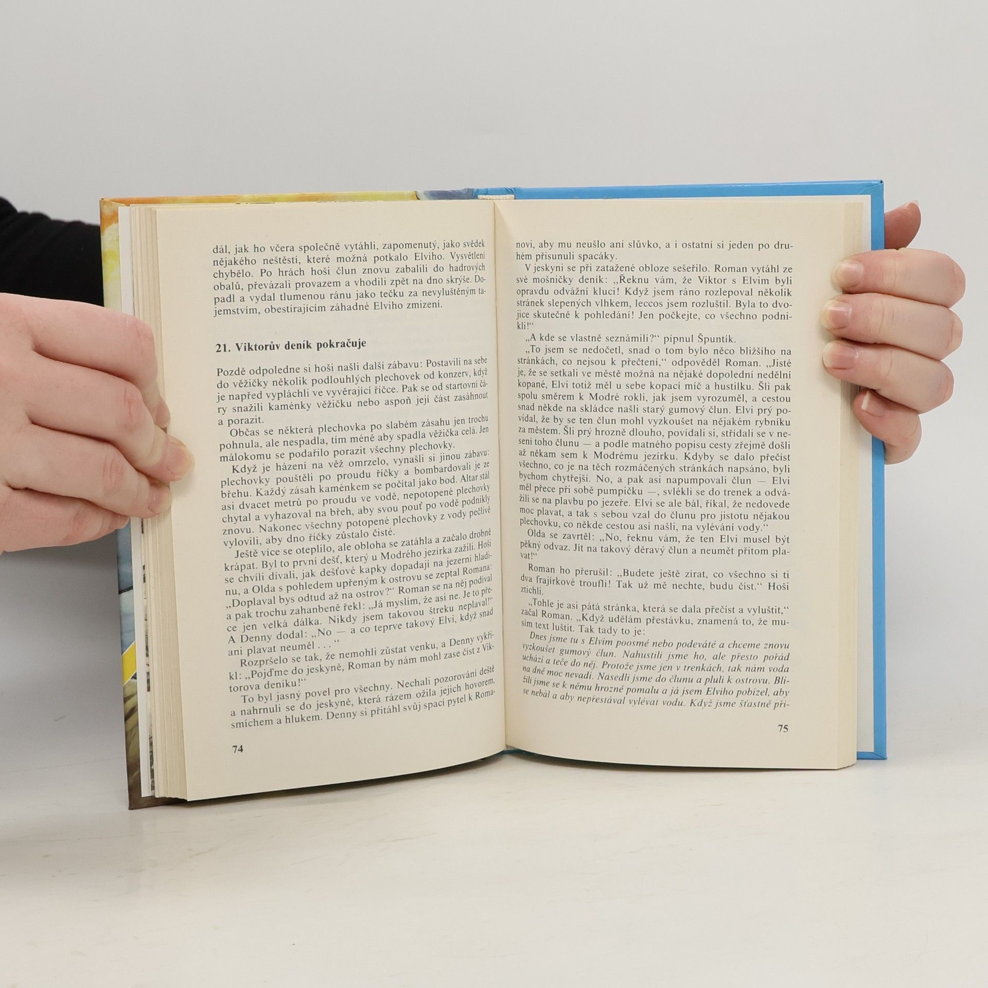Hlavní postavou knihy je třináctiletý sportovec Denny, který se vážně zraní na kluzišti. V nemocnici se seznámí s vrstevníkem Oldou a ten jej později přivede do klubu Saturn. S novými kamarády prožije Denny mnohá dobrodružství. Jednou se společně vydají do opuštěného lomu pro jakousi namodralou hlínu, kterou vykupují dva kumpáni, Haryk a Milda. Přitom objeví krasovou oblast plnou skalisek a podzemních prostor, částečně nepřístupných. U jezera velké rozlohy přijdou na stopu dvou neznámých školáků a zjistí, že jeden záhadně zmizel a druhý ho marně hledá. Pouze zpola zatopený člun skýtá jakési tragické vysvětlení. Rozhodnou se pomoci kamarádovi v jeho pátrání a rozluštit záhadu. Na tomto nádherném místě vrcholí později jejich příběh prázdninovým táborem. Ilustroval Miroslav Schönberg. Pozdnámka: Na titiluní straně žlutý proužek "1. knižní vydání". Obsahuje doslov Jaroslava Foglara a ediční poznámku (Václav Nosek-Windy). Další vydání byla doplněna o další čtyři kapitoly.