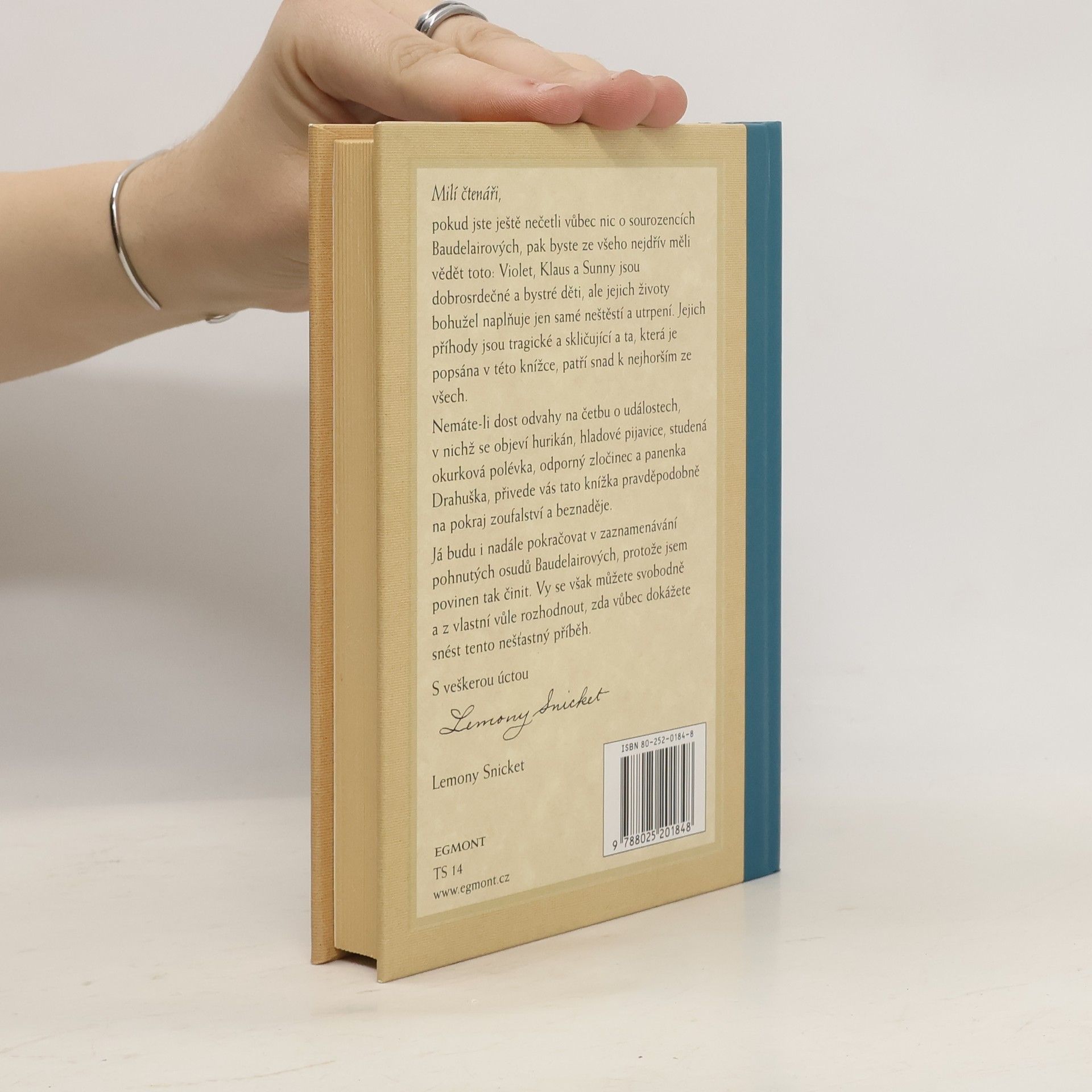 Pokud jste ještě nečetli vůbec nic o sourozencích Baudelairových, pak byste ze všeho nejdřív měli vědět toto: Violet, Klaus a Sunny jsou dobrosrdečné a bystré děti, ale jejich životy bohužel naplňuje jen samé neštěstí a utrpení. Jejich příhody jsou tragické a skličující a ta, která je popsána v této knížce, patří snad k nejhorším ze všech. Nemáte-li dost odvahy na četbu o událostech, v nichž se objeví hurikán, hladové pijavice, studená okurková polévka, odporný zločinec a panenka Drahuška, přivede vás tato knížka pravděpodobně na pokraj zoufalství a beznaděje. Autor však i nadále bude pokračovat v zaznamenávání pohnutých osudů Baudelairových, protože je povinen tak činit.