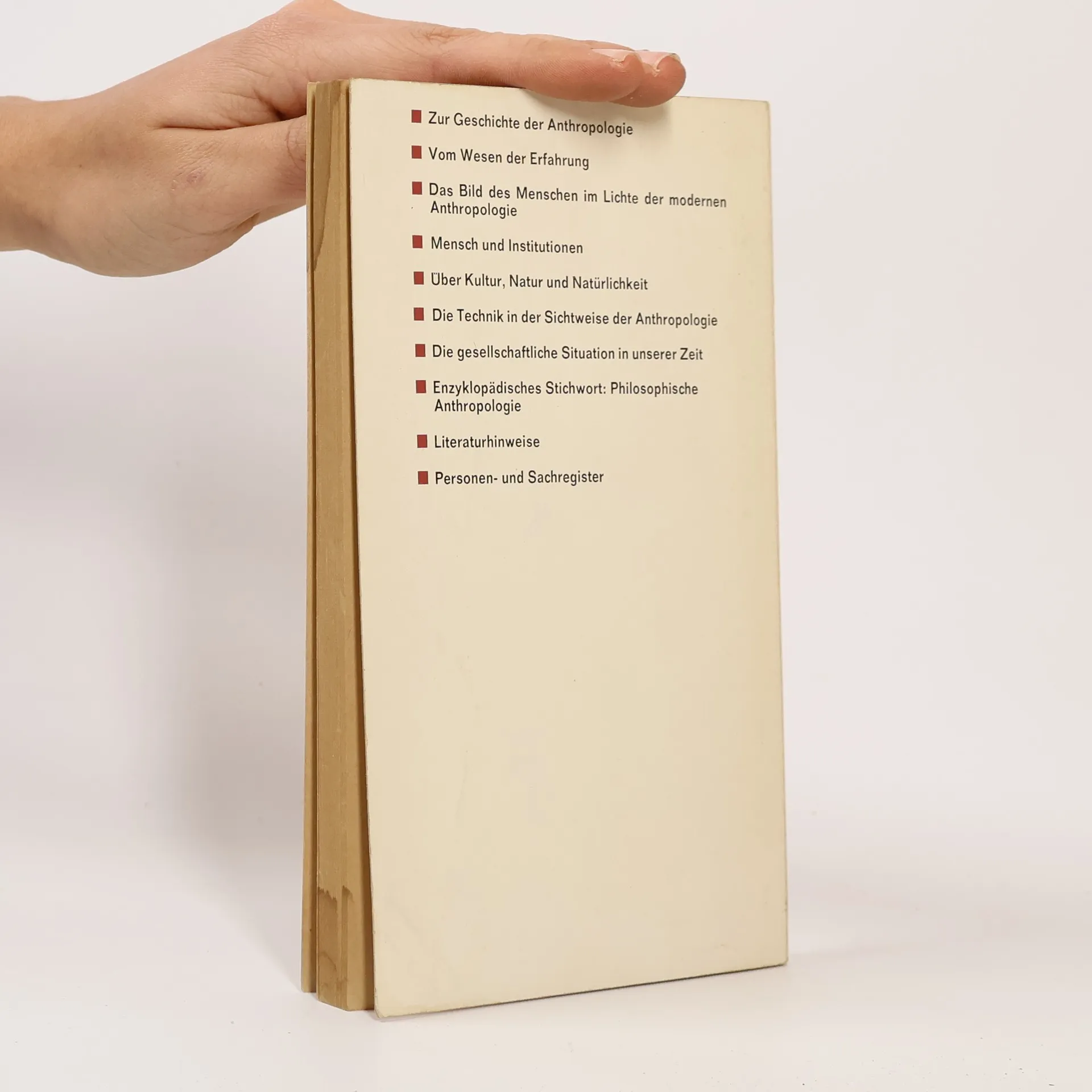 ■ Zur Geschichte der Anthropologie ■ Vom Wesen der Erfahrung ■ Das Bild des Menschen im Lichte der modernen Anthropologie ■ Mensch und Institutionen ■ Über Kultur, Natur und Natürlichkeit ■ Die Technik in der Sichtweise der Anthropologie ■ Die gesellschaftliche Situation in unserer Zeit ■ Enzyklopädisches Stichwort: Philosophische Anthropologie ■ Literaturhinweise ■ Personen- und Sachregister