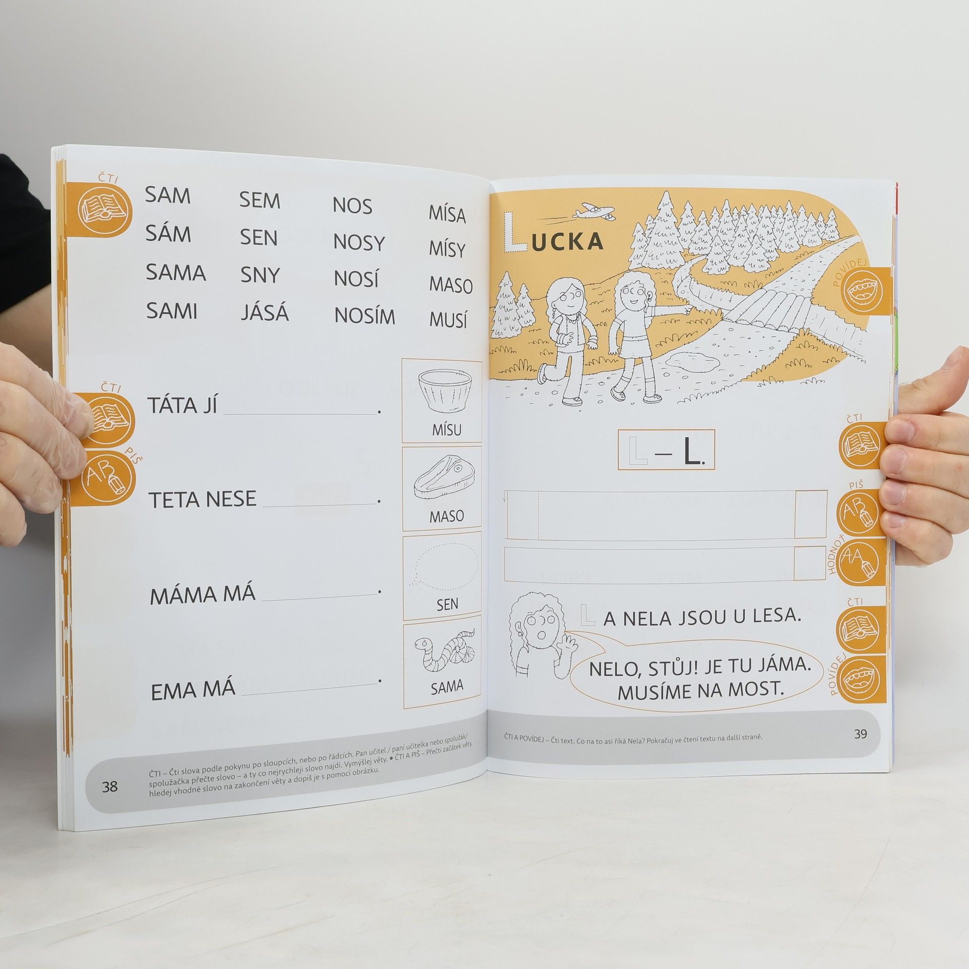 Pracovní učebnice je součástí řady ČJ 1 - genetická metoda. Pracovní učebnice spolu se sešitem Uvolňovací cviky pro rozvoj grafomotoriky pokrývá období zhruba první poloviny školního roku. Úvodní část je věnovaná motivaci dítěte a průpravnému čtenís nezastupitelnými obrázky, které děti nejen „čtou", ale i „píší". Důraz je kladen na formulaci sdělení a myšlenek, k jejichž záznamu se od začátku využívá kresby a symbolu. Na tuto část plynule navazuje nácvik čtení i psaní velkých písmen celé abecedy a čtení slov i vět podle získaných zkušeností a zvyšující se obratnosti dětí. Vyvození jednotlivých písmen vychází ze jmen dětí jedné fiktivní první třídy a jejich zážitků a příběhů. Nechybí ani nácvik samostatného písemného projevu dítěte. Učebnice je dvojbarevná a nabízí řadu tvořivých námětů. Funkční ilustrace poskytují prostor nejen pro výuku, ale i pro potěšení dětí v době mimo vyučování. V dolní části stránek se nachází lišta se stručnými pokyny pro práci dítěte v případě jeho nepřítomnosti ve škole.