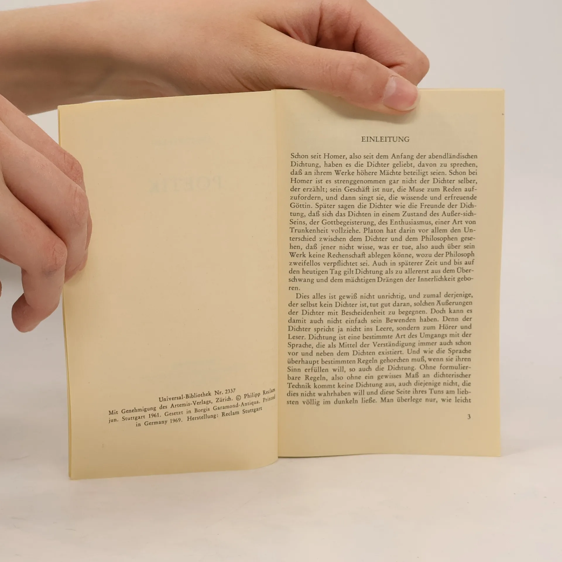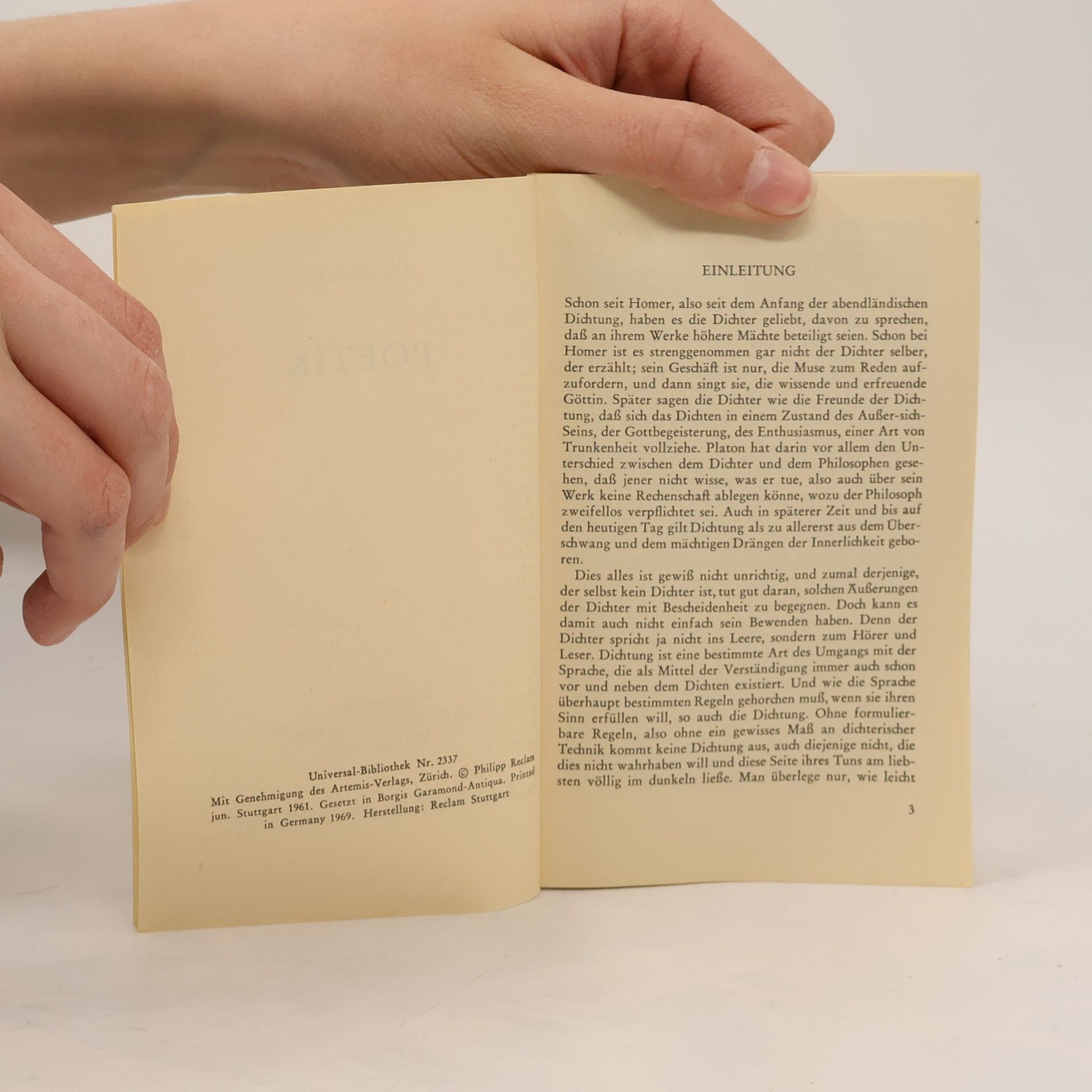 Die »Poetik« ist im Kern ein Lehrvortrag des Aristoteles über die Dichtkunst. Aristoteles lehrt die Grundlagen der Dichtung und exemplifiziert dies anhand zweier großer Dramenformen – der Tragödie und des Epos. Zentrale Begriffe wie die »Mimesis«, die Nachahmung der Wirklichkeit, sowie die »Katharsis«, das Auslösen eines emotionalen Reinigungsprozesses, sind wesentliche Komponenten seiner Theorie, die auch nach 2000 Jahren nicht an Bedeutung verloren haben. Der berühmte Altphilologe Manfred Fuhrmann untersucht in diesem zweisprachigen Band Struktur und Kernthemen des Werkes und nimmt eine philosophische Verortung vor. Sprachen: Deutsch, Griechisch (bis 1453)