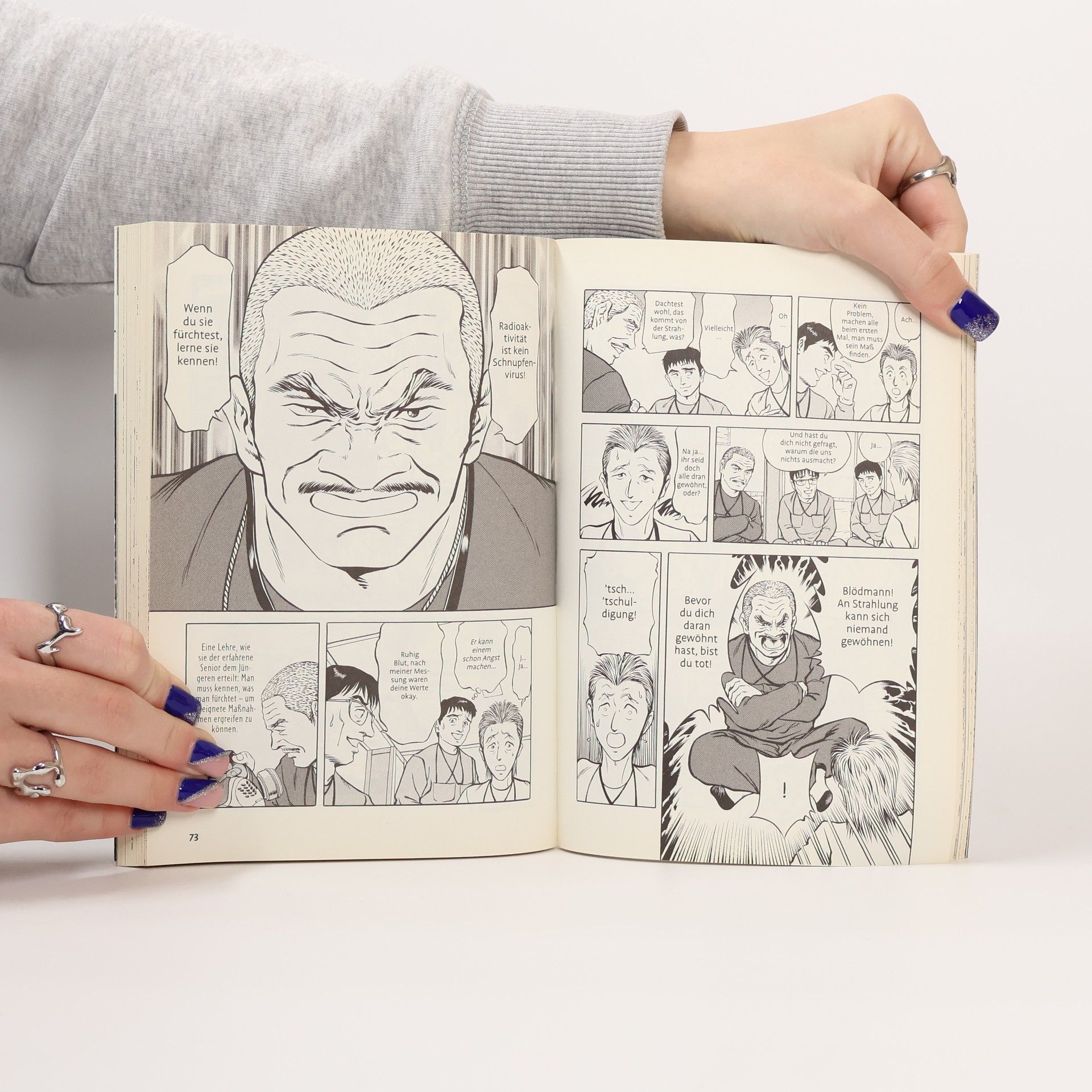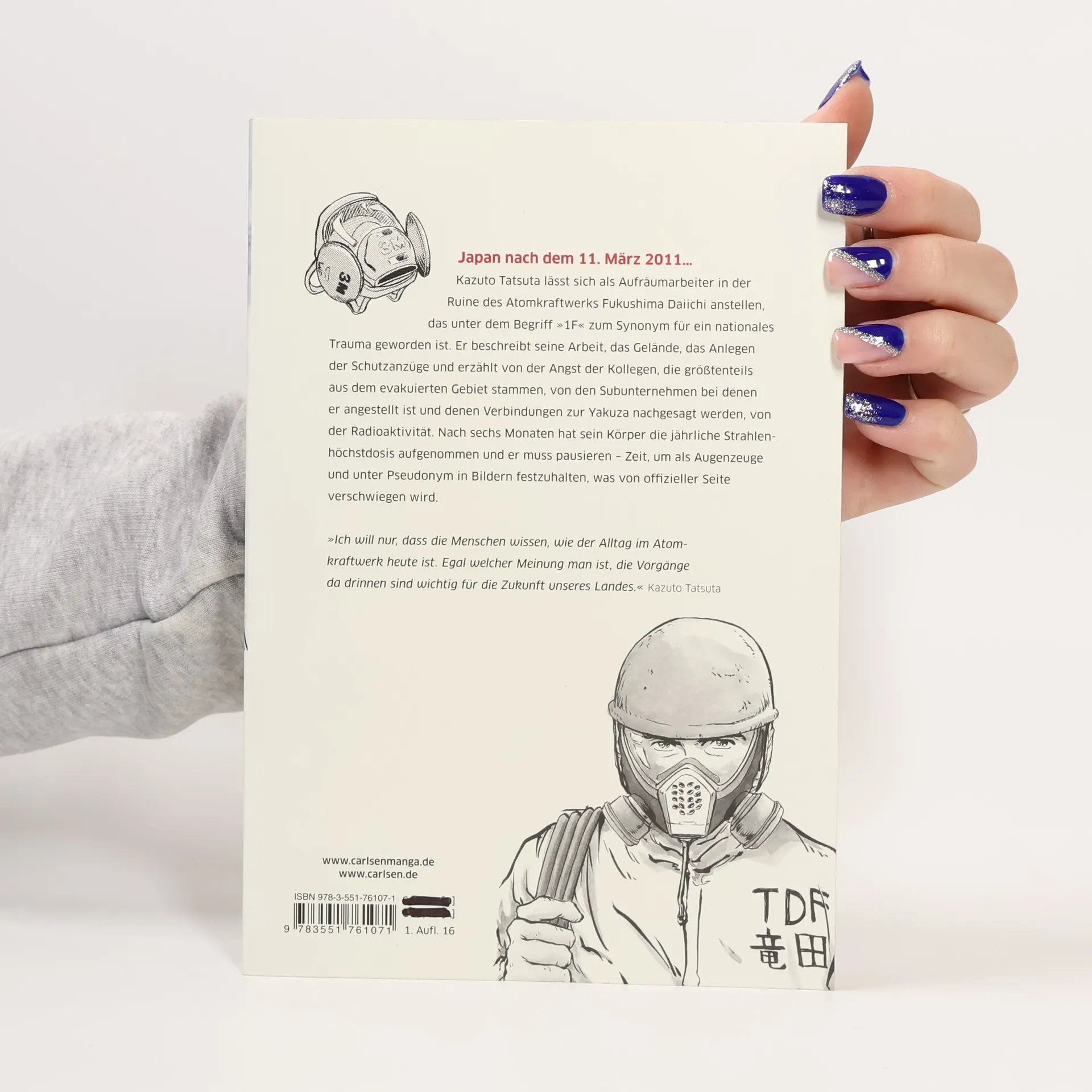 Kazuto Tatsuta lässt sich als Aufräumarbeiter in der Ruine des Atomkraftwerks Fukushima Daiichi anstellen, das in Japan als »1F« zum Synonym für ein nationales Trauma geworden ist. Neutral und sachlich beschreibt er seine Arbeit, das Gelände, die Prozedur des Anlegens der Schutzanzüge. Er erzählt von der Angst der Kollegen, die größtenteils aus dem evakuierten Gebiet stammen, von den Subunternehmen bei denen er angestellt ist und denen Verbindungen zur Yakuza nachgesagt werden, von der Radioaktivität ─ nach zwei Monaten hat sein Körper die jährliche Strahlenhöchstdosis aufgenommen und er muss pausieren. Zeit, um als Augenzeuge unter einem Pseudonym seinen Manga zu zeichnen und in Bildern festzuhalten, was von offizieller Seite verschwiegen wird. In seinem Bericht verwischt Kazuto Tatsuta die Grenze zwischen Unterhaltung und Journalismus. Als Augenzeuge ist es dem Mangaka möglich, die Arbeit im Kraftwerk nach dem Super-Gau detailgetreu zu schildern ─ und auch die Stimmung unter den Kollegen einzufangen.