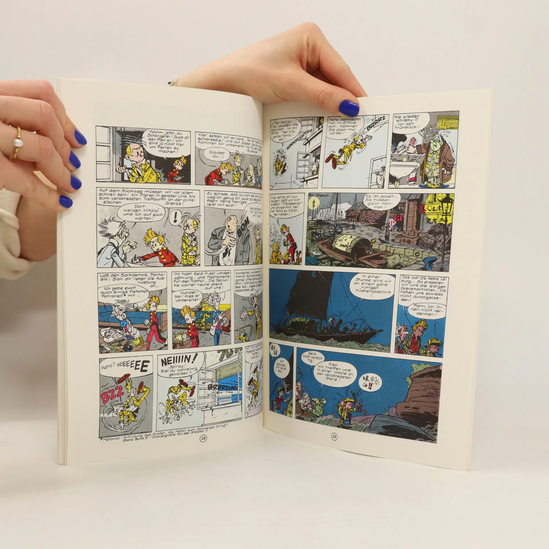 Abenteuer- und Agentengeschichte, die die Helden Spirou und Fantasio auf der Jagd nach einer auch für kriegerische Zwecke verwendbaren Erfindung bis tief ins Innere Chinas führt.