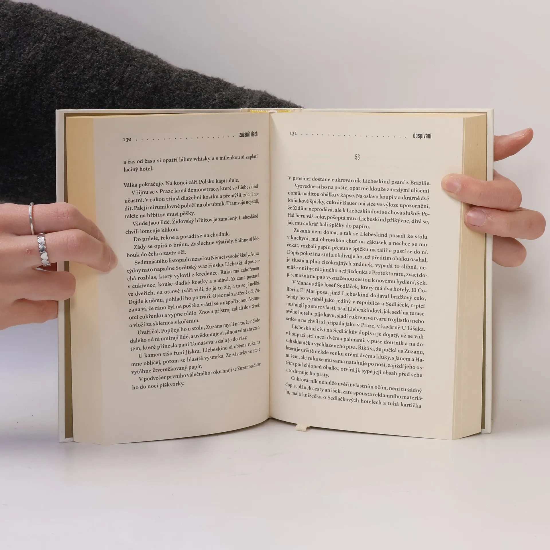 Jsou tři. Zpočátku děti. Svět je v rovnováze. Později se všechno změní. Ona miluje jednoho z nich, ji milují oba dva. Zuzana Liebeskindová je dcera cukrovarníka. Nic jí nechybí, kráčí životem lehce, obklopena láskou. Vzduchem se vznášejí vlákna přepáleného cukru. Třicátá léta dvacátého století v malém městečku Holašovice jsou sladká. Teprve během německé okupace začne Zuzana dospívat. Bolestně vrůstá do dějin a dějiny se vpisují do ní. Protože má židovský původ, je její osud předem daný. Transport. Koncentrák. Zuzanini přátelé Hanuš a Jan zůstávají v Holašovicích. Jejich cesty se však rozcházejí. Po skončení války se Zuzana vrací z koncentračního tábora, ztráty jsou ale větší, než čekala. Dokáže po všem, co prožila, ještě milovat? A má vůbec na výběr?
