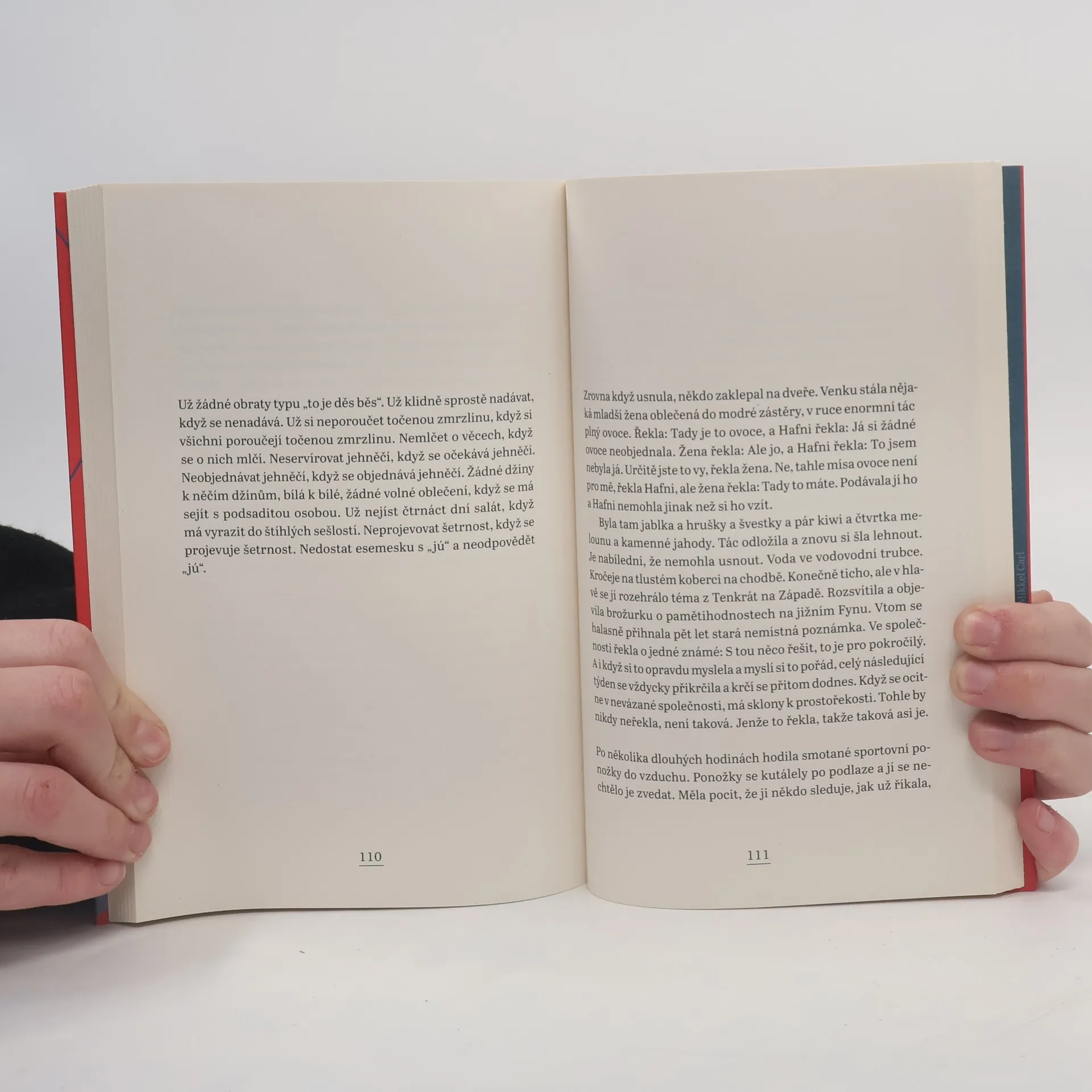 Hafni vypráví… že se rozvádí. Je jí devětačtyřicet, opouští vyhaslý rodinný krb a rozhodne se vydat na cestu po restauracích, kde se podávají tradiční dánské chlebíčky smørrebrød – bohatě obložené plátky černého žitného chleba, které se jedí příborem a tvoří esenci dánské kuchyně. Hafniina kulinární cesta z ostrova Sjælland na ostrov Fyn je radikálním pokusem změnit zaběhlý život. Během svého putování zažívá banální, ale zábavná setkání s nejrůznějšími samorosty, svérázy, ale taky s úplně normálními lidmi. Kniha neotřele líčí dánskou mentalitu a kulturu, a přitom vyjadřuje cosi obecně lidského a rozpoznatelného. Autorka vypráví příběh neprůbojné, ale silné ženy na prahu nové životní kapitoly, který obsahuje groteskní momenty, účtování, ale samozřejmě i nostalgii a smutek.