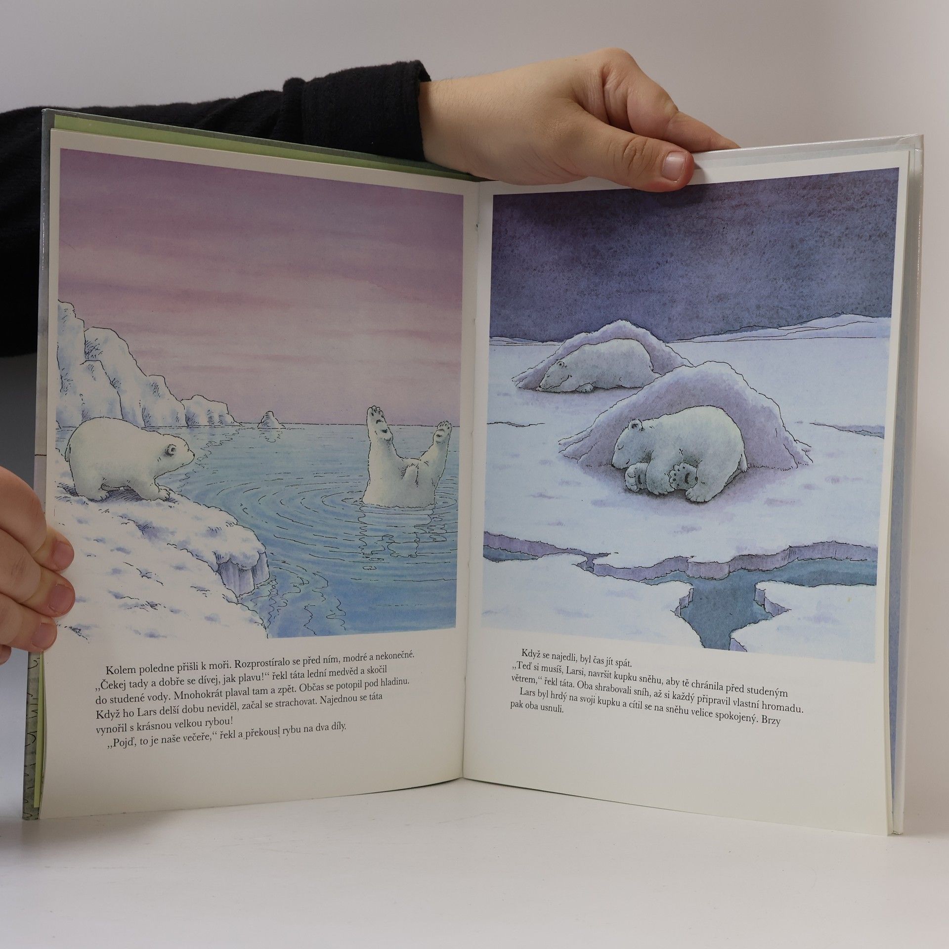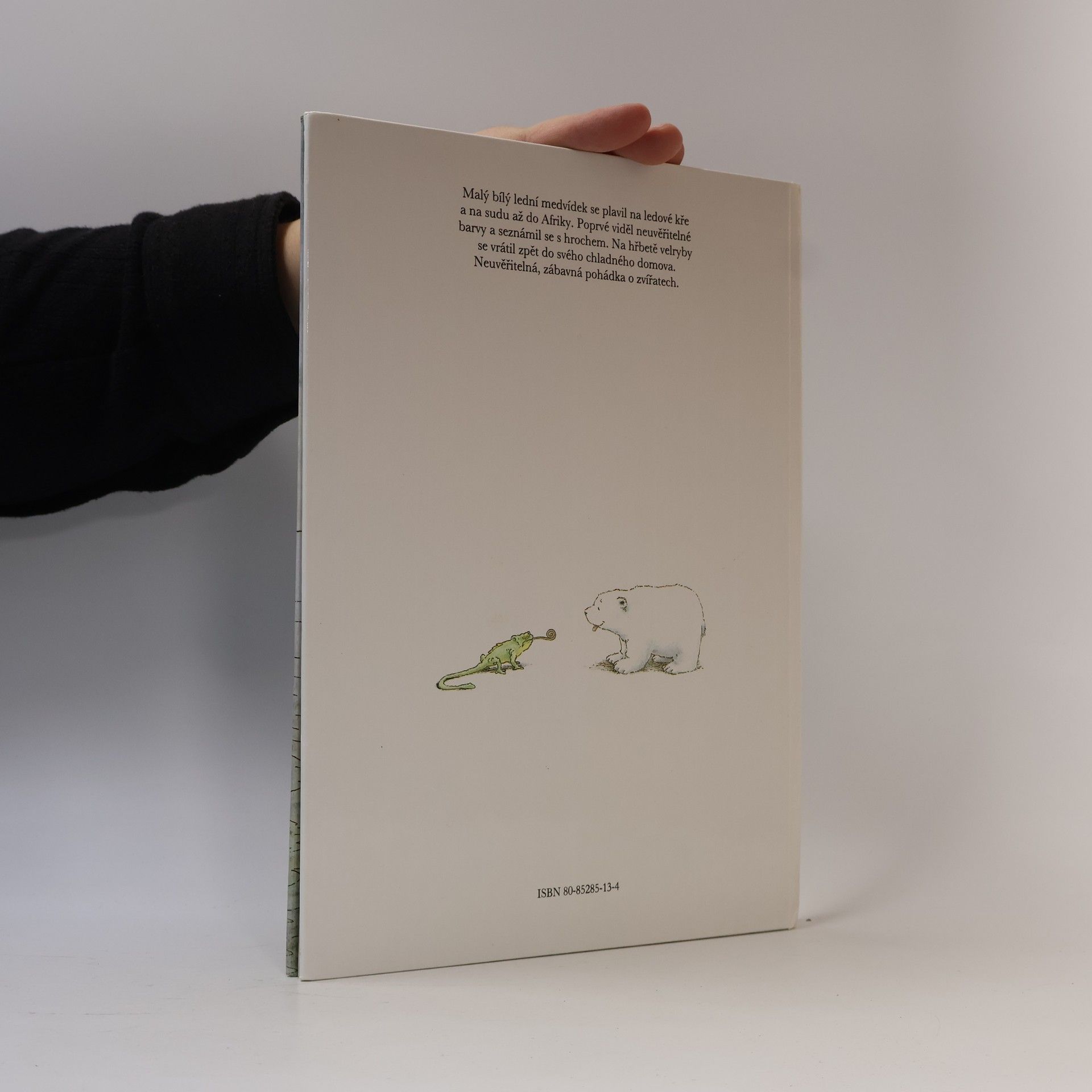 vypráví a sám ilustruje autor. Malý bílý lední medvídek se plavil na ledové kře a na sudu až do Afriky. Poprvé viděl neuvěřitelné barvy a seznámil se s hrochem. Na hřbetě velryby se vrátil zpět do svého chladného domova.