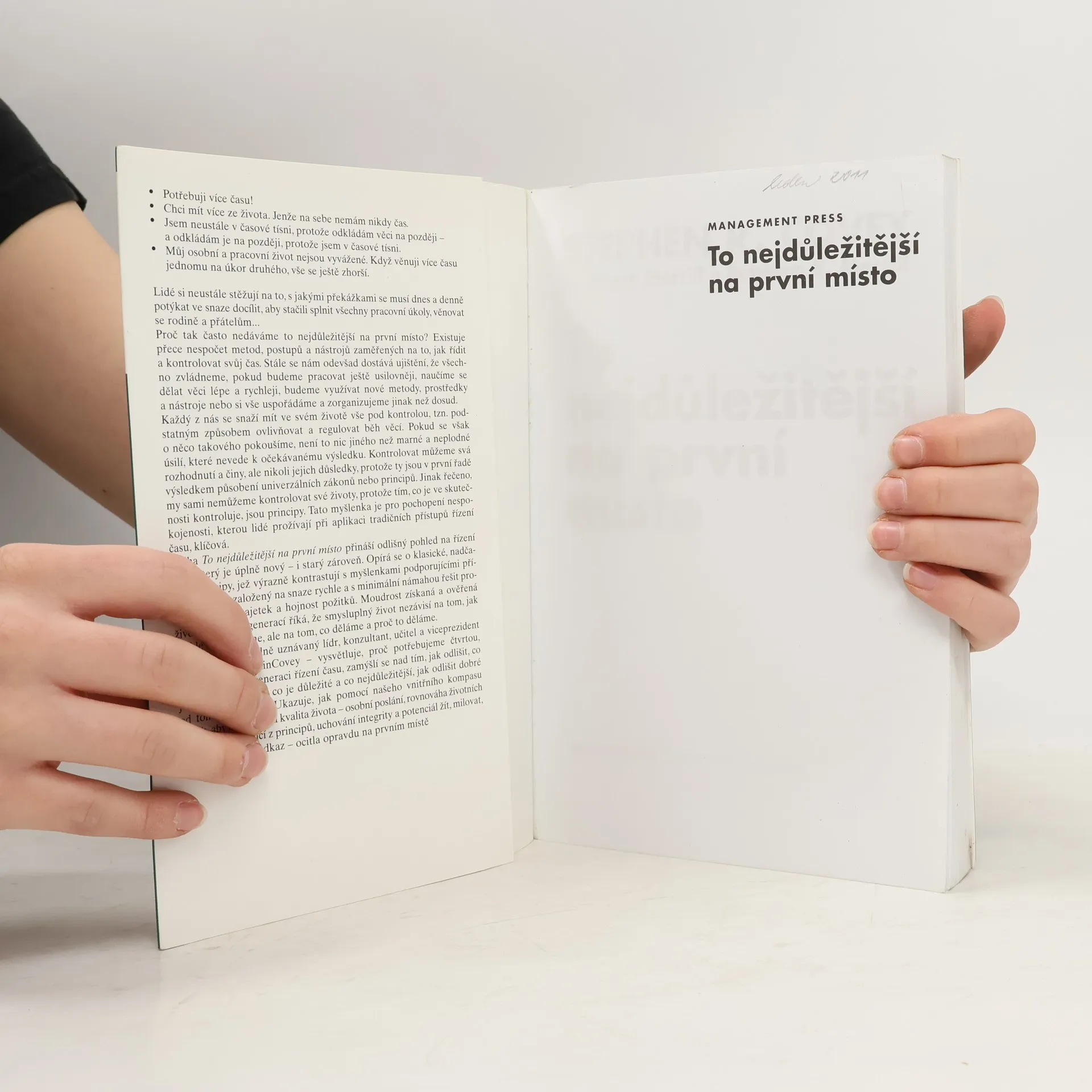 Světově proslulý autor manažerské a motivační literatury a jeho spolupracovníci zaměřují pozornost čtenářů na to, aby si kladli otázku, jaké věci jsou pro ně v jejich životě nejdůležitější. Věnují jim tolik pozornosti, péče a času, kolik by chtěli? Na rozdíl od všech tradičních knih o time managementu, jež kladou důraz především na "zvyšování efektivnosti" s využitím různých "racionalizačních" technik, Dr. Covey ukazuje, že na využívání vlastního času je možné se dívat zcela jinak. Kniha vás naučí rozlišovat mezi vašimi úkoly a určovat priority, zaměřovat se na to, co je důležité, a nikoli jen naléhavé, dávat na první místo to nejdůležitější a navozovat rovnováhu mezi vašimi osobními a pracovními povinnostmi a zájmy, abyste tak od života dostávali, to, co si přejete.
