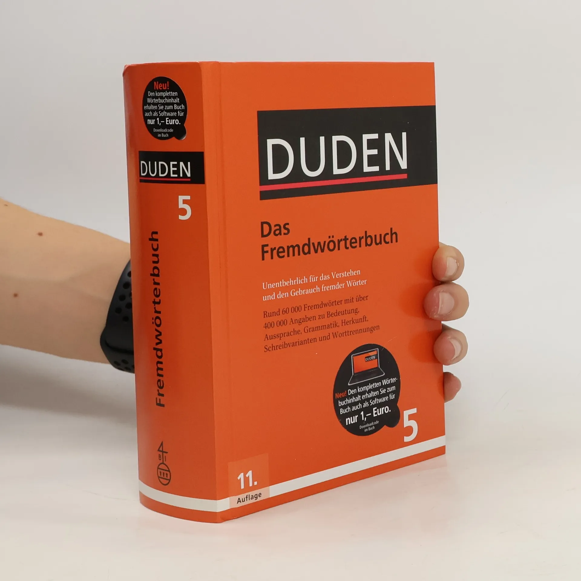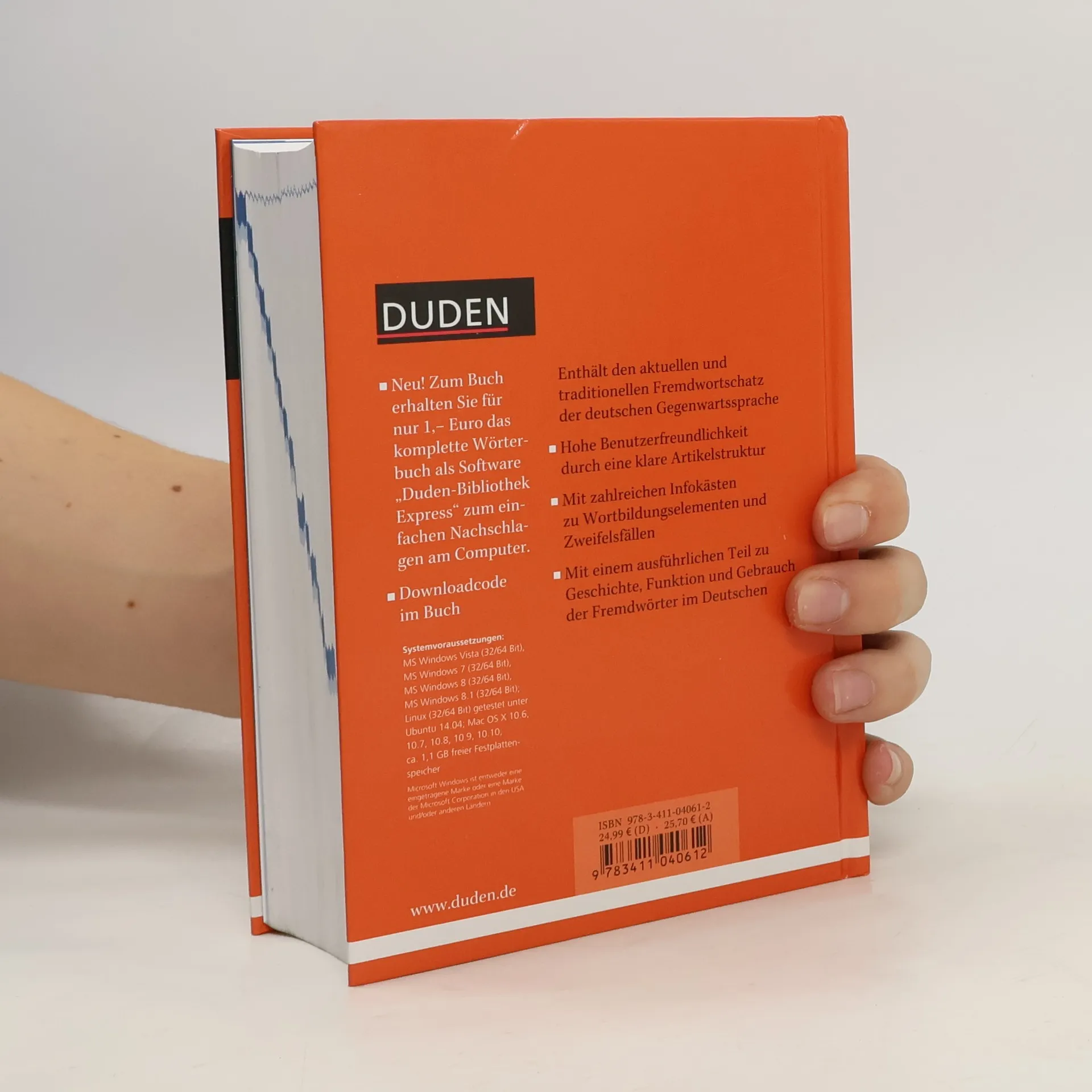 Gigathlon? Bonobo? Boyfriendjeans? Wissen Sie, was diese Fremdwörter bedeuten? Das „Duden-Fremdwörterbuch“ verzeichnet mit rund 60.000 Stichwörtern sowohl den aktuellen als auch den traditionellen Fremdwortschatz der deutschen Sprache. In die aktuelle 11. Auflage wurden rund 1.000 Stichwörter neu aufgenommen. Sie stammen vor allem aus den Gebieten Computer/Informatik, Medizin, Naturwissenschaften, Wirtschaft und Sport. Außerdem wurde der Wortschatz aus den Bereichen Medizin und Psychologie inhaltlich überarbeitet. Alle Stichwörter sind mit Angaben zur Aussprache, Grammatik, Herkunft und Bedeutung sowie zu den Stilebenen versehen. Außerdem enthält der Band Hinweisartikel zu rechtschreiblichen Zweifelsfällen und zu Wortbildungselementen wie epi-, Epi- oder akro-, Akro-. Der Download bietet ferner rund 13.000 Vertonungen. 11., vollständig überarbeitete und aktualisierte Auflage. Neu: Buchkäufer erhalten den kompletten Wörterbuchinhalt zum Buch auch als Programm „Duden-Bibliothek Express“ für das einfache Nachschlagen am Computer zum Preis von 1,- Euro (Downloadcode im Buch). Zahlreiche Suchfunktionen erleichtern die Recherche direkt beim Schreiben. „Das Fremdwörterbuch“ ist kombinierbar mit allen anderen elektronischen Wörterbüchern aus der Software-Reihe „Duden-Bibliothek“.