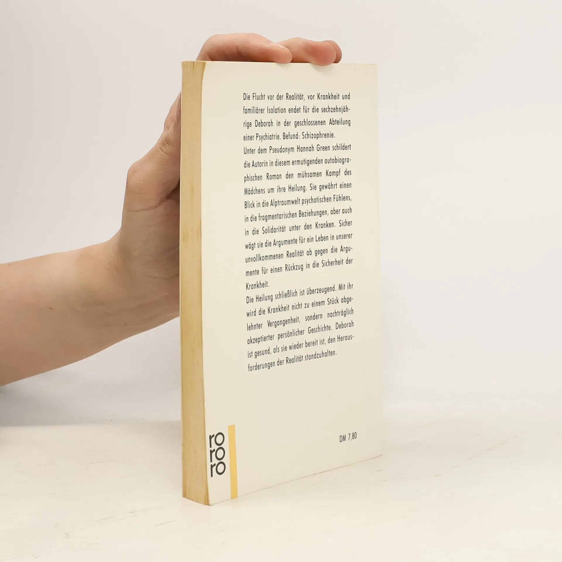 Dieses Buch erzählt die Geschichte der sechzehnjährigen Deborah Blau, die mit der Diagnose Schizophrenie in eine psychiatrische Klinik eingewiesen und nach mühsamer Behandlung und mancherlei Rückschlägen geheilt wird. Es ist die Schilderung einer Krankheit, mit der sich die Autorin als ein Stück eigener Geschichte identifiziert.