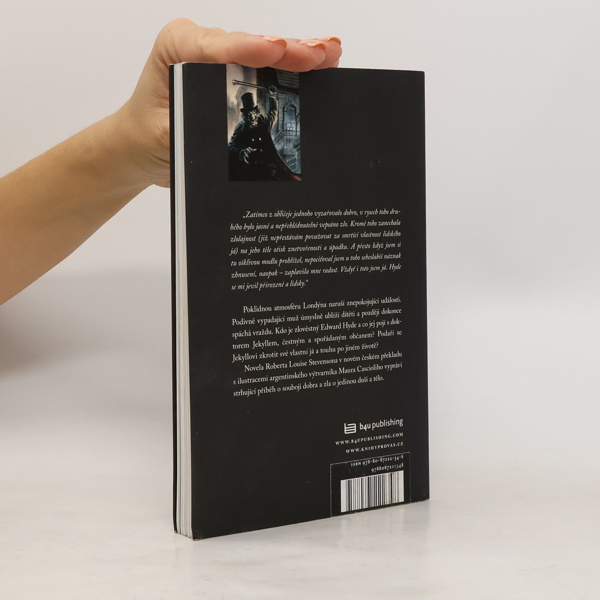 „Zatímco z obličeje jednoho vyzařovalo dobro, v rysech toho druhého bylo jasně a nepřehlédnutelně vepsáno zlo. Kromě toho zanechala zlolajnost (již nepřestávám považovat za smrtící vlastnost lidského já) na jeho těle otisk znetvořenosti a úpadku. A přesto když jsem si tu ošklivou modlu prohlížel, nepociťoval jsem u toho sebeslabší náznak zhnusení, naopak – zaplavila mne radost. Vždyť i toto jsem já. Hyde se mi jevil přirozeně a lidsky.“ Poklidnou atmosféru Londýna naruší znepokojující události. Podivně vypadající muž úmyslně ublíží dítěti a později dokonce spáchá vraždu. Kdo je zlověstný Edward Hyde a co jej pojí s doktorem Jekyllem, čestným a spořádaným občanem? Podaří se Jekyllovi zkrotit své vlastní já a touhu po jiném životě? Novela Roberta Louise Stevensona v novém českém překladu s ilustracemi argentinského výtvarníka Maura Cascioliho vypráví strhující příběh o souboji dobra a zla o jedinou duši a tělo.