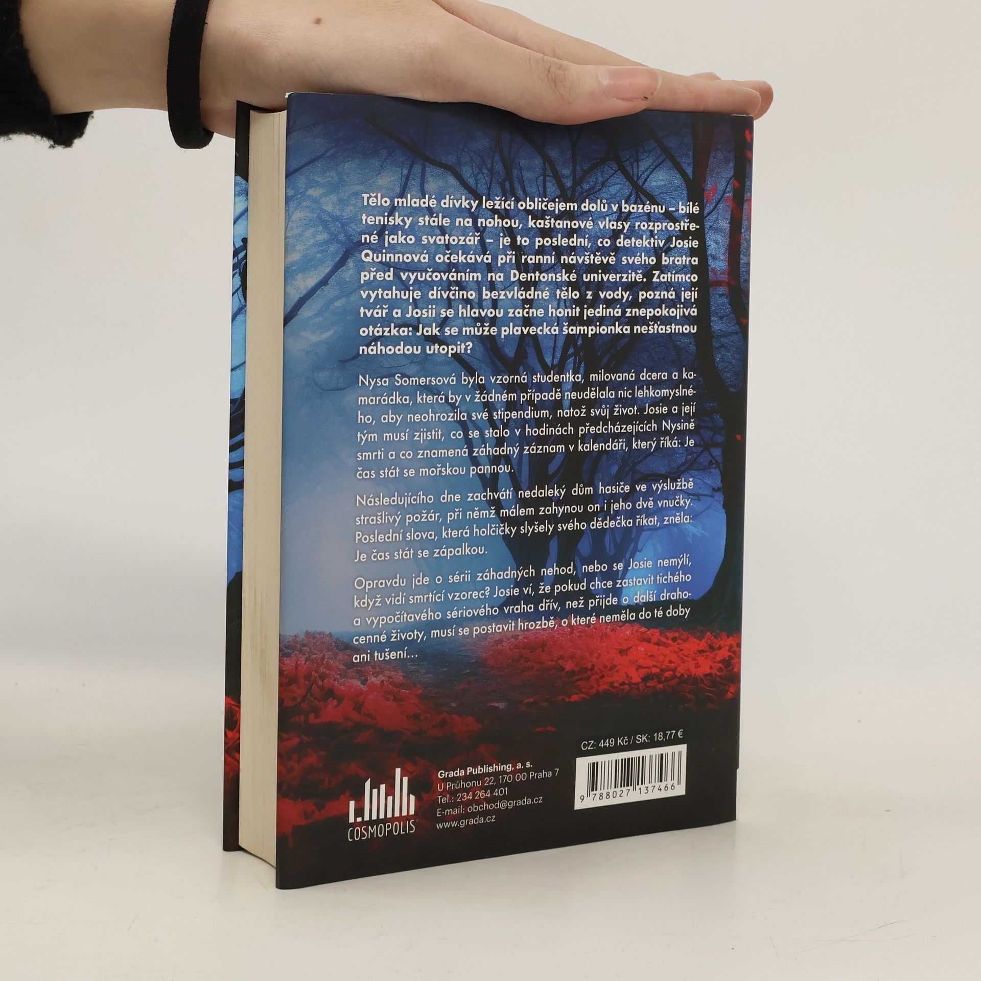 Tělo mladé dívky ležící obličejem dolů v bazénu je to poslední, co detektiv Josie Quinnová očekává při ranní návštěvě svého bratra na Dentonské univerzitě. Když však pozná dívčinu tvář, honí se Josii hlavou jediná otázka: Jak se může plavecká šampionka nešťastnou náhodou utopit? Následujícího dne zachvátí nedaleký dům hasiče ve výslužbě strašlivý požár, při němž málem zahyne on i jeho dvě vnučky. Opravdu jde o sérii záhadných úmrtí, nebo se Josie nemýlí, když vidí smrtící vzorec?