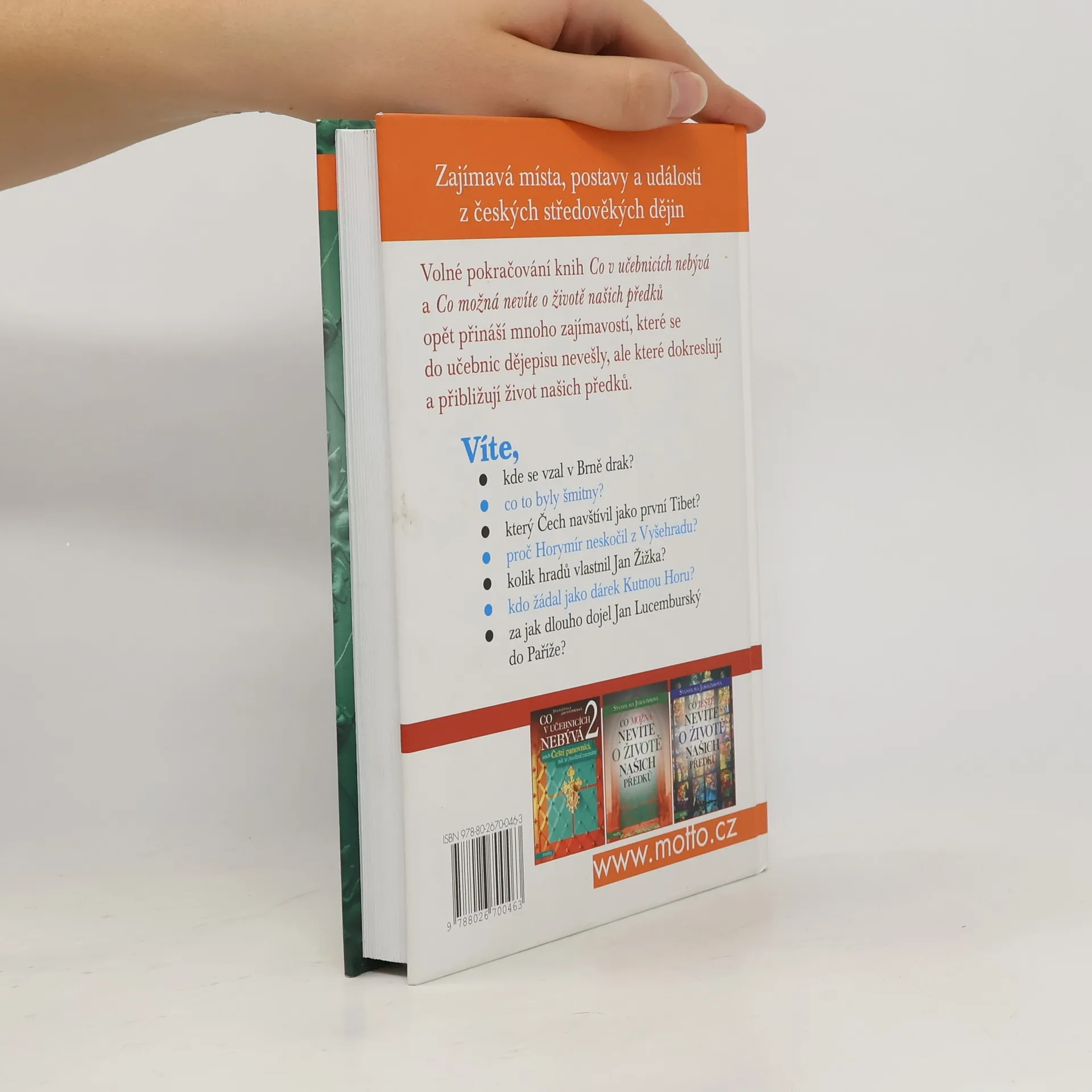 Zajímavá místa, postavy a události z českých středověkých dějin. Volné pokračování knih Co v učebnicích nebývá a Co možná nevíte o životě našich předků opět přináší mnoho zajímavostí, které se do učebnic dějepisu nevešly, ale které dokreslují a přibližují život našich předků. Víte, kde se vzal v Brně drak? co to byly šmitny? který Čech navštívil jako první Tibet? proč Horymír neskočil z Vyšehradu? kolik hradů vlastnil Jan Žižka? kdo žádal jako dárek Kutnou Horu? za jak dlouho dojel Jan Lucemburský do Paříže?
