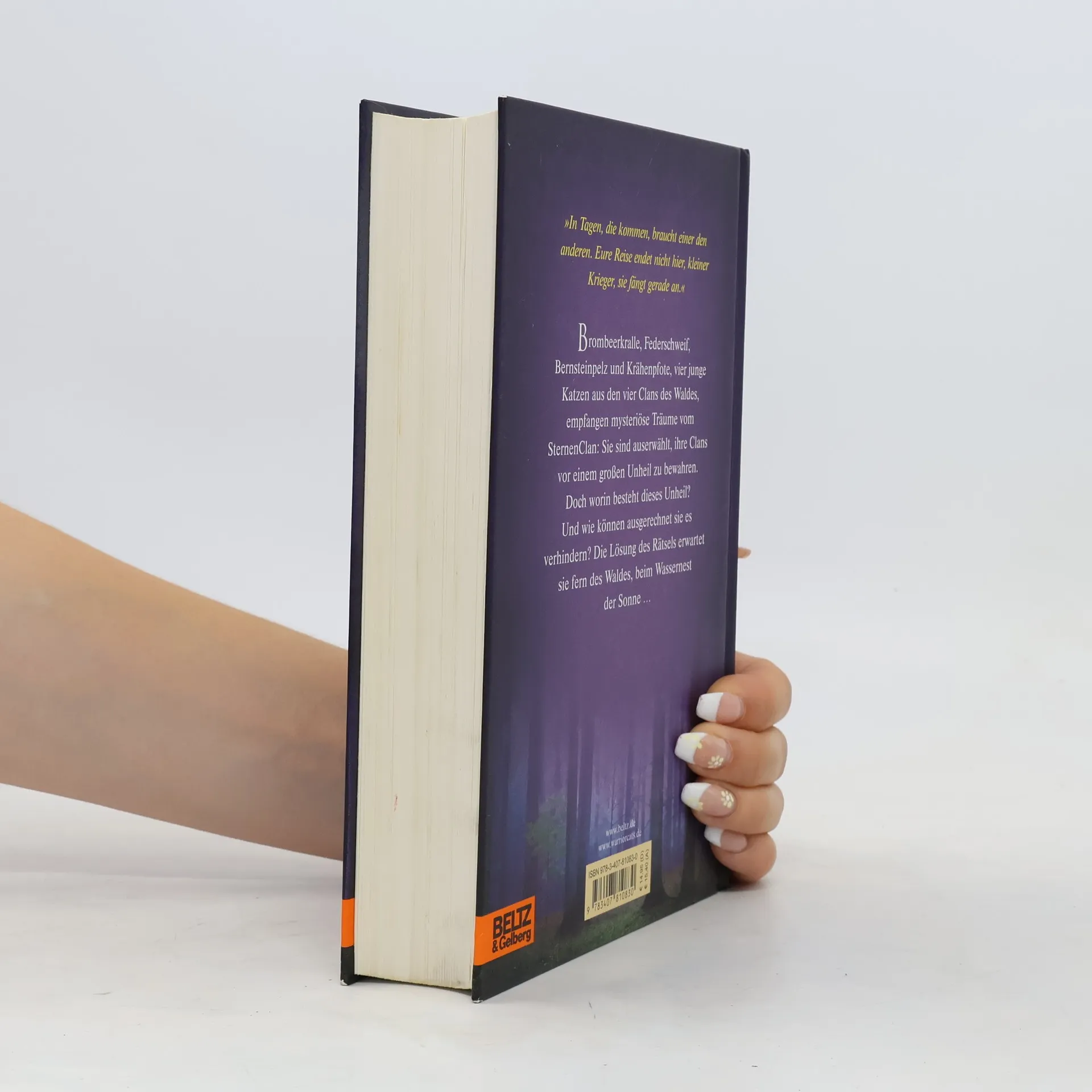 Die neue Prophezeiung: »Finsternis, Luft, Wasser und Himmel werden zusammentreffen... und den Wald bis in seine Wurzeln erschüttern.« »In Tagen, die kommen, braucht einer den anderen. Eure Reise endet nicht hier, kleiner Krieger, sie fängt gerade an.« Brombeerkralle, Federschweif, Bernsteinpelz und Krähenpfote, vier junge Katzen aus den vier Clans des Waldes empfangen mysteriöse Träume vom SternenClan: Sie sind auserwählt, ihre Clans vor einem großen Unheil zu bewahren. Doch worin besteht dieses Unheil? Und wie können ausgerechnet sie es verhindern? Die Lösung des Rätsels erwartet sie fern des Waldes, beim Wassernest der Sonne...