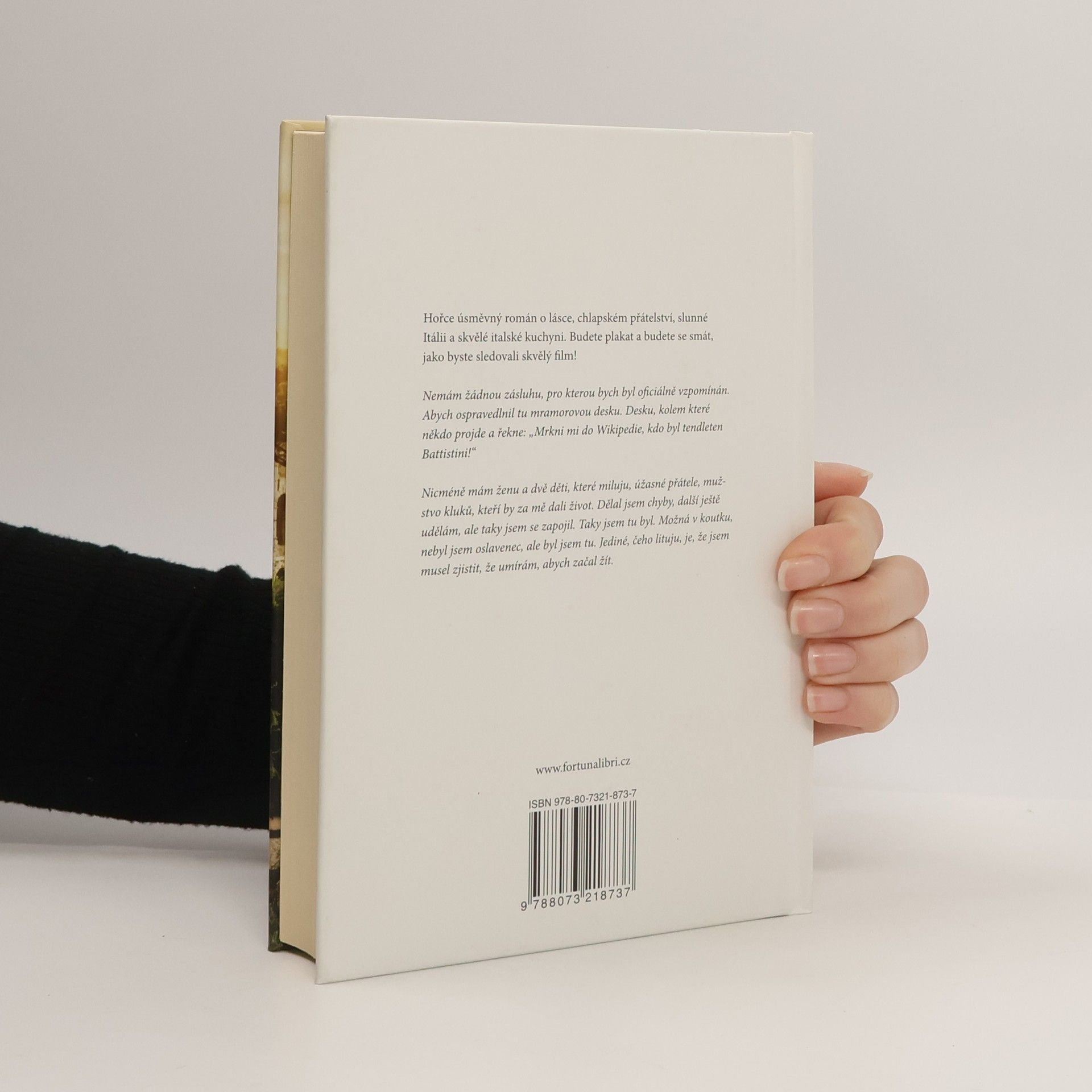 Hořce úsměvný román o lásce, chlapském přátelství, slunné Itálii a skvělé italské kuchyni. Budete plakat a budete se smát, jako byste sledovali skvělý film! Nemám žádnou zásluhu, pro kterou bych byl oficiálně vzpomínán. Abych ospravedlnil tu mramorovou desku. Desku, kolem které někdo projde a řekne: „Mrkni mi do Wikipedie, kdo byl tendleten Battistini!“ Nicméně mám ženu a dvě děti, které miluju, úžasné přátele, mužstvo kluků, kteří by za mě dali život. Dělal jsem chyby, další ještě udělám, ale taky jsem se zapojil. Taky jsem tu byl. Možná v koutku, nebyl jsem oslavenec, ale byl jsem tu. Jediné, čeho lituju, je, že jsem musel zjistit, že umírám, abych začal žít.